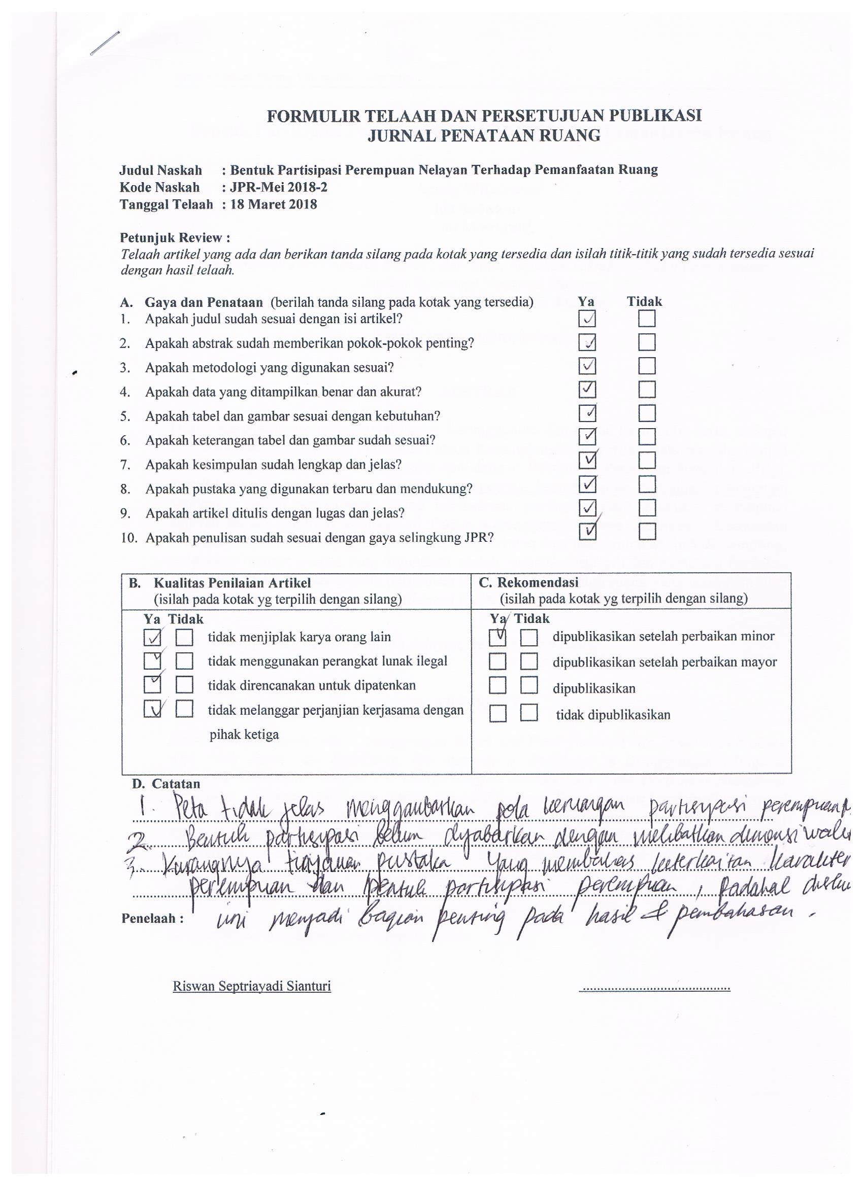 Sanitasi merupakan salah satu kriteria permasalahan permukiman kumuh di Kota Malang yang meliputi masalah persampahan, air limbah, dan drainase. Masalah tersebut tersebar di 5 Kecamatan di Kota Malang salah satunya adalah Kecamatan Lowokwaru. Berbagai penanganan telah dilakukan baik dari pemerintah maupun masyarakat untuk mengatasi masalah sanitasi di Kecamatan Lowokwaru diantaranya adalah penanganan sanitasi di RW 3 & RW 6 Kelurahan Dinoyo, RW 5 dan RW 7 Kelurahan Tlogomas, dan RW 9 Kelurahan Jatimulyo. Oleh karena itu, penelitian ini bertujuan untuk mengetahui konsep penanganan sanitasi di lokasi tersebut. Metode pengumpulan data yang digunakan dalam penelitian ini adalah observasi, wawancara, dan kuesioner. Metode analisa data yang digunakan adalah metode statistik deskriptif, metode skoring, dan metode klaster. Berdasarkan hasil analisa, ketersediaan prasarana sanitasi di lokasi penelitian masih kurang untuk prasarana persampahan yakni tempat sampah, sedangkan untuk prasarana limbah dan drainase sudah mencukupi. Untuk tingkat permasalahan, hanya RW 3 Kelurahan Dinoyo dan RW 7 Kelurahan Tlogomas yang berada pada level tinggi (baik), sedangkan RW 5 Kelurahan Tlogomas dan RW 9 Kelurahan Jatimulyo berada pada level rendah (buruk). Untuk konsep penanganan, terdapat 3 macam konsep yang diterapkan di lokasi penelitian yaitu percontohan, partisipatori, dan bantuan. Kesimpulan dalam penelitian ini adalah ketersediaan prasarana persampahan di lokasi penelitian masih kurang dan tidak adanya hubungan antara konsep penanganan sanitasi yang telah diterapkan dengan tingkat permasalahan sanitasi. Sanitation is one of the criteria of slum settlement problems in Malang City, covering the problem of solid waste, waste water, and drainage. The problem is spread in 5 sub-districts in Malang City, one of which is Lowokwaru Sub-district. Various handling has been done both from the government and society to solve sanitation problems in Lowokwaru Sub-district, including sanitation handling in RW 3 & RW 6 Dinoyo, RW 5 and RW 7 Tlogomas, and RW 9 Jatimulyo. Therefore, this study aims to find out the concept of sanitation handling in these locations. Data collection methods used in this study are observation, interviews, and questionnaires. Data analysis methods used are descriptive statistical methods, scoring methods, and cluster methods. Based on the results of the analysis, the availability of sanitation infrastructure at the research site is still lacking for solid waste infrastructure, namely the trash, while for waste and drainage infrastructure is sufficient. For the level of problem, only RW 3 Dinoyo and RW 7 Tlogomas are at a high level (good), while RW 5 Tlogomas and RW 9 Jatimulyo are at a low level. For the concept of handling, there are 3 types of concepts that are applied in the research location are pilot, participatory, and assistance. The conclusion in this study is the availability of solid waste infrastructure in the research location is still lacking and there is no relationship between the concept of sanitation handling that has been applied to the level of sanitation problems. Keywords : availability, consept of handling, level of problem, sanitation