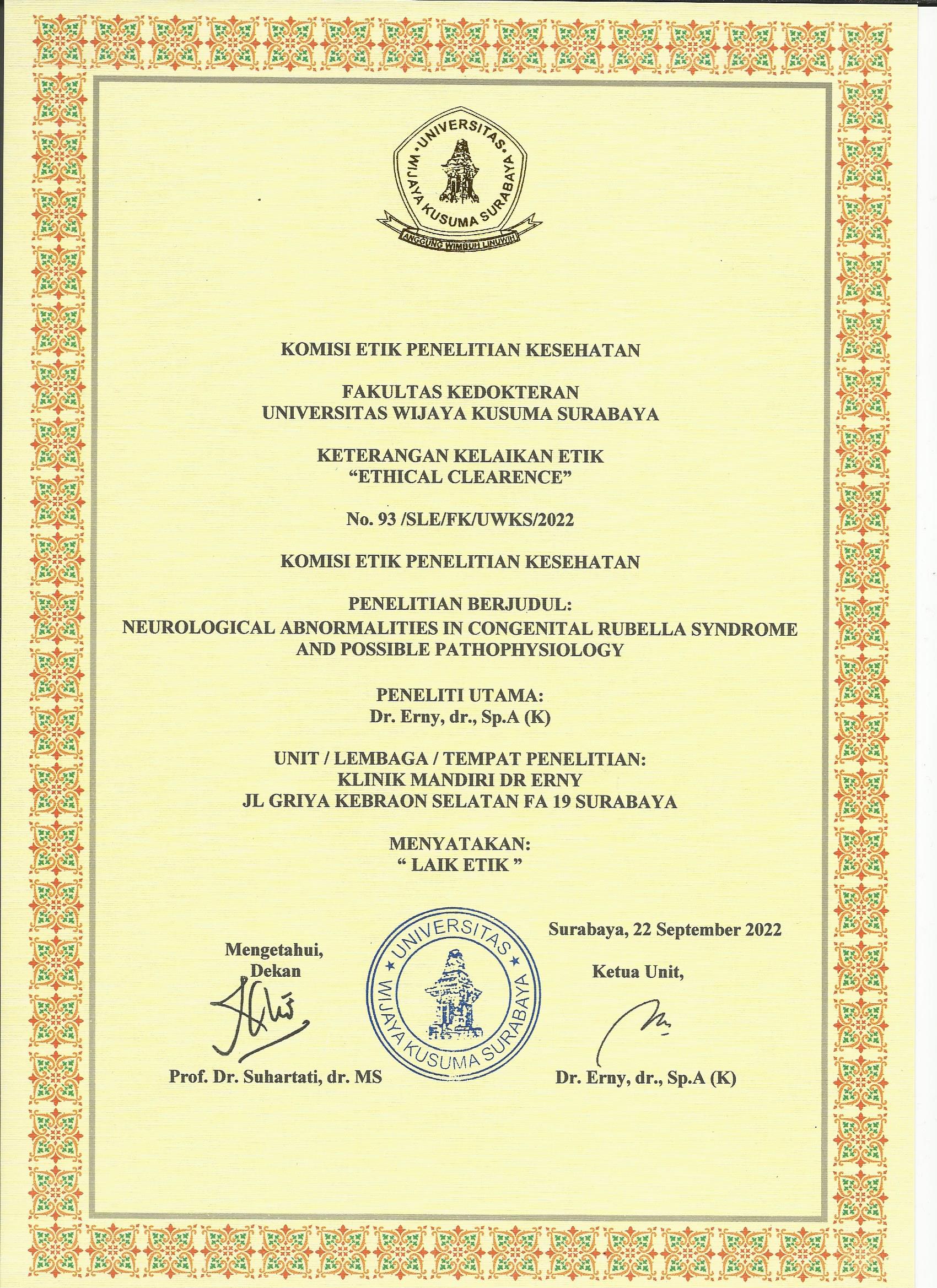 Background: Congenital rubella syndrome is a disease that is a relative severe health problem because it causes multiorgan disability. The purpose of the study was to describe the neurological abnormallities that occur in congenital rubella syndrome and its pathophysiology.Case Presentation: A descriptive study with the subjects of the study of infants and children with congenital rubella syndrome found in the private practice of pediatricians for 10 years aged 15 years with the most complaints of developmental and growth delays, recurrent seizures and behavioral disorders. most are first children with mothers without Measles, Mumps, and Rubella (MMR) vaccination. Inclusion criteria: infants and children with clinical manifestations of at least 2 of all major clinical signs (hearing loss, congenital cataracts and congenital heart defects) accompanied by evidence of infection in the form of rubellaspecific serum IgM and a history of the mother experiencing infection during pregnancy as evidenced by IgG results and or IgM rubella antibodies.Results: 13 cases were obtained, 92.3% of the case population with multiorgan disability and only 1 case (7.69%) with neurological disorders alone. 84.6% of cases of neurological disability occurred as a result of infection in the 1st trimester.Conclusion: Neurological abnormalities were acquired in the entire study population and were mostly due to infections in the 1st trimester of pregnancy.Keywords: neurological abnormalities, congenital rubella syndrome.Correspondence: Erny. Pediatric Department Medical Faculty Wijayakusuma University. Jl. Dukuh Kupang XXV no 54 Surabaya, East Java, Indonesia. Email: drernyspa@gmail.com. Mobile: 0818381740.Indonesian Journal of Medicine (2022), 07(04): 449-455https://doi.org/10.26911/theijmed.2022.07.04.10