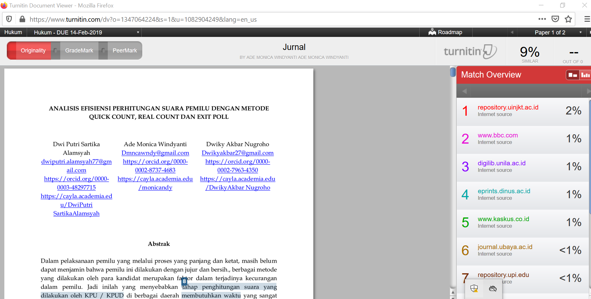 AbstractIn the implementation of elections that go through a long and rigorous process, it still cannot guarantee that this election is conducted honestly and cleanly. So this is what causes the vote counting stage carrued out by the KPU/KPUD in various regions requires a very long time. The vote count in Indonesia is not only a quick count, one way to recapitulate during the election, but there is a real count and exit poll aslo a way to count the results of the vote. However, of the three types of recapitulation, there are several differences including the method used and the source of data obtained. As a result of this difference, in the percentage information that would implu uncertain information for the public who want to know about the vote count so as to reduce public confidence in the election process going forward. The method used in this study is an empirical research method that is analysing problem data and looking for information directly or using interview methods to complete the data in this study. This research is expected to produce a concrete analysis of three for calculating votes that are more efficient, precise and systematic in notification of information. Keyword: efficiency; incorrect information; three methods of counting votes AbstrakDalam pelaksanaan pemilu yang melalui proses yang panjang dan ketat, masih belum dapat menjamin bahwa pemilu ini dilakukan dengan jujur dan bersih., berbagai metode yang dilakukan oleh para kandidat merupakan faktor dalam terjadinya kecurangan dalam pemilu. Jadi inilah yang menyebabkan proses penghitungan suara yang dilakukan oleh masing-masing KPU/KPUD di berbagai daerah membutuhkan jangka waktu yang sangat lama. Penghitungan suara yang ada di Indonesia tidak hanya penghitungan cepat, salah satu cara untuk melakukan rekapitulasi selama pemilihan, tetapi ada penghitungan riil dan exit poll juga cara untuk menghitung hasil pemungutan suara. Namun, dari ketiga jenis rekapitulasi tersebut, ada beberapa perbedaan, termasuk metode yang digunakan dan sumber data yang diperoleh. Sebagai akibat dari perbedaan ini, dalam informasi persentase tersebut yang akan menyiratkan informasi tidak pasti bagi publik yang ingin tahu tentang perhitungan suara sehingga dapat menurunkan kepercayaan masyarakat dalam proses pemilu kedepan. Metode yang digunakan dalam penelitian ini adalah metode penelitian empiris yaitu mengkaji data permasalahan dan mencari informasi secara langsung atau menggunakan metode wawancara untuk melengkapi data dalam penelitian ini. Penelitian ini diharapkan dapat menghasilkan analisis konkret dari tiga metode untuk menghitung suara yang lebih efisien, tepat dan sistematis dalam pemberitahuan informasi.Kata kunci: efisiensi; informasi; tiga cara perhitungan suara