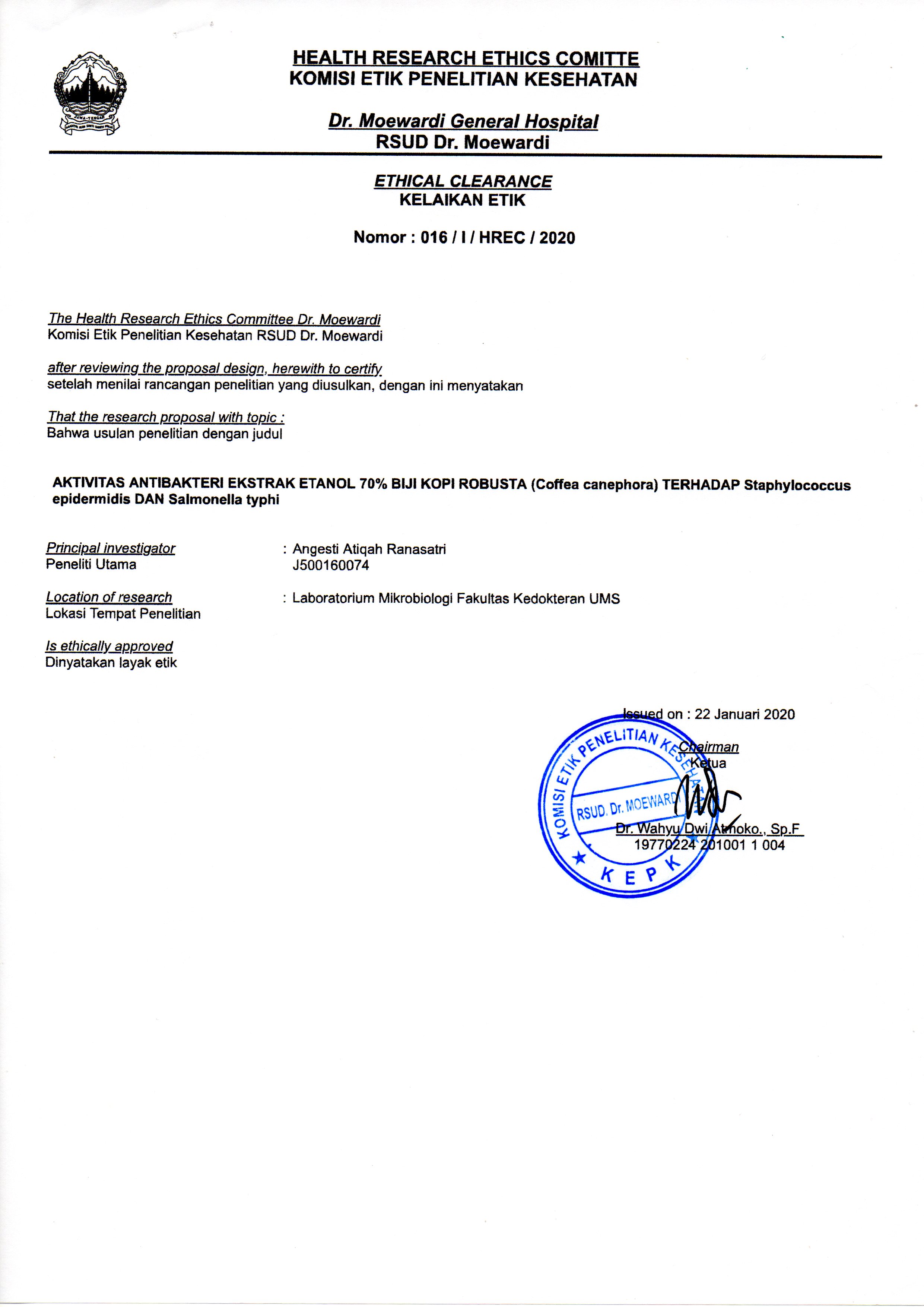 ABSTRAKKomponen kafein, asam organik volatil, non volatil, fenol, dan senyawa aromatik dalam ekstrak biji kopi telah diketahui memiliki efek antimikroba terhadap bakteri Gram positif dan negatif. Bakteri yang sering menyebabkan infeksi diantaranya Staphylococcus epidermidis dan Salmonella typhi. Penelitian ini bertujuan mengetahui aktivitas antibakteri ekstrak etanol 70% biji kopi robusta (Coffea canephora) terhadap Staphylococcus epidermidis dan Salmonella typhi. Penelitian ini merupakan eksperimental laboratorium dengan metode post test only controlled group design. Metode yang digunakan adalah metode difusi agar (disc diffusion Kirby and Bauer). Sampel dibagi menjadi 6 kelompok, yaitu kontrol (+) tetrasiklin/kloramfenikol, kontrol (-) aquades, kelompok perlakuan ekstrak biji kopi robusta berbagai konsentrasi P1=3,125%, P2=6,25%, P3=12,5% dan P4=25% dengan 4 pengulangan sesuai rumus Federer. Analisis data menggunakan uji Kruskal Wallis dan uji Mann-Whitney. Hasil penelitian untuk uji Kruskal Wallis terhadap kedua bakteri didapatkan p=0,001. Hasil uji Mann-Whitney terhadap kedua bakteri didapatkan p kelompok kontrol (-) dibandingkan semua kelompok perlakuan p0,05 yang berarti ekstrak biji kopi robusta memiliki aktivitas menghambat pertumbuhan bakteri. Sehingga dapat disimpulkan bahwa ekstrak biji kopi robusta memiliki aktivitas antibakteri terhadap Staphylococcus epidermidis dan Salmonella typhi pada konsentrasi 3,125%, 6,25%, 12,5%, dan 25%. Kata Kunci: Kopi Robusta, Antibakteri, Staphylococcus epidermidis, Salmonella typhi ABSTRACTCaffeine, organic volatile acids, non volatile, phenol, aromatic compounds in coffee bean extract has been known to have antismicrobial effects on Gram positive and negative bacteria. Bacteria that often cause infections are Staphylococcus epidermidis and Salmonella typhi. This study aimed to determine the antibacterial activity of 70% ethanol extract of robusta (Coffea canephora) coffee beans against Staphylococcus epidermidis and Salmonella typhi. This research is an experimental laboratory with a post test only controlled group design method. Samples were divided into 6 groups, (+) control tetracycline/chloramphenicol, (-) control aquades, robusta coffee bean extract treatment groups with various concentrations of P1=3.125%, P2=6.25%, P3=12.5% and P4=25% with 4 repetitions according to the Federer formula. Data analysis used the Kruskal Wallis test and the Mann-Whitney test. The results of the study for the Kruskal Wallis test on both bacteria obtained p=0.001. Mann-Whitney test results on the two bacteria obtained p control group (-) compared to all treatment groups p0.05, which means robusta coffee bean extract has an activity that inhibits bacterial growth. This study concluded robusta coffee bean extract has antibacterial activity against Staphylococcus epidermidis and Salmonella typhi at 3,125%, 6,25%, 12,5%, dan 25% concentrations. Keywords: Robusta Coffee, Antibacterial, Staphylococcus epidermidis, Salmonella typhi