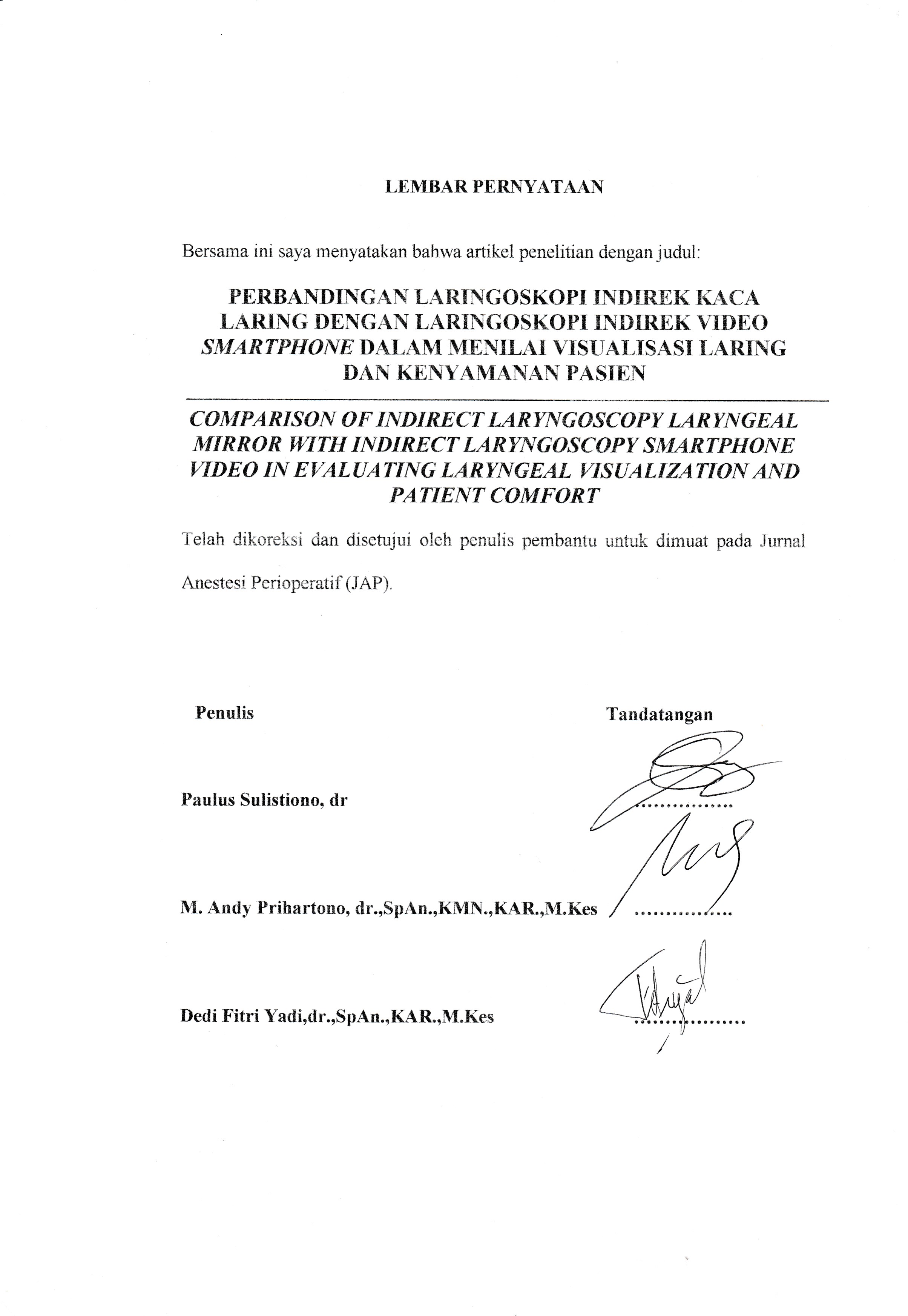 Salah satu pemeriksaan preoperatif yang dapat digunakan sebagai prediktor kesulitan intubasi adalah laringoskopi indirek. Penelitian ini bertujuan menilai visualisasi laring dan kenyamanan pasien antara laringoskopi indirek kaca laring dan laringoskopi indirek video smartphone. Penelitian menggunakan metode prospective randomized parallel trial, dilakukan di Rumah Sakit Dr. Hasan Sadikin (RSHS) Bandung pada bulan November–Desember 2017. Pasien dibagi menjadi kelompok laringoskopi indirek kaca laring (kelompok LIKL, n=22) dan kelompok laringoskopi indirek video smartphone (kelompok LIVS, n=22). Uji statistik menggunakan Uji Mann-Whitney. Hasil penelitian mengungkapkan visualisasi laring lebih jelas pada kelompok LIVS (1,73 SD±0,77) dibanding dengan kelompok LIKL (2,50 SD±0,86) dengan perbedaan signifikan (p<0,05). Kenyamanan yang lebih baik pada kelompok LIVS (skala di atas 5) dibanding dengan kelompok LIKL (skala di atas 5) dengan perbedaan signifikan (p<0,05). Simpulan penelitian ini adalah visualisasi laring dan kenyamanan pasien pada laringoskopi indirek dengan video smartphone lebih baik bila dibanding dengan laringoskopi indirek kaca laring.Kata kunci: Kaca laring, kesulitan intubasi, laringoskopi indirek, video smartphone Comparison between Indirect Laryngoscopy Laryngeal Mirror and Indirect Laryngoscopy Smartphone Video in Evaluating Laryngeal Visualization and Patient ComfortIndirect laryngoscopy is an examination modality which can be performed during pre-operative phase as a predictor of difficult intubation. The purpose of this study was to compare indirect laryngoscopy using laryngeal mirror and indirect laryngoscopy using smartphone video in evaluating laryngeal visualization and providing convenience to patients during the examination procedure. This prospective randomized parallel trial was conducted at Dr. Hasan Sadikin General Hospital Bandung from November to December 2017. Patients were assigned to two study groups: those who underwent indirect laryngoscopy using laryngeal mirror (LIKL group, n=22) and those who underwent indirect laryngoscopy using smartphone video (LIVS group, n=22). Mann-Whitney test was utilized as the statistical test method. Result of this study showed that laryngeal visualization was significantly superior in LIVS group compared to LIKL group (1.73 SD±0.77 vs 2.50 SD±0.86, respectively, p value<0.05). Patient comfort was significantly superior in LIVS group compared to LIKL group (comfort score above 5 vs comfort score above 5, respectively, p value <0.05). Therefore, it is concluded that laryngeal visualization using indirect langryngoscopy with smartphone video is more comfortable than the one that uses direct laryngoscopy with laryngeal mirror.Key words: Difficult intubation, indirect laryngoscopy, laryngeal mirror, smartphone video
