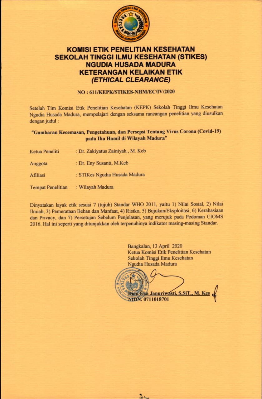 The 2019 coronavirus pandemic has been recognized as a trigger for anxiety, especially in pregnant women. Pregnant women are among those with a high-risk for contracting coronavirus, not only for themselves but also for the unborn child. Continuous information is needed for pregnant women to avoid anxiety because anxiety will result in complications for both mother and child, such as low birth weight baby and postpartum psychological disorder. The purpose of this study was to identify the prevalence of anxiety in pregnant women during the Coronavirus pandemic in Madura, East Java, Indonesia. This study was a cross-sectional descriptive study conducted from April 13 to May 8, 2020. Data were collected using a Google form distributed to all pregnant women in the Madura Region based on the list of pregnant women from the midwives in each city in this region. Seventy pregnant women returned the completed form, and data were analyzed using frequency tables and percentages. Results showed that 31.4% of pregnant women experienced very severe anxiety, 12.9% experienced severe anxiety, and the remainings did not experience anxiety. In conclusion, the coronavirus pandemic indeed increases anxiety in pregnant women which will need to be addressed to avoid negative impacts on the mother and unborn child. Counseling is needed to reduce anxiety by asking the women to stay at home, wash their hands, wear masks, eat nutritious food, have their pregnancy checked, perform exercise for pregnant women at home, and seek for help when facing emergencies. Tingkat Kecemasan Ibu Hamil pada Masa Pandemi Viruscorona (Covid-19) di Jawa Timur, Indonesia Pandemi virus corona 2019 ini menyebabkan kecemasan, terutama pada ibu hamil, karena ibu hamil merupakan kelompok risiko tinggi untuk tertular virus corona, terutama pada janin yang dikandungnya, sehingga diperlukan informasi secara terus menerus kepada ibu hamil supaya tidak terjadi kecemasan, karena kecemasan ini akan berakibat komplikasi pada ibu dan janinnya. Dampak kecemasan pada ibu hamil dan janin adalah Berat Badan Lahir Rendah dan gangguan psikologis pada ibu setelah melahirkan. Tujuan penelitian ini mengidentifikasi tingkat kecemasan ibu hamil di masa pandemi virus Corona di wilayah Madura, Jawa Timur. Penelitian ini dilakukan tanggal 13 April sampai dengan 8 Mei 2020 dan merupakan penelitian desktriptif dengan menggunakan google form yang disebarkan ke seluruh ibu hamil di Wilayah Madura melalui bidan yang ditunjuk setiap kota yang ada di Madura. Tujuh puluh ibu hamil mengembalikan formulir yang telah diisi dan data dianalisis menggunakan tabel frekuensi dan persentase. Hasil penelitian menunjukkan bahwa 31.4% mengalami kecemasan sangat berat, 12.9% mengalami kecemasan berat, dan sisanya ibu tidak mengalami kecemasan atau dalam keadaan normal. Simpulan, pandemi virus corona memang meningkatkan kecemasan pada ibu hamil yang perlu diatasi untuk menghindari dampak negatif pada ibu dan janinnya. Konseling diperlukan untuk mengurangi kecemasan dengan meminta ibu-ibu untuk tinggal di rumah, mencuci tangan, memakai masker, makan makanan bergizi, memeriksakan kehamilannya, melakukan senam ibu hamil di rumah, dan mencari pertolongan saat menghadapi keadaan darurat.