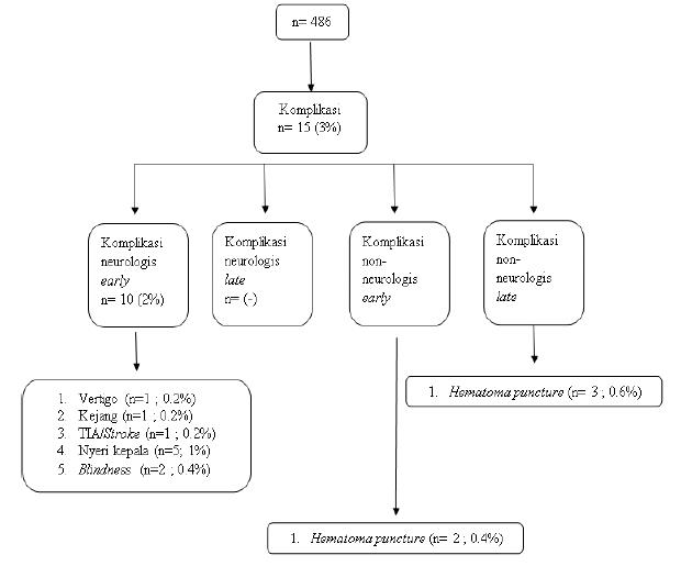 Pendahuluan: Digital subtraction angiography (DSA) serebral menjadi gold standard untuk memeriksa penderita dengan gangguan serebrovaskular. Banyak kemajuan yang telah diperoleh untuk meningkatkan keamanan penggunaan DSA serebral, seperti kontras yang lebih aman, kateter yang lebih kecil, kawat (hydrophilic guides), dan sistem pengamatan digital yang semakin baik. Hingga saat ini, belum ada penelitian terkait komplikasi neurologis maupun non-neurologis dari prosedur DSA yang dilakukan di Indonesia. Tujuan penelitian ini adalah mengetahui berbagai komplikasi prosedur DSA, sehingga operator dapat meminimalisasi timbulnya komplikasi tersebut saat prosedur DSA dilakukan di kemudian hari.Metode penelitian: Penelitian deskriptif dilakukan di RSUD Dr. Moewardi terhadap 486 pasien yang menjalani prosedur DSA. Data yang dikumpulkan meliputi umur, jenis kelamin, komplikasi, serta temuan angiografi. Komplikasi neurologis dan non neurologis dikelompokkan menjadi: early, yang akan menghilang kurang dari 7 hari dan late, bila komplikasi terjadi lebih dari 7 hari. Kriteria inklusi pada penelitian ini adalah semua pasien yang menjalani prosedur DSA di RSUD. Dr. Moewardi periode Juni 2013 hingga Mei 2018 dan pasien yang mengalami komplikasi neurologis dan non-neurologis.Hasil penelitian: Terdapat 15 (3%) dari 486 pasien yang menjalani prosedur DSA serebral mengalami komplikasi. Komplikasi neurologis early terjadi pada 10 kasus (2%), dan tidak didapatkan komplikasi pada tipe late, sedangkan komplikasi non-neurologis early terjadi pada 2 kasus (0.4%), dan late pada 3 kasus (0.6%). Kejadian ini sebanding dengan penelitian yang dilakukan oleh studi internasional lainnya.Kesimpulan: Prosedur DSA serebral relatif aman, baik dalam hal komplikasi neurologis, komplikasi non-neurologis maupun terjadinya kematian. Komplikasi neurologis yang terjadi masih dalam batas yang direkomendasikan sesuai dengan petunjuk keamanan untuk melakukan DSA serebral.Kata kunci: Angiografi serebral; keamanan; komplikasi