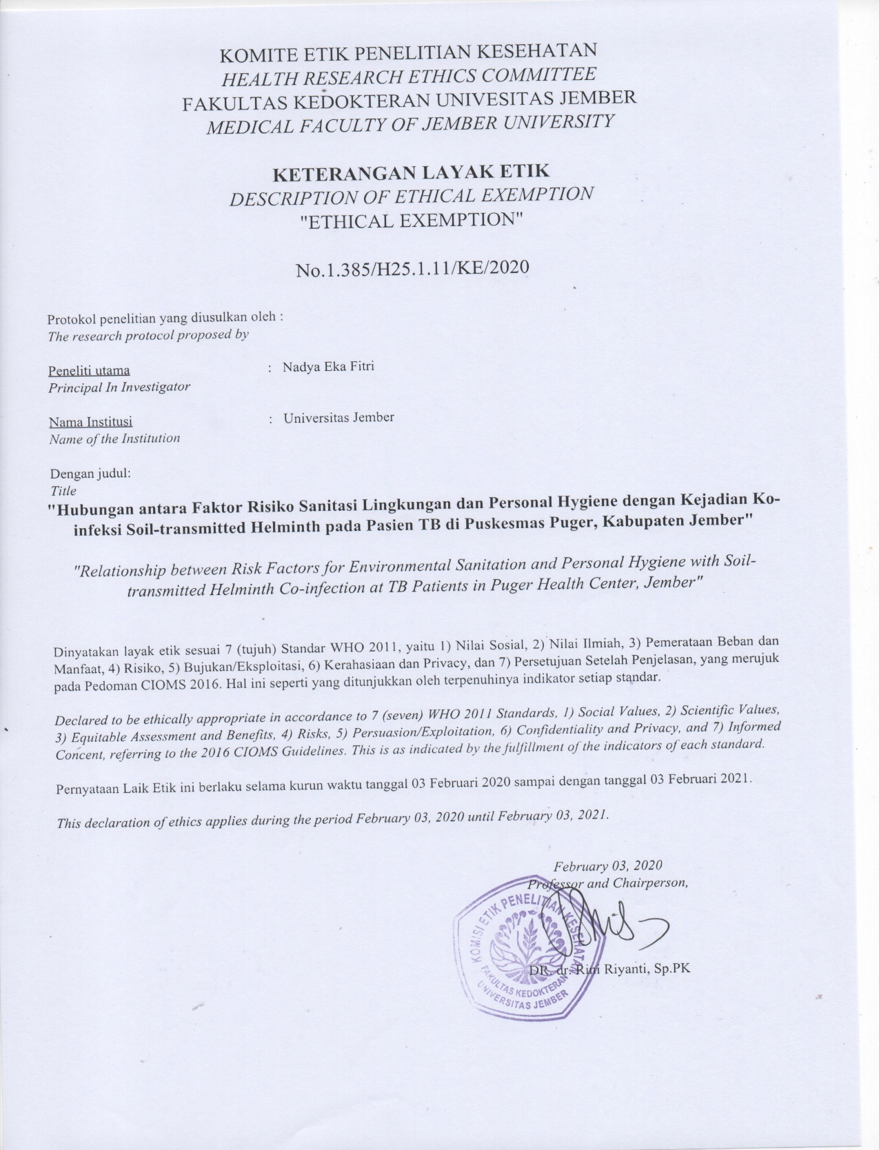 Role of Pili Protein 11 kDa of Streptococcus pneumoniae as Hemagglutinin and Adhesin Protein Streptococcus pneumoniae has pili which play roles in adhesion, colonization of nasopharyngeal epithelial cells, and phagocytic inhibition of immune cells. This study aimed to determine the characteristics of the 11 kDa pili protein as hemagglutinin and adhesin, as well as their immune responses. The 11 kDa pili protein from S. pneumoniae was isolated by SDS-PAGE, purified by electroelution and dialysis. Hemagglutination and adhesion tests were carried out on the protein, and western blotting of the polyclonal antibody immune responses were evaluated. Hemagglutination test showed that the 11 kDa pili protein played a role in the hemagglutination process up to 2-time dilution. Adhesion test showed there was a correlation between the dose of the protein and the bacteria attached to the epithelial cells. The Pearson correlation test showed a P value of 0.010 and a correlation coefficient of R = -90.919. Quadratic regression test produced R2 = 0.974. Western blotting test showed that 11 kDa pili protein polyclonal antibodies recognized 67 kDa and 11 kDa pili proteins. The study concluded that the 11 kDa S. pneumoniae pili protein acted as hemagglutinin and adhesin, and the polyclonal antibody protein responded to 67 pDa and 11 kDa BM pili proteins.Keywords: adhesin, hemagglutinin, pili, protein 11 kDa, Streptococcus pneumoniae ABSTRAKStreptococcus pneumoniae memiliki pili yang berperan dalam adhesi, kolonisasi sel epitel nasofaring, serta sebagai inhibitor fagositosis sel imun. Penelitian ini bertujuan mengetahui karakteristik protein pili 11 kDa sebagai hemagglutinin dan adhesin serta respons imunnya. Protein pili 11 kDa dari bakteri S. pneumoniae diisolasi secara SDS-PAGE, dipurifikasi dengan elektroelusi dan dialysis. Uji hemaglutinasi dan adhesi dilakukan pada protein tersebut, serta dievaluasi respon imun poliklonal antibodinya secara western blotting. Uji hemaglutinasi menunjukkan protein pili 11 kDa berperan dalam proses hemaglutinasi hingga pengenceran 2 kali. Uji adhesi menunjukkan korelasi antara dosis protein dan bakteri yang menempel pada sel epitel. Uji korelasi Pearson menunjukkan P value 0,010 dan koefisien korelasi R = -0,919. Uji regresi Quadratic menghasilkan R2 = 0,974. Uji Western blotting menunjukkan antibodi poliklonal protein pili 11 kDa mengenali protein pili 67 kDa dan 11 kDa. Penelitian ini berkesimpulan protein pili 11 kDa S. pneumoniae berperan sebagai hemaglutinin dan adhesin, serta antibodi poliklonal protein tersebut memberi respons terhadap protein pili BM 67 kDa dan 11 kDa.ÂÂ