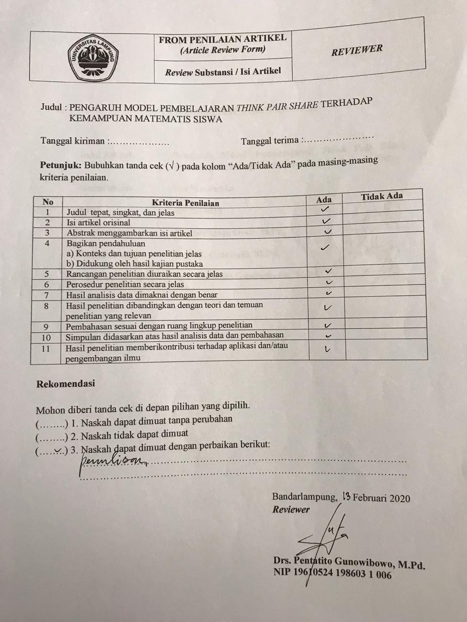 This research aimed to know the effectiveness of the cooperative type Think Talk Write in terms of studentsconceptual understanding of mathematics. The population of this research was all students of grade seventh in Junior High School 2 Seputih Mataram in academic year of 2016/2017 that were distributed into 7 classes. The samples of this research were students of VII-A and VII-D class which were chosen by purposive sampling. This research used posttest only control group design. Analysis data of the research used t-test. Based on the result of this research, it was concluded that think talk write wasnt effective in terms of studentsconceptual understanding of mathematics.Penelitian ini bertujuan untuk mengetahui efektivitas model pembelajaran kooperatif tipe think talk write ditinjau dari pemahaman konsep matematis siswa. Populasi penelitian ini adalah seluruh siswa kelas VII SMP Negeri 2 Seputih Mataram tahun pelajaran 2016/2017 yang terdistribusi dalam 7 kelas. Sampel penelitian ini adalah siswa kelas VII-A dan VII-D yang dipilih dengan teknik purposive sampling. Penelitian ini menggunakan desain posttest only control group design. Analisis data penelitian ini menggunakan uji-t. Bedasarkan hasil penelitian, diperoleh kesimpulan bahwa model pembelajaran tipe think talk write tidak efektif ditinjau dari pemahaman konsep matematis siswa.Kata kunci: efektivitas, pemahaman konsep matematis, think talk write