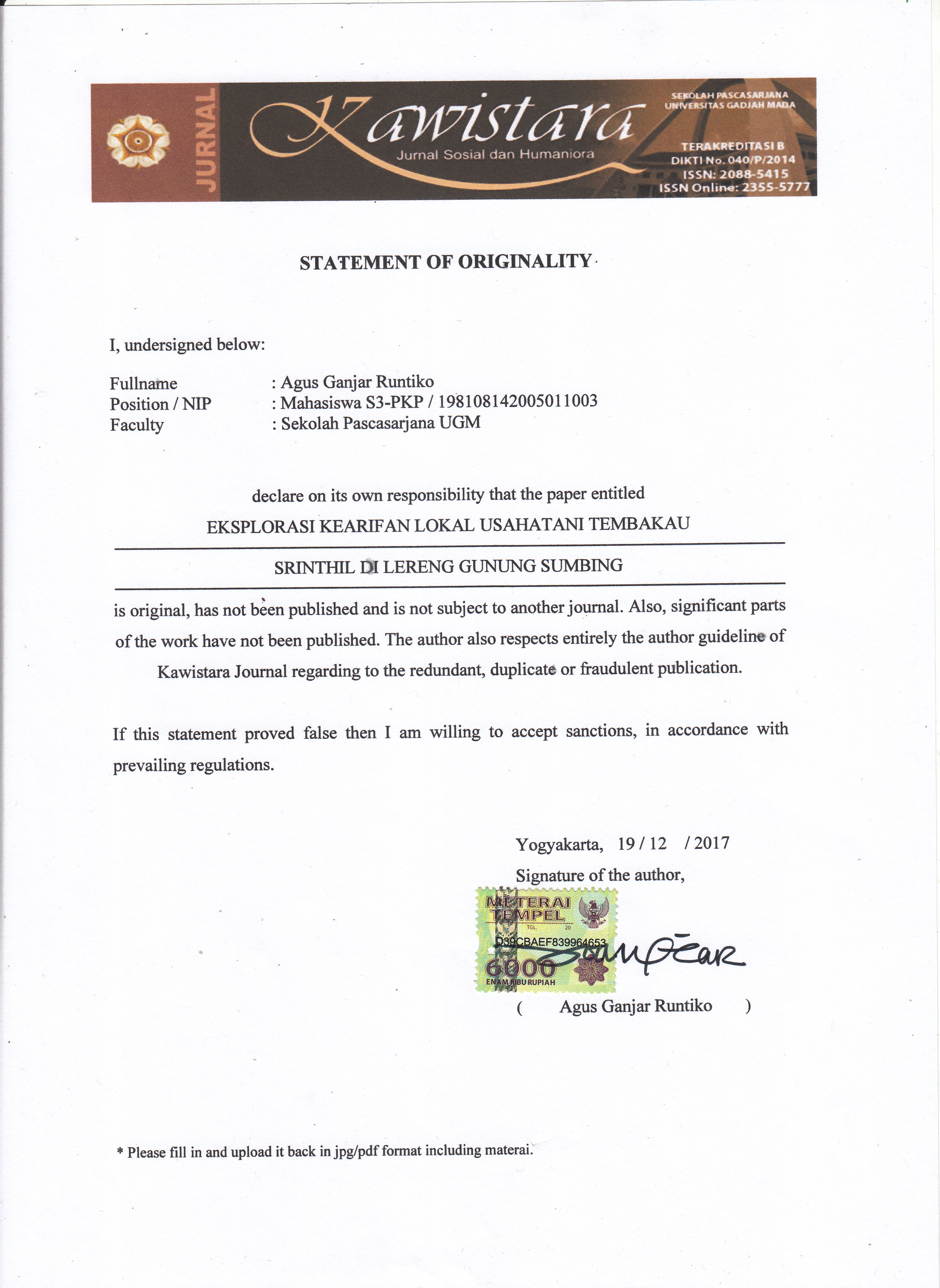 Srinthil is the name of the high quality tobacco commodity in Temanggung District. The quality of Srinthil tobacco is indicated by the higher price compared to other tobacco. Nevertheless, the emergence of Srinthil tobacco is unpredictable. Tobacco farmers believe that the emergence of Srinthil is influenced by at least four factors; siti (land), wiji (seeds), wanci (time), and wahyu (luck). The four factors considered influencing the emergence of Srinthil tobacco are sought by farmers. Tobacco farmer’s effort to produce Srinthil resulting a variety of local wisdom. This study aims to describe the local wisdom constructed, believed, and practiced traditionally by tobacco farmers on the slopes of Mount Sumbing, Temanggung District. The method used in this study is qualitative with the case study approach, which focuses on the local wisdom of Srinthil tobacco farming. The study was conducted in Legoksari Village, Tlogomulyo sub-District in July-September 2017. Data collection was carried out by conducting in- depth interviews and focus group discussions on 15 farmers, as well as five traditional leaders and village officials, participatory observation, and secondary data searches. The results showed that the local wisdom of tobacco farming consisted of three main categories: traditional rituals, house design, and work ethic. Aside from being an effort to search for Srinthil, the local wisdom of tobacco farming also serves as a medium for intergenerational value transmission, means of prayer to God, preservation of nature/environment, and maintenance of social cohesion.