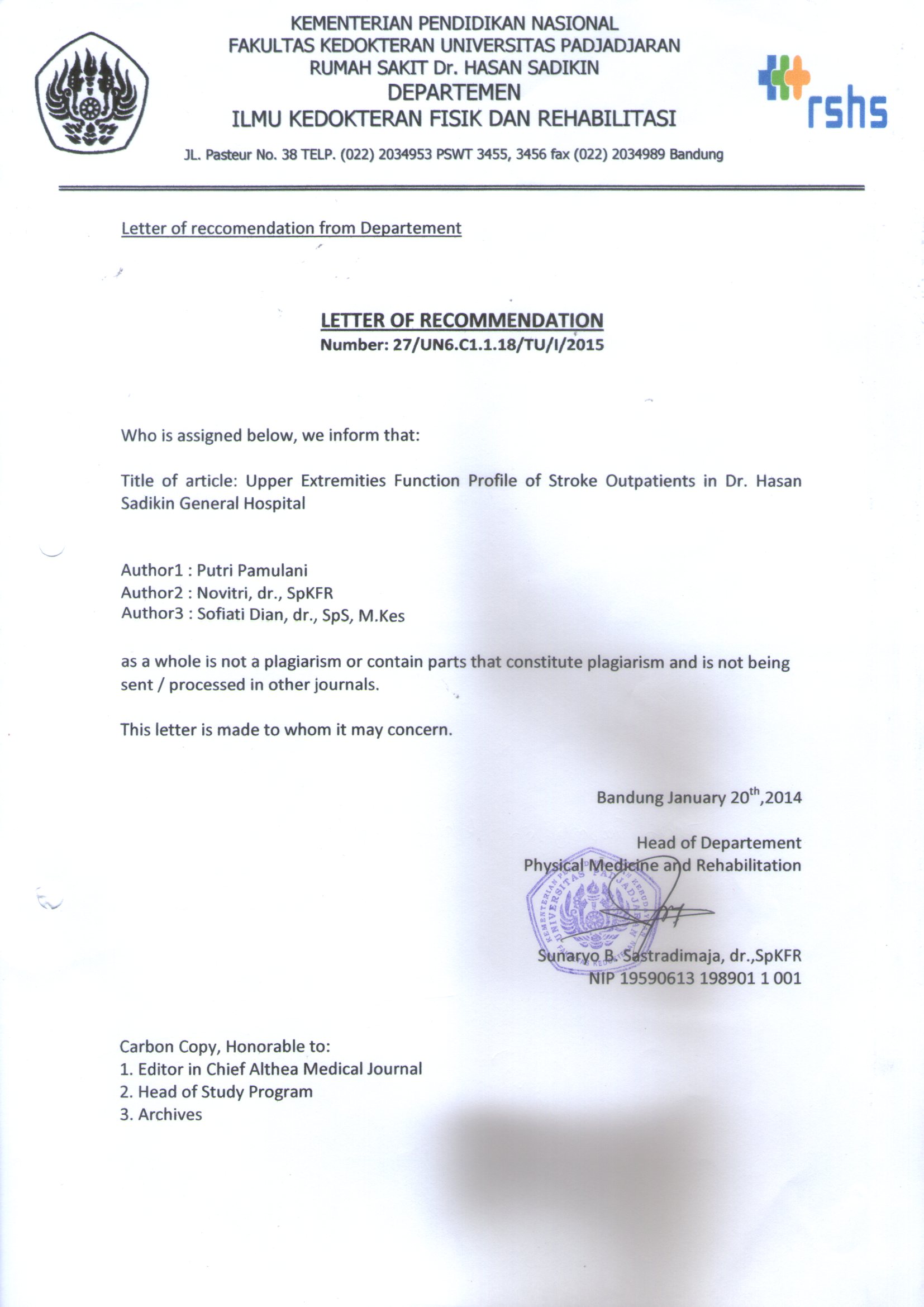 Profile of Upper Extremities Function among Stroke Outpatients in Dr. Hasan Sadikin General Hospital, Bandung