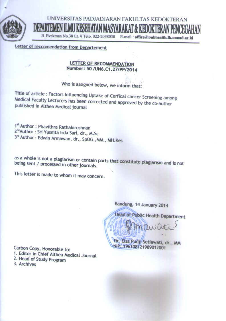 Background: Cancer is the leading cause of death worldwide. In Indonesia, cervical cancer is one of the most occurring types of cancer. It is acknowledged that early screening can prevent cervical cancer. This study aimed to explore what factors influenced the screening uptake and to correlate characteristics, perceived susceptibility, and self-efficacy of Pap smear uptake among medical faculty lecturers.Methods: This was a cross-sectional analytical study conducted among female lecturers in the Faculty of Medicine, Universitas Padjadjaran from October to November 2013. The questionnaire was used to collect data using a purposive sampling method. Data collected were tabulated into frequency and percentage and the correlation was performed using Pearson chi-square. Results: From a total of 79 respondents who participated, only 55.7% of medical lecturers had ever taken Pap smear. Reasons for not taking Pap smear were time (77.1%) and the perception of not being at risk (22.9%). However, most of the respondents (84.8%) were willing to have a screening test for cervical cancer routinely. There was a significant correlation between age (p=0.001), level of education (p=0.003) and duration of marriage (p=0.001) with the uptake of Pap smear.Conclusions: The factors that are influencing the uptake of screening are not having the time to take the test and the perception of not being at risk of the disease. There is a correlation between age, level of education and duration of marriage with screening uptake. Awareness of the importance of screening should also be promoted among female doctors.