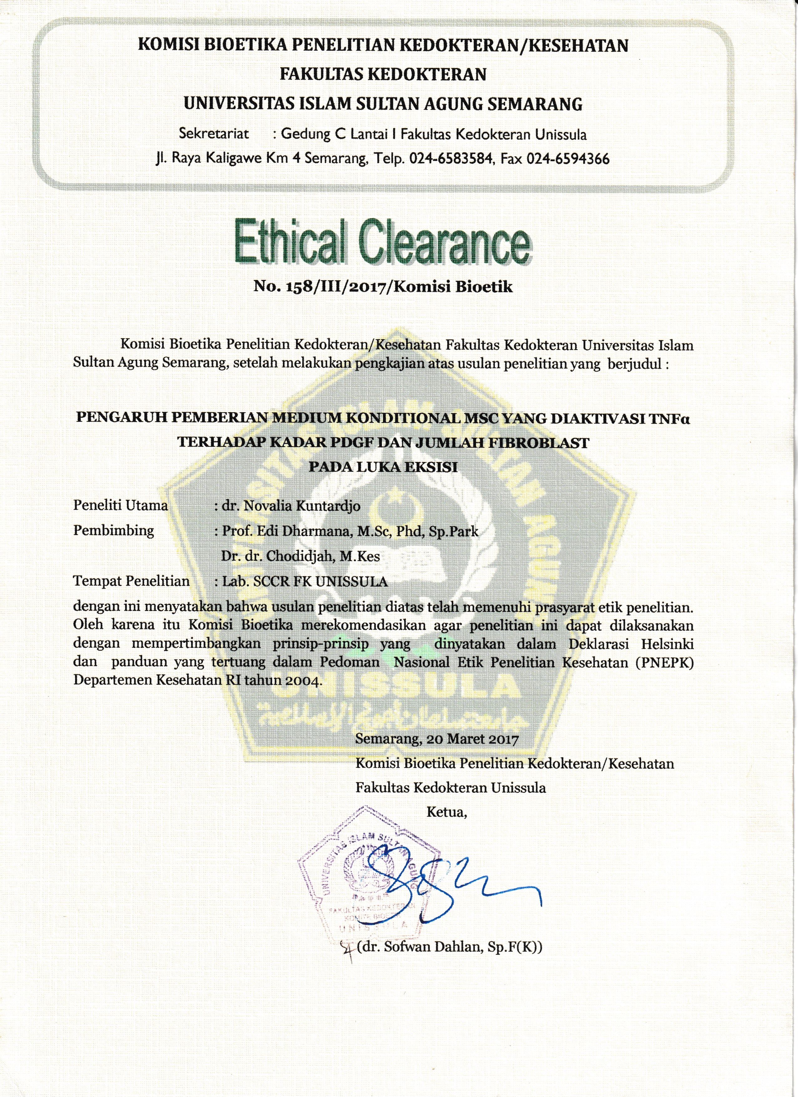 Mesenchymal stem cells (MSCs) are multipotent stromal cells that have the capacity to regenerate tissue damage. However, they have several limitations. MSC-CM as a new approach treatment is widely used to solve the limitation of MSC in wound healing. The aim of this study was to evaluate the effectiveness of TNF-?-activated MSC-CM topical gel compare to topical-subcutaneous injection combination on wound healing acceleration. This study was conducted between April and August 2018 at the Stem Cell and Cancer Research Laboratory (SCCR), Faculty of Medicine, Sultan Agung Islamic University, Semarang. Experimental post-test only control group design was performed by involving 36 animal models randomly divided into six groups; T1, T2 (MSC-CM in topical gel 100 ?L; 200 ?L); ST1, ST2 (MSC-CM in subcutaneous injection : topical gel = 80 ?L:20 ?L; 160 ?L:40 ?L); CT (200 ?L medium free TNF-?); CST (PBS in subcutaneous injection : topical gel = 160 ?L :40 ?L). The measurement of PDGF level on day 3 and 6 was conducted using ELISA assay while the fibroblast density was analyzed by light microcopy. It was found that there was was a significant increase in PDGF and fibroblast density on day 6 in the topical group when compared to the combination group (p<0,05). It is concluded that the MSC-CM topical gel is more effective than combination of topical-subcutaneous injection.Key words: Combination, fibroblast, MSC-CM, PDGF, subcutaneous MSC-CM, topical MSC-CM MSC-CM Topikal yang diaktivasi TNF-? Efektif Dalam Peningkatan Level PDGF, Densitas Fibroblast, dan Mempercepat Penyembuhan Luka dibanding dengan Kombinasi Injeksi SubkutanMesenchymal stem cells (MSCs) merupakan sel stroma multipoten yang memiliki kemampuan untuk meregenerasi kerusakan jaringan. Namun, MSC memiliki beberapa keterbatasan. MSC-CM sebagai terapi pendekatan baru digunakan untuk mengatasi keterbatasan MSC dalam penyembuhan luka. Tujuan penelitian ini adalah menilai efektivitas MSC-CM topikal yang diaktvasi TNF-? dibandingdengan kombinasi topikal-injeksi subkutan pada percepatan penyembuhan luka. Penelitian ini dilaksanakan pada bulan April?Agustus 2018 di Laboratorium Stem Cell and Cancer Research (SCCR), Fakultas Kedokteran, Universitas Islam Sultan Agung, Semarang. Penelitian menggunakan eksperimen laboratorium dengan rancangan post-test only control group, menggunakan 36 tikus galur wistar yang dibagi secara acak menjadi 6 kelompok; T1, T2 (MSC-CM gel topikal 100?L; 200?L); ST1, ST2 (MSC-CM injeksi subkutan : gel topikal = 80 ?L:20 ?L; 160 ?L:40 ?L); CT (200 ?L medium tanpa TNF-?); CST (PBS injeksi subkutan: gel topikal = 160 ?L :40 ?L). Pengukuran kadar PDGF pada hari ke-3 dan ke-6 mengunakan ELISA, sedangkan jumlah fibroblas dilihat mengunakan mikroskop cahaya. Hasil penelitian ini menunjukkan peningkatan kadar PDGF dan jumlah fibroblas yang signifikan dihari ke-6 pada MSC-CM gel topikal dibanding dengan kombinasi topical-injeksi subukutan (p <0.05). Simpulan penelitian ini adalah pemberian MSC-CM secara topical lebih efektif dibanding dengan kombinasi topikal-injeksi subkutan.Kata kunci: Fibroblas, konditional medium, MSC-CM kombinasi, MSC-CM topikal, PDGF