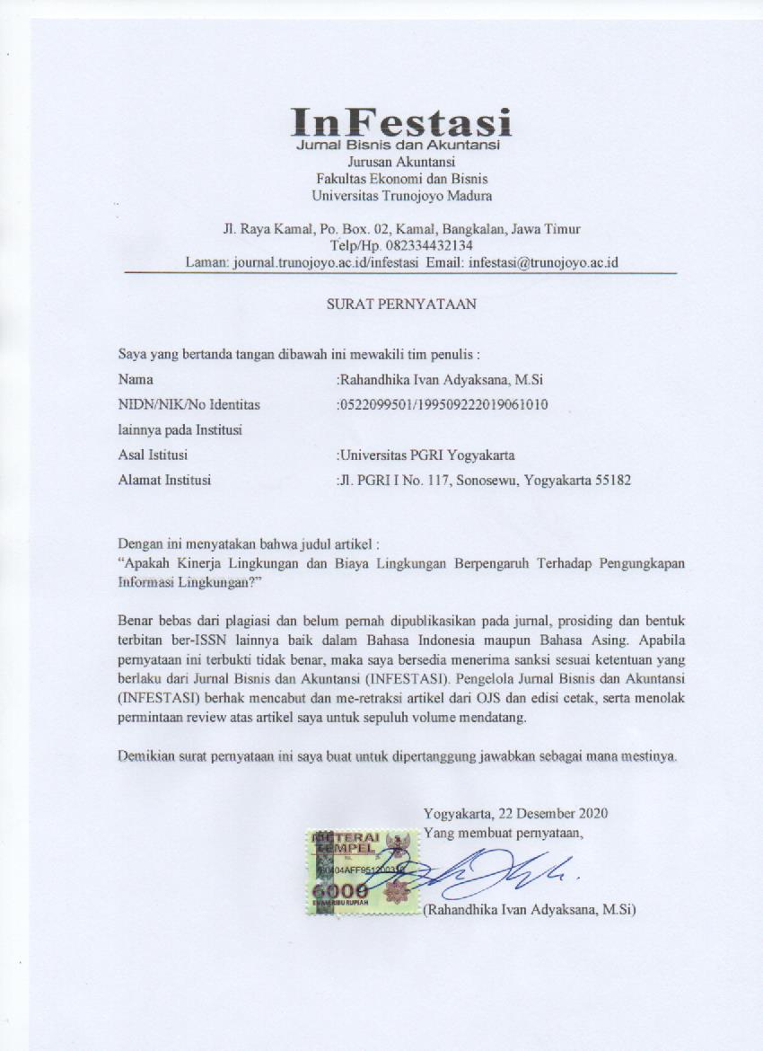 Environmental information disclosure is one type of disclosure that has been changed from voluntary disclosures to mandatory disclosures under the Peraturan Otoritas Jasa Keuangan (OJK) Nomor 29/POJK.04/2016. Only a few manufacturing companies in Indonesia have disclosed environmental information. This study aims to determine the effect of a company’s environmental performance and environmental costs on environmental information disclosure. Listed manufacturing companies in Indonesia from 2014-2018 are the population of this research. This study uses secondary data sourced from the company’s annual report. Sample selection using purposive sampling method with specific criteria. The data obtained were 20 companies. The results prove that the company’s environmental performance positively and significantly affected environmental information disclosure. Meanwhile, environmental costs do not affect the disclosure of environmental information. Based on the findings of this study, manufacturing companies in Indonesia are expected to be able to improve their environmental performance and improve the quality of the information in disclosing environmental information, so that the orientation of the company is expected to change not only in presenting environmental information disclosure but also improving the quality of the information because environmental information disclosure is now mandatory disclosure. Pengungkapan informasi lingkungan merupakan salah satu jenis pengungkapan yang telah diubah dari pengungkapan sukarela menjadi pengungkapan yang wajib diungkapkan melalui Peraturan Otoritas Jasa Keuangan (OJK) Nomor 29/POJK.04/2016. Penelitian ini dilakukan dengan tujuan untuk mengetahui pengaruh kinerja lingkungan yang dimiliki perusahaan dan alokasi biaya lingkungan terhadap pengungkapan informasi lingkungan. Perusahaan manufaktur di Indonesia yang terdaftar dari tahun 2014-2018 merupakan populasi penelitian ini. Penelitian ini menggunakan data sekunder yang bersumber dari laporan tahunan perusahaan. Pemilihan sampel dilakukan dengan menggunakan kriteria tertentu atau purposive sampling. Data yang diperoleh sebanyak 20 perusahaan. Hasil penelitian membuktikan bahwa kinerja lingkungan yang dimiliki perusahaan berpengaruh positif dan signifikan terhadap pengungkapan informasi lingkungan. Sedangkan biaya lingkungan tidak berpengaruh terhadap pengungkapan informasi lingkungan. Berdasarkan temuan tersebut, perusahaan manufaktur di Indonesia diharapkan mampu meningkatkan kinerja lingkungannya dan meningkatkan kualitas informasi dalam pengungkapan informasi lingkungan, sehingga orientasi perusahaan diharapkan berubah tidak hanya menyajikan pengungkapan informasi lingkungan tetapi sudah harus memperhatikan kualitas informasinya, karena pengungkapan informasi lingkungan saat ini sudah bersifat wajib diungkapkan.