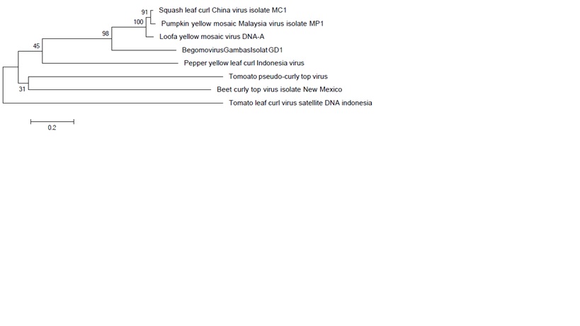 Vorstenlanden tobacco is the best product of PT Perkebunan Nusantara X (PTPN X) Klaten, Central Java that is commonly produced into high economic value cigars. During the planting season of 2010/2011, there was an epidemy of leaf curl disease that caused billion rupiahs financial loss. Several efforts had been done, including the use of pesticides, but the result had not been satisfactory. Therefore, this research aimed to identify the pathogen of tobacco leaf curl disease and conduct integrated control system using three combinations in the nursery [A (biological agents treatment, plastic screenhouse, without physical barrier); B (biological agents treatment, plastic screenhouse + screen plot, with physical barrier of single screen, and sprayed insecticide); C (biological agents treatment, plastic screenhouse + single screen plot, with physical barrier of double screens, and fogging using white oil + insecticide)] and planting area [A (physical barrier of single screen and sprayed insecticide); B (physical barrier of single screen, sprayed insecticide, and sanitation of broad leaf weed + eradication of infected plant); C (physical barrier of double screens, fogging white oil + insecticide, and sanitation of broad leaf weed + eradication of infected plant)]. The result showed that leaf curl disease that occured at PTPN X Klaten was caused by Begomovirus, based on PCR result using Krusty and Hommer primers for Begomovirus Coat Protein gene. The most effective integrated disease control of leaf curl disease in the nursery was C combination, that consisted of biological agents treatment on the seedlings medium, screenhouse covered by plastic and double screens that was combined with physical barrier of double screens around the field, and fogging using white oil+insecticide of pyrethroid active ingredient. The most effective integrated disease control of leaf curl disease in the field was the same C combination, that consisted of the use of physical barrier of double screens, environmental sanitation of weeds around the field and eradication of infected plants and fogging using white oil + insecticide of pyretroid active agent. IntisariTembakau vorstenlanden merupakan produk andalan PT Perkebunan Nusantara X (PTPN X) Klaten, Jawa Tengah sebagai bahan baku cerutu yang bernilai ekonomi tinggi. Pada musim tanam 2010/2011 telah terjadi epidemi penyakit keriting atau kerupuk tembakau dengan kerugian mencapai milyaran rupiah. Upaya pengendalian yag telah dilakukan dengan mengandalkan pestisida tidak memberikan hasil yang memuaskan. Oleh karena itu, penelitian ini ditujukan untuk mengidentifikasi patogen penyebab penyakit kerupuk tembakau dan melakukan pengendalian secara terpadu dengan menggunakan tiga macam kombinasi yang dilakukan di pembibitan [A (perlakuan agens hayati, penyungkupan plastik, tanpa barier fisik ); B (perlakuan agens hayati, penyungkupan, barier fisik tunggal, dan penyemprotan insektisida); C (perlakuan agens hayati, penyungkupan, barier fisik ganda, dan aplikasi white oil)] dan di lahan pertanaman [A (barier fisik tunggal dan insekstisida); B (barier fisik tunggal, insektisida, dan sanitasi gulma); C (barier fisik ganda, white oil + insektisida, dan sanitasi gulma)]. Hasil penelitian menunjukkan bahwa penyakit kerupuk tembakau di PTPN X Klaten disebabkan oleh Begomovirus berdasarkan hasil PCR menggunakan primer Krusty dan Hommer untuk gen Coat Protein Begomovirus. Pengendalian terpadu penyakit kerupuk di pembibitan yang paling efektif adalah kombinasi C yang terdiri dari perlakuan agens hayati pada media bibit, penyungkupan rangkap plastik + waring ganda dipadukan dengan barier fisik berupa waring ganda sekeliling lahan dan aplikasi white oil + insektisida berbahan aktif piretroid dengan cara fogging. Demikian juga pengendalian terpadu penyakit kerupuk di lapangan yang paling efektif adalah kombinasi C yang terdiri dari perlakuan agens hayati pada media bibit, sanitasi gulma di sekitar lingkungan pertanaman dan eradikasi tanaman sakit, penyungkupan rangkap plastik + waring ganda dipadukan dengan barier fisik berupa waring ganda sekeliling lahan dan aplikasi white oil + insektisida berbahan aktif piretroid dengan cara fogging.