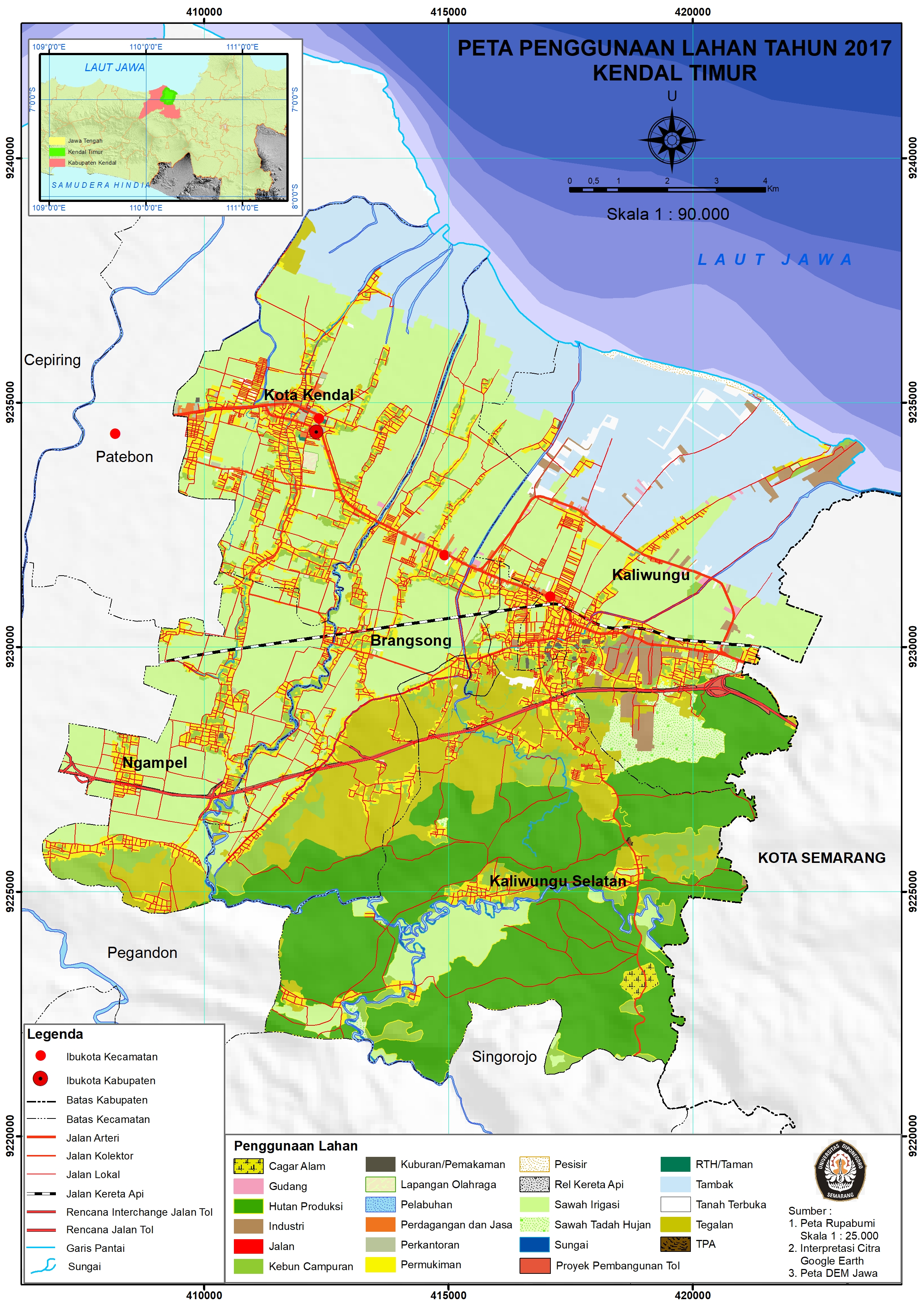 Kawasan industri Kendal (KIK) dikembangkan dengan luas mencapai 2.200 Ha di utara kecamatan kaliwungu diperkirakan menyerap hingga 500.000 tenaga kerja. KIK akan mengakselerasi pertumbuhan kota yang ditandai dengan proses urbanisasi dan konsumsi lahan yang tinggi. Penelitian ini bertujuan untuk melakukan prediksi penggunaan lahan tahun 2031 dengan adanya KIK di Kendal Timur. Pendekatan yang digunakan yaitu kuantitatif berbasis raster, dengan analisis proyeksi perkembangan lahan terbangun berdasarkan trend perubahan penggunaan lahan tahun 2005 – 2017 dan kebutuhan lahan akibat KIK. Model simulasi perubahan penggunaan lahan dengan model Cellular Automata (CA) dengan faktor pendorong meliputi faktor biofisik, sosial ekonomi, sarana prasarana, aksesbilitas dan ketetanggaan. Hasil penelitian menunjukkan KIK memiliki pengaruh yang kuat untuk mempercepat pertumbuhan kawasan perkotaan kaliwungu. Arah perkembangan Kendal Timur tahun 2031 dominan terjadi di kecamatan kaliwungu kemudian menyebar di kecamatan brangsong, kota Kendal, kaliwungu selatan dan ngampel dengan mengikuti pola perkembangan konsentris linier. Penggunaan lahan yang mengalami pertumbuhan tahun 2031 meliputi industri (2017,96 Ha), permukiman (1007,30 Ha), perdagangan dan jasa (271,39 Ha), dan gudang (18,76 Ha) yang diikuti terkonversinya lahan non terbangun yaitu tambak (1593,5 Ha), sawah irigasi (784,35 Ha kebun campuran (362,34 Ha), tegalan (361,65 Ha), tanah terbuka (145,5 Ha), sawah tadah hujan (66,71 Ha) dan hutan produksi (1,32 Ha).