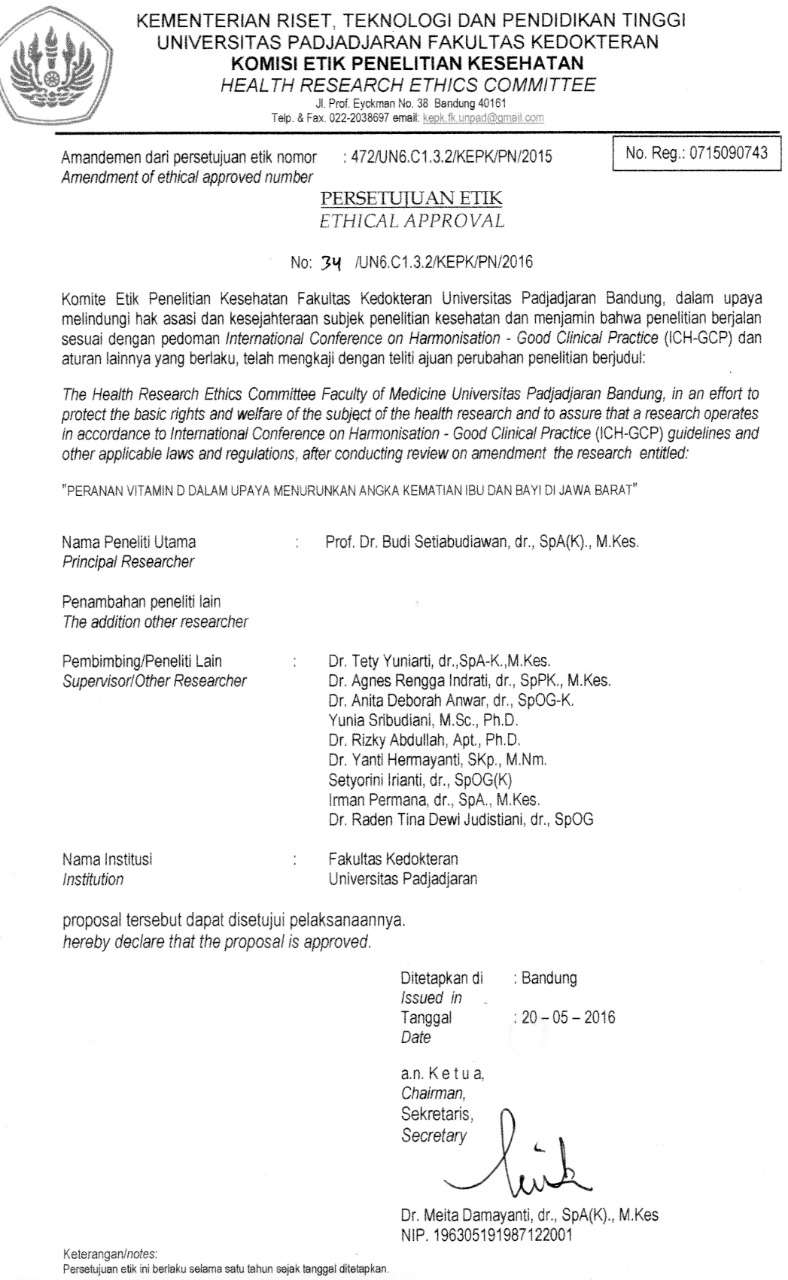 Small for gestational age (SGA) infants is one of the unfavorable outcomes of pregnancy that needs to be prevented. There are not many studies available on the association of maternal vitamin D levels during pregnancy and SGA infants. This study aimed to discover the association between maternal vitamin D level and SGA infants in West Java. A cohort study was performed from February 2018 to January 2019 by recruiting 304 pregnant women in Bandung, Cimahi, Waled, and Sukabumi, West Java Province, Indonesia. Of that number, 203 women were followed until the delivery date. Data were collected from the results of serial ultrasonography examinations and maternal vitamin D level measurements. Bivariate analysis and logistic regression were then performed to determine the relationship between variables. This study showed that 30 of 203 (14.78%) infants were born as SGA infants. The mothers of these SGA infants had a lower maternal vitamin D level at the beginning of the second trimester and smaller anthropometric measurements at the beginning of the third trimester. However, no significant difference was found between normal infants and SGA infants when the overall values for all trimesters were compared. It can be inferred that the maternal vitamin D level has a negative relationship with SGA infants in West Java, Indonesia. Further studies are required to prove the relationship between maternal vitamin Dl level and SGA infants.Hubungan Kadar Vitamin D Ibu dan Bayi Kecil Masa Kehamilan di Jawa BaratBayi kecil masa kehamilan (KMK) adalah luaran kehamilan yang perlu dicegah. Informasi tentang hubungan kadar vitamin D ibu dengan kejadian bayi KMK di Indonesia masih terbatas. Kadar vitamin D dan karakteristik ibu diduga berpengaruh dalam kejadian bayi KMK. Tujuan penelitian ini adalah mengetahui hubungan kadar vitamin D ibu dengan kejadian KMK pada bayi. Studi kohort dilakukan dari Februari 2018 hingga Januari 2019 dengan merekrut 304 ibu hamil di Bandung, Cimahi, Waled, dan Sukabumi, Provinsi Jawa Barat, Indonesia. Dari jumlah 203 orang diantaranya berhasil diikuti sejak trimester satu hingga persalinan dan terpilih menjadi subjek penelitian kasus kontrol. Pemeriksaan ultrasonografi, kadar vitamin D dan hemoglobin ibu dilakukan serial tiap trimester. Dilakukan analisis bivariat dan regresi logistik untuk menentukan hubungan antar variabel yang diteliti. Dari penelitian ini didapatkan sebanyak 30 dari 203 (14,78%) persalinan dengan luaran bayi KMK. Bayi KMK cenderung mempunyai riwayat kadar vitamin D yang lebih rendah pada awal trimester kedua dan hasil antropometri yang lebih rendah pada awal trimester tiga, namun secara statistik tidak berbeda signifikan. Simpulan penelitian ini bahwa kadar vitamin D ibu hamil memiliki korelasi negatif dengan bayi KMK. Penelitian lebih lanjut diperlukan untuk membuktikan hubungan antara kadar vitamin D ibu dan bayi KMK.