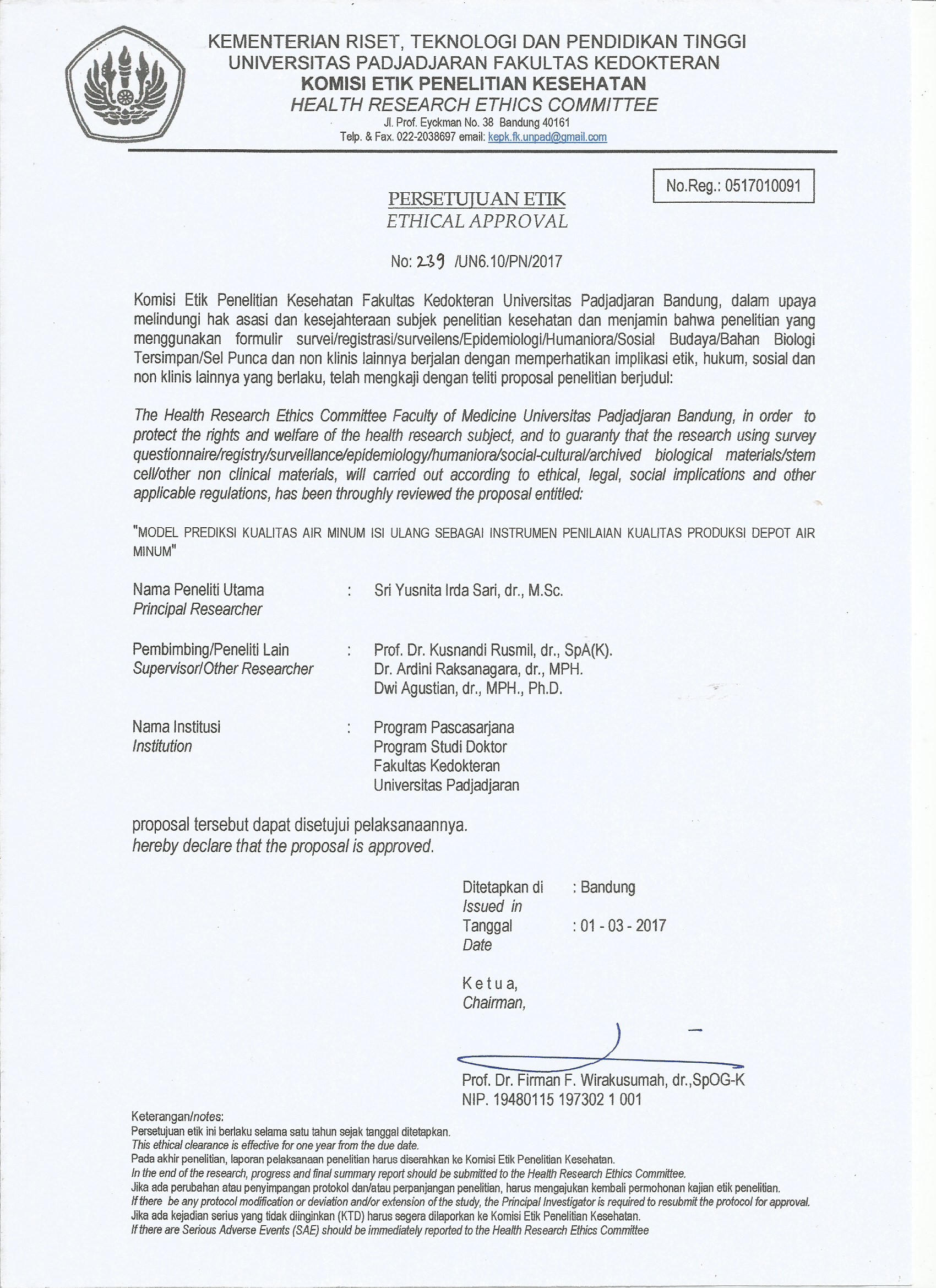 The number of drinking water refill stations (DWRS) was increased rapidly because high of mid-low urban community need to get affordable drinking water. Water treatment methods in DWRS are varying even many DWRS uses more than one disinfection method to increase the effectiveness. The quality of many DWRS productions was reported unstandardized, however not yet the study to evaluate the effects of the water treatment method used. This study aimed to compare the effectiveness of various water treatment methods in DWRS to identify which method is the most effective. The study used a cross-sectional approach conducted in 3 groups of water treatment methods, namely ultraviolet, ultraviolet + ozonization, and a combination of ultraviolet + ozonization + reverse osmosis with each group consisted of 40 DWRS. The survey was conducted in July–September 2017 in Bandung municipality by structured interview. Examination of microbiological parameters of raw and processed drinking water samples using membrane filter method. Water samples from raw water and drinking water from treatment process were taken from each DWRS to be tested for the microbiological parameter by using the membrane filter method. Comparison of the effectiveness was analyzed using the Wilcoxon rank sum test and assessment of log removal reduction. The result showed that there was significantly different in the effectiveness of coliform removal between the three groups. The improvement for controlling and training particularly for the procedure and maintenance of water treatment equipment to the owners/workers in DWRS is urgently needed as the concern of related authority. In conclusion, the water treatment method using reverse osmosis and ultraviolet is the most effective disinfection method compared to the ozonization method. The usage of more that one method of water treatment at the same time relate to the lower percentage of the effectiveness compares to the usage of only one method. EFEKTIVITAS ULTRAVIOLET, OZONISASI, DAN REVERSE OSMOSIS SEBAGAI METODE DESINFEKSI DEPOT AIR MINUM ISI ULANGPerkembangan depot air minum isi ulang (DAM) melaju dengan pesat karena masyarakat menengah ke bawah perkotaan membutuhkan air minum dengan harga yang terjangkau. Metode pengolahan air baku menjadi air minum di DAM bervariasi bahkan tidak jarang digunakan lebih dari satu metode desinfeksi untuk meningkatkan efektivitasnya. Kualitas produksi DAM banyak yang dilaporkan tidak sesuai dengan standar, namun belum terdapat penelitian yang mengevaluasi pengaruh metode pengolahan air yang digunakan. Penelitian ini bertujuan membandingkan efektivitas berbagai metode pengolahan air di DAM sehingga dapat diketahui metode apa yang paling efektif. Penelitian ini menggunakan pendekatan cross-sectional yang dilakukan pada 3 kelompok metode pengolahan air, yaitu ultraviolet, ultraviolet + ozonisasi, dan kombinasi ultraviolet + ozonisasi + reverse osmosis dengan tiap-tiap kelompok terdiri atas 40 DAM. Survei dilakukan pada Juli–September 2017 di Kota Bandung dengan melakukan wawancara terstruktur. Sampel air baku dan air minum hasil olahan diambil dari setiap DAM untuk diperiksa parameter mikrobiologinya menggunakan metode filter membran. Perbandingan efektivitas dianalisis menggunakan Wilcoxon rank sum test dan penilaian log removal reduction. Hasil penelitian menunjukkan bahwa terdapat perbedaan efektivitas yang signifikan pada ketiga kelompok terutama efektivitas terhadap coliform. Perlu upaya pengawasan dan pelatihan khususnya mengenai teknis pemakaian dan pemeliharaan alat pada pemilik/pekerja DAM yang harus menjadi perhatian pemerintah dan pihak terkait. Simpulan, metode pengolahan air menggunakan reverse osmosis dan ultraviolet merupakan metode desinfeksi yang paling efektif dibanding dengan metode ozonisasi. Pemakaian lebih dari satu metode desinfeksi pada saat yang bersamaan menyebabkan persentase efektivitas menjadi lebih rendah dibanding dengan yang menggunakan hanya satu jenis metode desinfeksi.