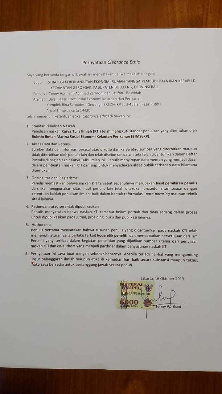 Ketimpangan sosial ekonomi yang masih terlihat dalam kehidupan masyarakat pesisir telah berkontribusi pada distribusi kemiskinan, sehingga perlu intervensi pemerintah pusat maupun daerah. Tujuan penelitian ini meliputi (1) mengidentifikasi karakteristik usaha rumah tangga (RT); (2) menganalisis indeks keberlanjutan rumah tangga; dan (3) menganalisis strategi keberlanjutan RT pembudi daya kerapu, khususnya di Kecamatan Gerokrak, Kabupaten Buleleng, Bali. Penelitian dilakukan selama bulan Februari—Desember 2018 di Teluk Pegametan, Kabupaten Buleleng, Bali. Riset ini menggunakan pendekatan “Sustainable Livelihood Approach”. Metode pengumpulan data dilakukan melalui wawancara, observasi, dan dokumentasi. Data yang dikumpulkan diinput dan dianalisis secara deskriptif, analisis finansial, serta penghitungan indeks keberlanjutan ekonomi rumah tangga “iKERT” kelautan dan perikanan yang terdiri dari lima indeks modal (alam, manusia, finansial, sosial, dan fisik). Hasil penelitian menunjukkan besarnya indeks keberlanjutan ekonomi rumah tangga untuk masing-masing modal adalah 75,49 (modal finansial); 59,23 (modal alam); 35,92 (modal fisik); 45,48 (modal manusia); dan 42,34 (modal sosial). Secara komposit, indeks modal alam, indeks modal sosial, indeks modal fisik cukup sesuai dengan keberlanjutan ekonomi rumah tangga kelautan perikanan. Ketiga indeks sudah mendekati nilai rata-rata dari sebaran indeks (50%) yang diasumsikan sebagai kondisi ideal untuk keberlanjutan ekonomi rumah tangga. Sementara itu, kebijakan maupun program yang terkait dengan indeks modal manusia, belum terlalu optimal untuk mendukung keberlanjutan ekonomi rumah tangga pembudi daya ikan di Kecamatan Gerokgak, Kabupaten Buleleng, Bali.Title: Household Economy Sustainability of Grouper Farmers in Gerokgak Sub District, Buleleng Regency, Bali ProvinceThe socio-economic disparity among coastal communities lead to the widespread distribution of poverty, hence, they need intervention from central government as well as local government. The purpose of this study consists of; 1) to identify the characteristics of household livelihood activity; (2) to analyse the index of household economic sustainability; and (3) to recommend the strategy for sustainable households’ economy. The study was conducted during February to December 2018 in Buleleng Regency (Pegametan Bay), Bali. The research used “Sustainable Livelihood Approach”. Data were collected from interviews, observation, and documentation. The data were analyzed using descriptive analysis, financial analysis, and index to calculate of the sustainability of fisheries households’ economy called “iKERT” based on five capitals, namely natural, human, financial, social, and physical. The result of the study indicates that the index of each indicator is 75,49 (financial capital); 59,23 (natural capital); 35,92 (physical capital); 45,48 (human capital); and 42,34 (social capital). As a composite manner, the natural capital index, social capital index, physical capital index, are quite appropriate with the household economic sustainability of fish farmers. These three indexes are approach to the average of the index distribution (50%) that is assumed an ideal condition for household economic sustainability. Meanwhile, the related policies and programs to the Human Capital Index have not reached to support the household economic sustainability of fish farmers in Gerokgak Sub District, Buleleng Regency, Bali.