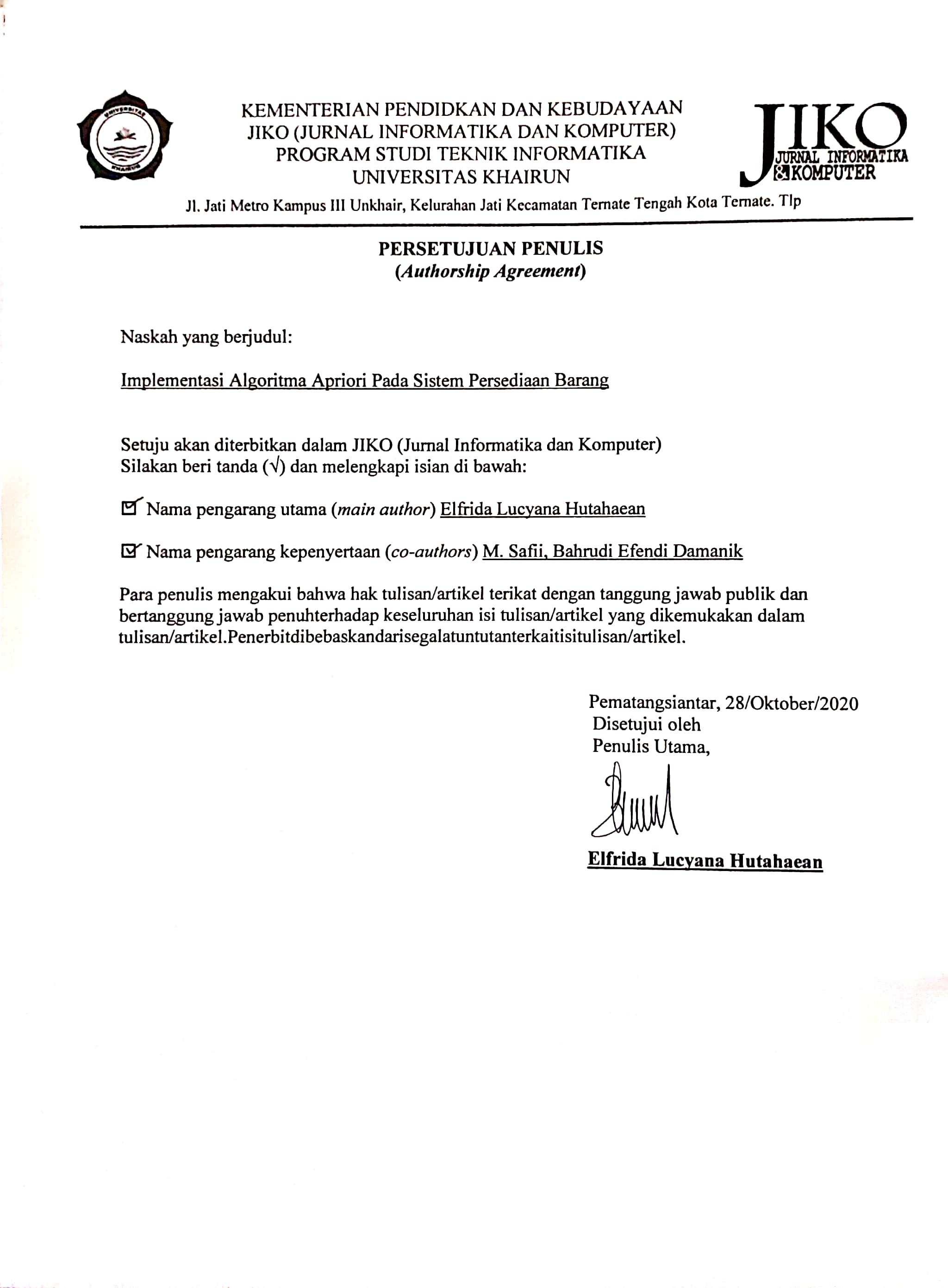 JIKO (Jurnal Informatika dan Komputer) Vol 3, No 3 (2020)