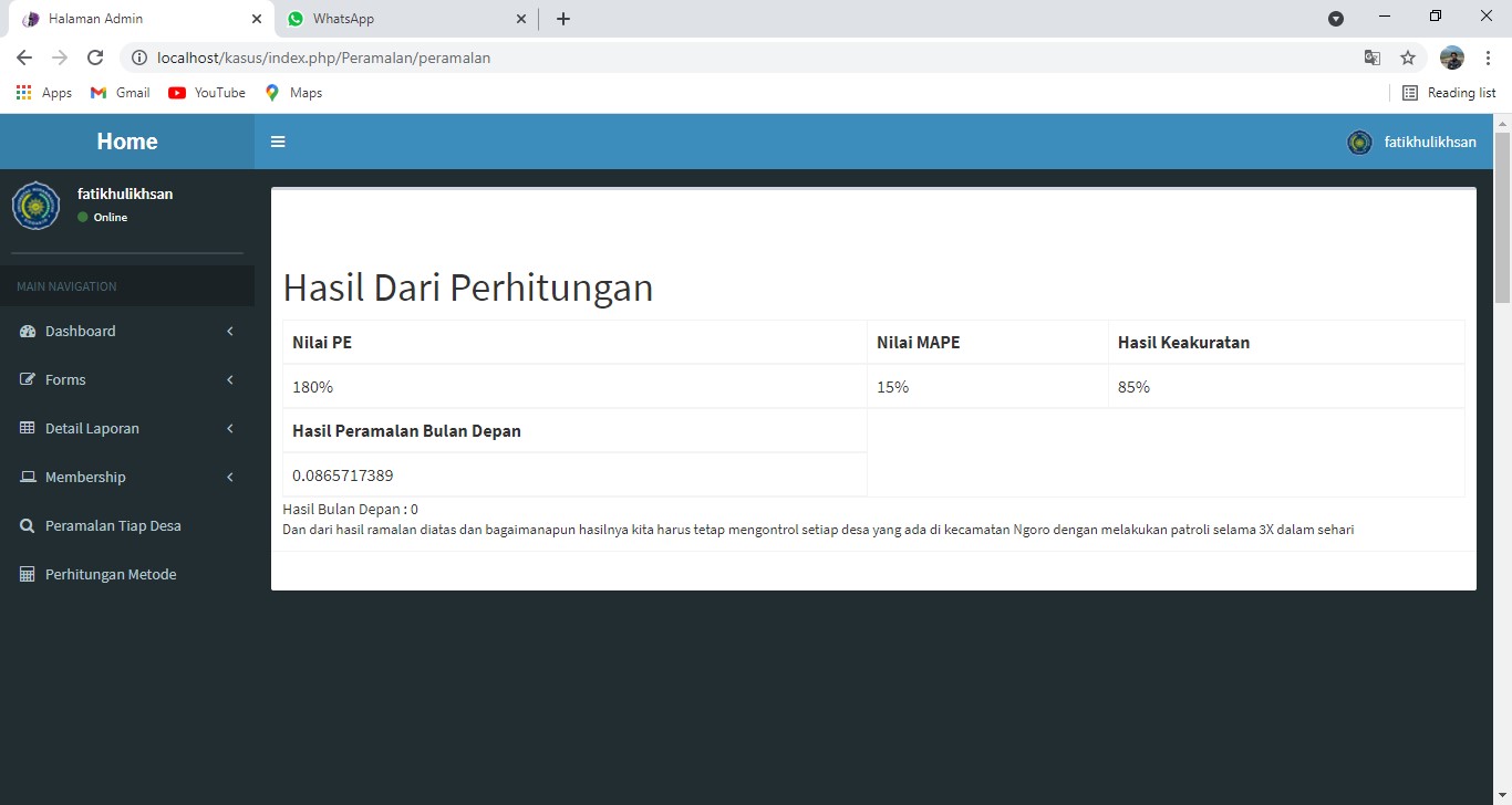 Crime is a form of social action that violates legal norms relating to acts of seizing property rights of others, disturbing public order and peace, and killing one or a group of people. This has always been a concern for residents in various places in the Ngoro sub-district, therefore this information system was created to help police officers to find out where crimes have occurred. This information sfystem was created to predict the area in Ngoro sub-district using the Double Exponential Smoothing method. So that this system can predict which areas in the next month there will be no crime, and can assist the public in reporting the occurrence of criminal acts without having to go to the police station first. The Double Exponential Smoothing method was chosen by the author because this method can be used. The data used is data on theft of crime from 2017 – 2019. The results of forecasting in one village in Ngoro sub-district such as Manduro are 0.07426431198 if rounded up to 0.1 which is categorized as low crime and has a MAPE value of 7.94%. Based on the MAPE value of the forecasting results, it can be concluded that a good constant is between 0.1 – 0.3.