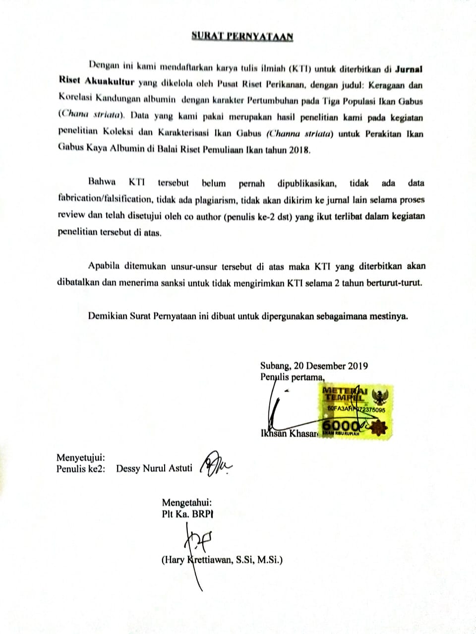 Albumin ikan gabus merupakan bahan farmasi bernilai tinggi, banyak dimanfaatkan untuk mengobati pasien pascaoperasi dan luka bakar. Penelitian ini bertujuan untuk menganalisis keragaman dan korelasi kandungan albumin terhadap karakter pertumbuhan pada tiga populasi ikan gabus (Chana striata) dari Sumatera (SM), Jawa (JW) dan Kalimantan (KL). Tahap awal dari penelitian ini adalah pemeliharaan larva-benih, karakterisasi dan analisis kandungan albumin ikan gabus dari tiga populasi. Kandungan albumin pada sampel daging (20 ekor ikan per populasi) dianalisis menggunakan reagen bromocresol green dan diukur dengan spektrofotometer pada 578 nm. Benih ikan gabus dari populasi SM, JW, dan KL dengan ukuran panjang total 28,9 ± 5,7 mm dan bobot badan 0,27 ± 0,09 g dari 12 famili, terdiri dari 4 famili untuk setiap populasi dipelihara secara acak dalam 12 buah kolam beton ukuran 25 m2 selama 75 hari. Kandungan albumin rata-rata ketiga populasi tidak berbeda nyata (P>0,05), yaitu 2,6 ± 0,4 g dL-1 (KL), 2,4 ± 0,3 g dL-1 (SM) dan 2,2 ± 0,4 g dL-1 (JV); dengan koefisien keragaman sebesar 12,60% (SM), 18,13% (JT) dan 17,0% (KL). Nilai korelasi antara panjang total, panjang standar, dan bobot badan dengan kandungan albumin tergolong rendah hingga sedang, yaitu secara berurutan sebesar -0,05; -0,03 dan -0,43 (SM), 0,42; 0,475 dan 0,34 (JW) dan -0,28; -0,35 dan -0,275 (KL). Hasil analisis tersebut menunjukkan bahwa keragaman kandungan albumin tidak berbeda antar populasi, sehingga pendekatan seleksi kurang efektif. Nilai korelasi antara karakter pertumbuhan terhadap kandungan albumin pada ikan gabus tergolong rendah. The snakehead fish (SHF) albumin is a highly valued pharmaceutical material widely used to treat postsurgery wounds and skin burns. This study’s purpose was to analyze the coefficient of variance and correlation of albumin trait to growth characters of three SHF populations: Sumatera (SM), Java (JV) and Kalimantan (KL). The first step of this study consisted of larval and seed rearing of three SHF populations followed up by characterization and analysis of their albumin content. The albumin contents of the SHF meat (20 fish for each population) were analyzed using bromocresol green reagent and measured using a spectrophotometer at 578 nm. The SHF seeds (28.9 ± 5.7 mm of total length and 0.27 ± 0.09 g of body weight) from 12 families consisted of four families for each population were reared in 12 concrete ponds measuring 25 m2 for 75 days. The averages of albumin content of the three populations were 2.6 ± 0.4 g dL-1 (KL) 2.4 ± 0.3 g dL-1 (SM) and 2.2 ± 0.4 g dL-1 (JV) and considered not significantly different (P> 0.05) with coefficients of variance of 12.60% (SM), 18.13% (JV) and 17.0% (KL). The correlation values of total length (TL), standard length (SL) and body weight (BW) with albumin content of the SHF were -0.05, -0.03, and -0.43 (SM); 0.42, 0.475, and 0.34 (JV); and -0.28, -0.35, dan -0.275 (KL) and classified as low to moderate. The results suggested that the variances of albumin content among the populations were not significantly different and the individual selection method was not effective.