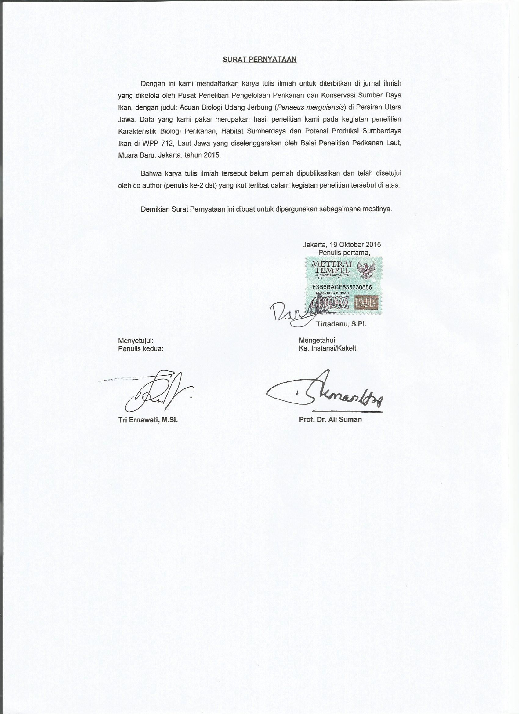Teluk Jakarta merupakan salah satu daerah penangkapan dan habitat rajungan (Portunus pelagicus) di Indonesia. Permintaan pasar yang terus meningkat dan bersamaan dengan penurunan kualitas perairan mengakibatkan stok rajungan mengalami tekanan eksploitasi dan degradasi habitat. Agar pengelolaan sumberdaya rajungan di Teluk Jakarta tetap lestari, maka diperlukan penelitian mengenai perikanan dan dinamika populasi. Tujuan penelitian memperoleh data dan informasi mengenai daerah tangkapan, alat dan musim penangkapan, indeks kelimpahan, produksi dan komposisi, struktur ukuran, nisbah kelamin, kematangan gonad, musim pemijahan, ukuran panjang pertama tertangkap, ukuran panjang pertama matang gonad, laju pertumbuhan, laju kematian dan laju eksploitasi. Data dan informasi diperoleh dengan eksplorasi, observasi, enumerasi, wawancara dan perunutan pada tempat pendaratan ikan dan instansi lain yang terkait dengan perikanan, selama tahun 2016. Hasil penelitian didapatkan karakteritik daerah penangkapan rajungan; substrat lumpur berpasir dengan perairan dasar yang mempunyai salinitas 30,5-32 ppt, oksigen 6,5-6,9 ml/l, pH 7,5-8,01, kecepatan arus 0,08-0,24 m/dt. Alat tangkap utama berupa jaring insang dasar bermata 3-3,5 inchi, musim penangkapan Mei-Agustus dan paceklik November-Januari. CPUE rajungan tahun 2016 sebesar 7,2 kg/tarik/trip/hari dan mengalami penurunan 55,22 % tahun 2007. Rajungan berkontribusi 69,11 % terhadap hasil tangkapan jaring insang dasar, sumberdaya ikan lainnya 30,89 %. Modus lebar karapas 85-90 mmCW, lebar karapas pada perairan dekat pantai 84,3 mm dan kearah lepas pantai 99,4 mm. Rajungan di Teluk Jakarta mempunyai tipe pertumbuhan alometrik negatif. Nisbah kelamin jantan : betina = 1 : 0,83, betina dominan pada perairan kearah lepas pantai dan jantan dominan kearah pantai (salinitas rendah). Musim pemijahan rajungan di Teluk Jakarta sepanjang tahun, mempunyai dua puncak pada bulan Maret dan September dengan pusat sebaran gonad ovigerous di sekitar perairan P. Damar. Rata-rata ukuran pertama tertangkap (Lc) = 93,87 mmCW lebih besar dari rata-rata ukuran pertama matang gonad (Lm) = 68,8 mmCW. Laju pertumbuhan (K) = 1,08 mmCW/tahun dengan lebar karapas maksimal (L”) = 142,5 mmCW. Laju kematian total (Z)= 4,87/tahun, penangkapan (F) = 3,63/tahun, alami (M) = 1,24/tahun dan laju pengusahaan (E) = 0,75/tahun. Jakarta Bay is one of the fishing areas and habitat of blue swimmer crabs (Portunus pelagicus) in Indonesia. Market demand that continues to increase and along with the decline in water quality results in crab stocks experiencing pressure from exploitation and habitat degradation. So that the management of crab resources in the Jakarta Bay remains sustainable, research on fisheries and population dynamics is needed. The purpose of the study was to obtain data and information; fishing ground, fishing season and main gears, abundance index, production and composition of catch, size structure, sex ratio, gonad maturity, spawning season, first length of catch, length of first gonad maturity, growth rate, mortality rate and exploitation rate. Data and information were obtained by exploration, observation, enumeration, interviews and tracing at fish landing sites and other institutions related to fisheries, during 2016. The results of the study obtained the characteristics of the crab fishing ground; sandy mud substrate with bottom waters which have a salinity of 30.5-32 ppt, oxygen 6.5-6.9 ml / l, pH 7.5-8.01, flow velocity 0.08-0.24 m / sec. The main gears are bottom gill nets with mesh size 3-3.5-inch, the fishing season in May-August and famine in the November-January. CPUE of blue swimmer crabs in the 2016 was 7.2 kg / pull / trip / day decreased 55.22% in 2007. The blue swimmer crabs contributed 69.11% to the catch of bottom gill nets, other fish resources 30.89%. Carapace width frequency have mode is 85-90 mmCW, carapace width in waters near the coast is 84.3 mm and offshore is 99.4 mm. The blue swimmer crabs in Jakarta Bay has a negative allometric growth type. Sex ratio male: female = 1: 0.83, female dominant in offshore and male dominant direction towards in shore and (low salinity). The spawning season of blue swimmer crabs in Jakarta Bay has two peaks in March and September with an ovigerous gonad distribution center around the waters of P. Damar. The average size of the length first catch (Lc) = 93.87 mmCW is greater than the average size of the length first gonad maturity (Lm) = 68.8 mmCW. Growth rate (K) = 1.08 mmCW / year with length infinity of carapace width (L”) = 142.5 mmCW. Maturity rate are total (Z) = 4.87/year, capture (F) = 3.63/year, natural (M) = 1.24/year and explotation rate (E) = 0.75/year.