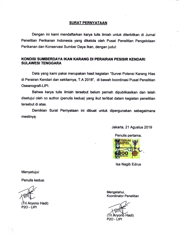 Ekosistem terumbu karang di Kawasan Pesisir Kendari sangat dipengaruhi oleh aktivitas pembangunan di daratan utama seperti sedimentasi yang berkepanjangan. Hal ini dapat berpengaruh pada tutupan karang dan kecerahan air laut, dan sebagai konsekuensinya adalah terjadinya perubahan struktur komunitas ikan karang. Keanekaragaman ikan karang diasumsikan akan menurun ketika terjadi kerusakan yang meluas pada terumbu karang dan dalam waktu yang panjang. Tujuan penelitian adalah untuk mengidentifikasi kondisi sumberdaya ikan karang melalui kajian struktur komunitas ikan karang. Penelitian ini dilakukan pada bulan September 2018 di perairan karang pesisir Kendari, Sulawesi Tenggara. Metode yang digunakan dalam kegiatan ini adalah sensus visual bawah air dengan transek sabuk pada 10 lokasi penelitian. Hasil penelitian menemukan 195 spesies ikan karang yang terdiri dari 93 spesies kelompok mayor, 89 jenis kelompok ikan target, dan 13 jenis kelompok ikan indikator. Dari 10 lokasi transek, hanya 4 stasiun yang memiliki nilai indeks keanekaragaman antara 3,0 – 3,6, indeks dominansi antara 0,04 – 0,10 dan indeks keseragaman antara 0,8 – 0,9, serta 5 stasiun memiliki indeks kekayaan jenis antara 7,8 hingga 10,5. Keanekaragaman jenis ikan termasuk rendah, komunitas didominasi oleh kelompok ikan mayor, dan kepadatan stok ikan karang tergolong rendah pada semua stasiun. Coral reef ecosystems in Kendari coastal area were affected by mainland development as well as long-term sedimentation.Those activities influencing coral coverage and sea water tranparency lead to the changes in reef fish structure communities. The study objective is to identify the condition of reef-fishes by analyzing theirin terms of a community structures. This study was carried out in September 2018 at the adjacent Kendari’s reef waters, Southeast Sulawesi. The method used in this study was the underwater visual cencus using belt transects at ten study sites. The results of the study successfully identified about 195 species of reef fishes, consisted of 93 species of major-fish group, 89 species of target-fish group, and 13 species of indicator-fish group. Species compositions among the study sites ranged from 39 species to 74 species. Among the 10 transect sites, four sites had fish diversity indices ranging from 3.0 to 3.6, dominance indices ranging from 0.04 – 0.1, and evenness indices ranging from 0.8 to 0.9, whereas 5 transect sites had species richness levels ranging from 7.8 to 10.5. For all study sites, the reef fishes diversities were in low levels, reef fishes communities were dominated by major-fish groups, and the density of fish stocks were classified in low levels.