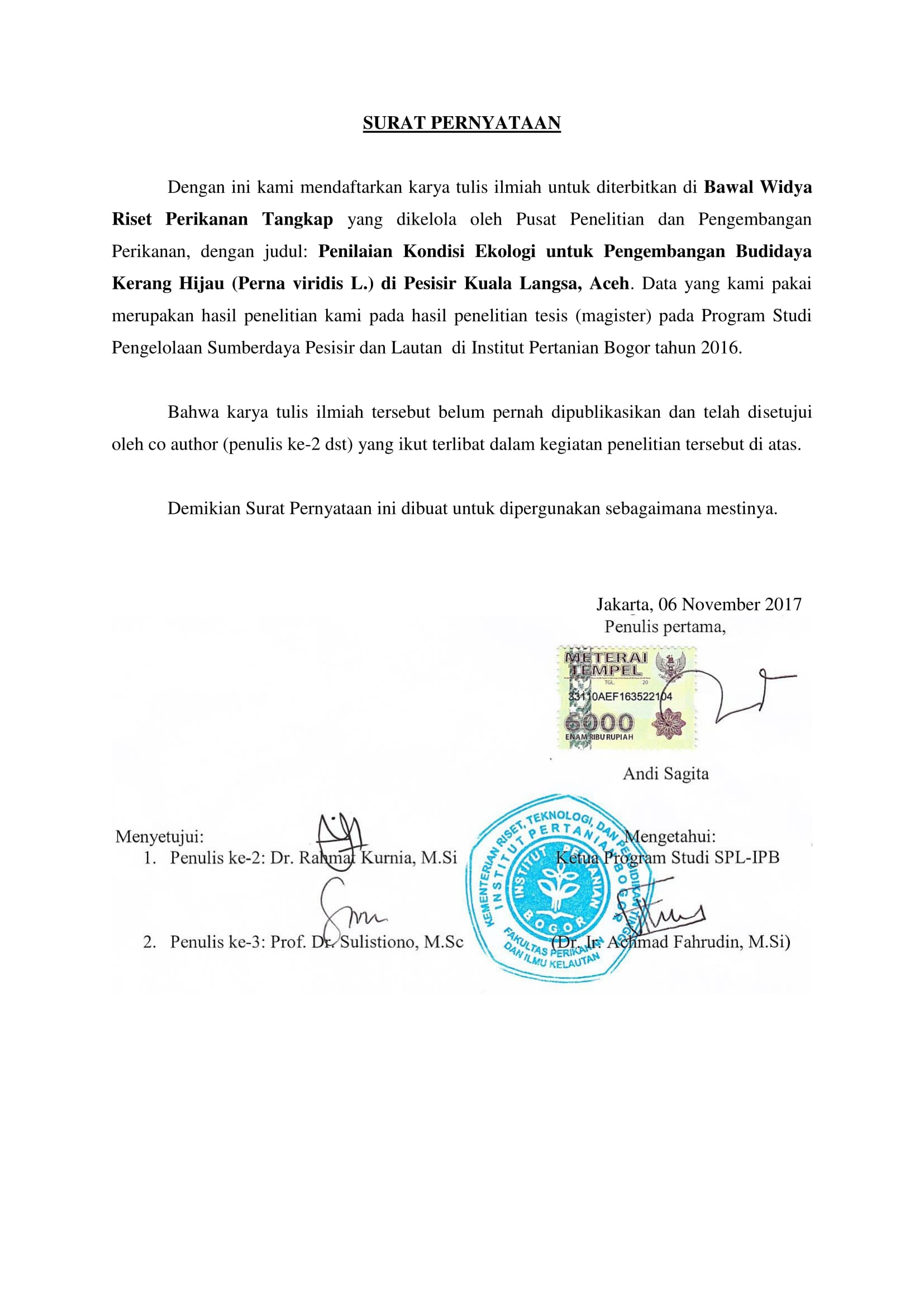 Penelitian ini bertujuan untuk menilai kondisi ekologi untuk pengembangan budidaya kerang hijau di pesisir Kuala Langsa, Aceh. Data ekologi perairan dikumpulkan di 12 titik sampling pada Agustus, September dan Oktober 2016 untuk mewakili musim hujan, serta Maret, April dan Mei 2017 untuk mewakili musim kemarau. Data dianalisis dengan analisis komponen utama (principal component analysis/PCA). Suhu perairan pesisir Kuala Langsa berkisar 25,5 – 35,6 oC dengan rata-rata 30,5 ± 1,7 oC; salinitas 25,9 – 34,0 ppt dengan rata-rata 29,9 ± 1,3 oC; pH 7,0 – 9,2 dengan rata-rata 8,1 ± 0,3; oksigen terlarut 3,9 – 6,8 mg/l dengan rata-rata 5,5 ± 0,5 mg/l; kecepatan arus berkisar 0,1 – 0,9 m/s dengan rata-rata 0,3 ± 0,1 m/s; serta kelimpahan fitoplankton berkisar 1,32 x 105 sel/m3 hingga 6,86 x 105 sel/m3 dengan rata-rata 3,88 x 105 ± 1,08 x 105 sel/ m3. PCA yang diaplikasikan pada seluruh data menghasilkan dua komponen utama, yaitu PC1 dan PC2 dengan nilai akar ciri (eigenvalue) sebesar 2,096 dan 1,770; dimana PC1 secara kumulatif dapat menjelaskan ragam seluruh data sebesar 34,9% yang dibangun oleh parameter salinitas, suhu dan plankton, sedangkan PC2 sebesar 64,4% yang dibangun oleh parameter oksigen terlarut dan salinitas. Berdasarkan analisis dengan membandingkan parameter ekologi perairan untuk budidaya kerang hijau berdasarkan literatur maka dapat disimpulkan bahwa kondisi ekologi perairan pada musim hujan dan kemarau dapat mendukung pengembangan budidaya kerang hijau di pesisir Kuala Langsa, Aceh. The research aims to assess the waters ecology condition for the development of green mussel cultivation in the coastal of Kuala Langsa, Aceh. Parameters of waters ecology collected at 12 sampling points in August, September and October 2016 to represent the rainy season, while March, April and May 2017 to represent the dry season. Principal component analysis (PCA) used to assess the waters ecology. The temperature ranged 25.5 – 35.6 oC average by 30.5 ± 1.7 oC; salinity by 25.9 – 34.0 ppt average by 29.9 ± 1.3 oC; pH by 7.0 – 9.2 average by 8.1 ± 0.3; dissolved oxygen from 3.9 – 6.8 average by 5.5 ± 0.5 mg/l; current velocity by 0.1 – 0.9 m/s average by 0.3 ± 0.1 m/s; and abundance of phytoplankton ranged 1.32 x 105 cell/m3 to 6.86 x 105 cell/m3. Two principal component was PC1 and PC2 with a eigenvalue of 2.096 and 1.770 extracted from PCA; where PC1 on cumulatively can explain 34.9% of all data collected, mainly contributed by parameters of salinity, temperature and plankton, while PC2 was 64.4% contributed by parameters dissolved oxygen and salinity. Based on the analysis by comparing waters ecology parameters for green mussel culture based from literate study, it suggests that the waters ecology condition could support the development of green mussel culture in the coastal of Kuala Langsa, Aceh.