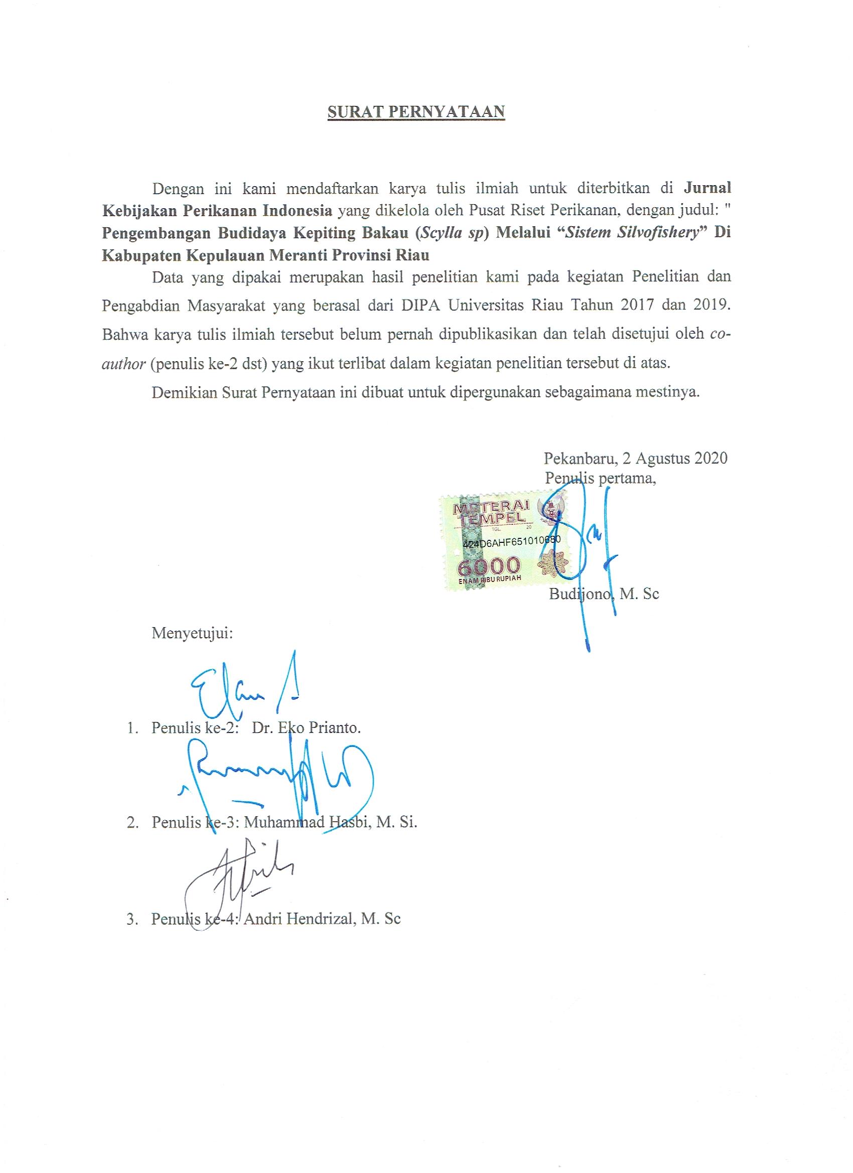 Hutan mangrove merupakan salah satu ekosistem pesisir yang berperan penting dalam mendukung kehidupan biota laut. Keberadaan hutan mangrove di Kabupaten Kepulauan Meranti saat ini terus mengalami degradasi yang berimplikasi terhadap menurunnya fungsi ekologis, sosial dan ekonomi masyarakat lokal. Upaya meminimalisir kerusakan hutan mangrove terus dilakukan oleh pemerintah daerah dan masyarakat lokal hingga saat ini. Salah satu upaya yang dapat dilakukan melalui budidaya kepiting bakau dengan sistem sylvofishery. Metode penelitian yang digunakan adalah eksperimen dan wawancara yang dilakukan di Kelurahan Teluk Belitung dan Desa Bandul Kabupaten Meranti. Data dan informasi dihimpun dari penelusuran, dan penelahaan data dan informasi hasil penelitian serta laporan kegiatan yang terkait dengan budidaya kepiting bakau dengan sistem silvofishery. Hasil kajian menunjukkan potensi pengembangan budidaya laut di Kabupaten Kepulauan Meranti tersebar di beberapa pulau seperti Pulau Padang, Tebing Tinggi dan Pulau Rangsang dengan luas lahan sebesar 438 ha. Luasnya lokasi budidaya didukung pula dengan kualitas perairan yang cukup bagus dan cocok untuk dikembangkan budidaya kepiting dengan sistem sylvofishery. Ujicoba penerapan sylvofishery kepiting bakau model kurungan tancap diperoleh tingkat survival rate mencapai 70 % dan pertumbuhan rata-rata berkisar 100 – 140 g per bulan. Pemeliharaan kepiting bakau dengan sistem sylvofishery selama 3 bulan dapat memberikan keuntungan dan tambahan penghasilan per bulan sebesar Rp. 1.070.150. Dalam satu siklus pembesaran jika kondisi normal dapat mengembalikan investasinya sehingga sylvofishery kepiting bakau layak dijadi usaha alternatif bagi masyarakat pesisir.Mangrove forest is one of the coastal ecosystems were plays a role in supporting marine life. Existence of mangrove forests in the Meranti Kepulauan district is experiencing degradation which has implications for the decline to ecological, social and economic functions of the local community. The efforts for minimize damage of mangrove forests have been carried out by local governments and local communities. One of the effort could be done through the cultivation of mud crabs with sylvofishery system. Experiment method was applied and interview was done in Teluk Belitung and Bandul villages, Meranti Regency. Data and information were collected and had been analyzed and activities reported that related to mud crab culture using the silvofishery system. The resut of the study showed that potential development of marine culture in the Kepulauan Meranti district is spread across several islands such as Padang Island, Tebing Tinggi and Pulau Rangsang with an area of 438 ha. The extent of the aquaculture site is also supported by good waters quality and suitable for developing mud crab culture with the sylvofishery system. The trial application of the mud crab silvofishery model of fixed confinement obtained a survival rate of up to 70% and an average growth of around 100-140 g per month. Maintenance of mangrove crabs with the sylvofishery system for 3 months can provide benefits and additional income per month of IDR. 1,070,150. In one cycle of enlargement if normal conditions, it’s can return the investment so the mangrove crab sylvofishery deserves to be an alternative effort for coastal communities.