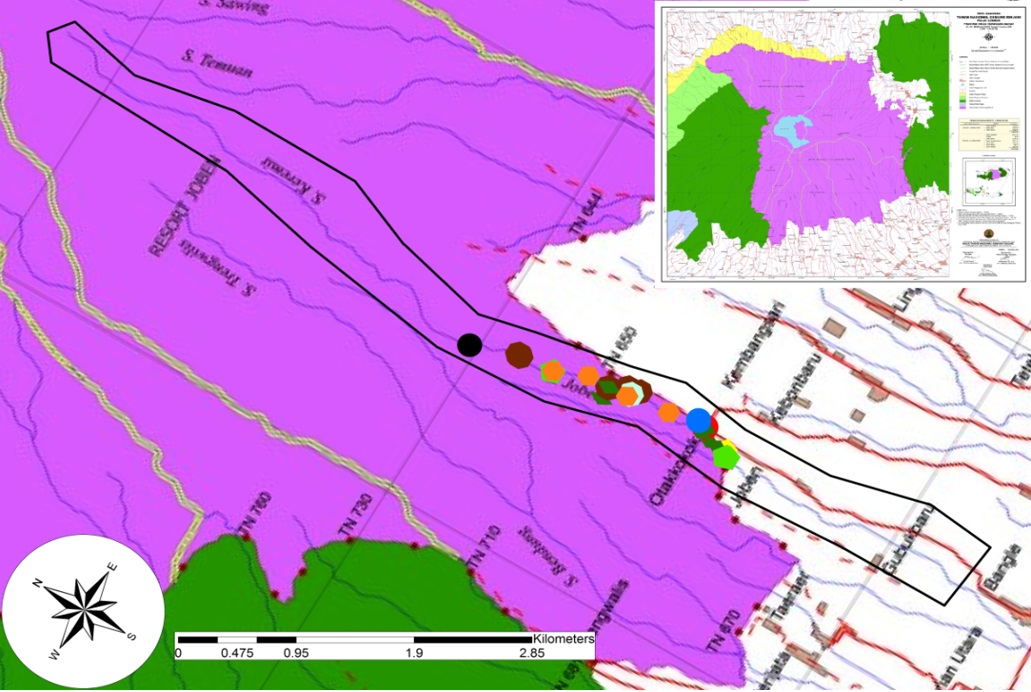 Abstrak : Sungai Keremit terletak di Joben Resort, Taman Nasional Gunung Rinjani, Lombok, yang memiliki ketinggian 661m-848m di atas permukaan laut, di sungai Keremit terdapat berbagai jenis tanaman, salah satunya adalah bambu yang tumbuh di sempadan sungai, palung, tebing dan tepi sungai. Penelitian ini bertujuan untuk mengetahui spesies bambu, kunci identifikasi, deskripsi, hubungan kekerabatan antar spesies bambu, peta distribusi bambu di sempadan sungai Keremit, Resort Joben, Taman Nasional Gunung Rinjani, Lombok. Pengambilan sampel dilakukan dengan menggunakan metode garis, mengumpulkan semua spesies bambu di sepanjang sempadan sungai Keremit yang diambil pada area 50 meter dari tepi kiri dan kanan palung sungai. Berdasarkan hasil identifikasi ditemukan 4 marga bambu, dengan 6 spesies dan 1 kultivar (cv), di sempadan sungai Keremit, Resort Joben, Taman Nasional Gunung Rinjani, Lombok, yaitu Schizostachyum jaculans, Gigantochloa atter, Gigantochloa apus, Dendrocalamus sp., Dendrocalamus asper, Bambusa vulgaris, dan 1 kultivar bambu, yaitu Bambusa vulgaris cv. Vittata.Kata kunci : Bambu, Tepi Sungai, Taman Nasional Gunung Rinjani, Lombok.Abstract : Keremit river is located in Joben Resort, Rinjani Mount National Park, Lombok, which has an altitude of 661m-848m above sea level, in the Keremit river there are various types of plants, one of which is bamboo which grows on the edge of the trough, cliffs and river banks. This study aims to determine the species of bamboo, identification keys, description, relationship between bamboo species, bamboos distribution map at the border of the Keremit river, Resort Joben, Rinjani Mount National Park, Lombok. Samples collections were conducted using the line sampling method, collecting all species of bamboo in the border of the Keremit river were taken from the area of 50 meters from the left and right edges of the riverbed. Based on the identification results was 4 genera of bamboos, with 6 species and 1 cultivated variety in the border of Keremit river, Joben Resort, Rinjani Mount National Park, Lombok, namely Schizostachyum jaculans, Gigantochloa atter, Gigantochloa apus, Dendrocalamus sp., Dendrocalamus asper, Bambusa vulgaris, and 1 cultivated variety of bamboo, namely Bambusa vulgaris cv Vittata. Keywords: Bamboo, river banks, Rinjani Mount National Park, Lombok.