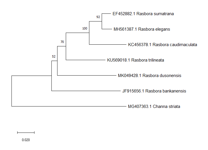 Harapan forest is the remaining lowland tropical forest in Sumatra which represents about 20 percent of the biodiversity on the island of Sumatra. There are several Rasbora species found in the Sungai Kapas Tengah River Refuge in the Harapan Jambi Forest that the relationship is not yet known.This research aims to know kinship and genetic distance several species of Rasbora from Sungai Kapas Tengah, Hutan Harapan Jambi. The method in this research using secondary data from the NCBI website ((National Center for Biotechnology Information). The data taken, namelynucleotide sequence from the Cytochrome Oxidase I (COI) gene in mitochondrial DNA. The Rasbora species analyzed were Rasbora from identification results in the Sungai Kapas Tengah River Refuge, Harapan Jambi Forest, consisting of, Rasbora bankanensis, R. caudimaculata, R. cf. sumatrana, R. dusonensis, R. elegans, R. sumatrana, and R. trilineata. Based on phylogenetic analysis, the location of the branch length in each Rasbora species, the closest kinship is owned byR. sumatrana and R. elegans species. Based on the results of genetic distance analysis, the closest genetic distance was the species R. elegans and R. sumatrana, with a distance value of 0.023 (2.3%). While the farthest genetic distance between R. bankanensis and R. caudimaculata, with a distance value of 0.172 (17.2%).Based on research results It can be concluded that R. bankanensis has a greater kinship and genetic distance value than other Rasbora species, so that this species forms a separate group. Meanwhile, 5 other species have kinship and the value of close genetic distance so that these species are united in the same group. For future researchers, it is hoped that some additional families of fish species will be analyzed for phylogenetic analysis in Sungai Kapas, Hutan Harapan Jambi, so that they can find out the relationship of several other species.