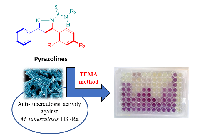 Two series of new 3,5-disubstituted-pyrazole-1-carbothioamides (4a-f and 5a-e) were designed and synthesized through condensation reaction between chalcones and thiosemicarbazides under alkaline condition via cyclocondensation reaction. The structures have been elucidated by Fourier-transform infrared (FTIR), High-resolution mass spectrometry (HRMS), one- and two-dimensional nuclear magnetic resonance (NMR) analyses. These compounds were assayed for in vitro anti-tuberculosis activity against Mycobacterium tuberculosis H37Ra using the Tetrazolium microplate assay (TEMA) method. As a result, six compounds (i.e., 4a, 4d, 4f, 5a, 5c, and 5d) showed a weak activity with minimum inhibition concentration (MIC) between 650–530 μM, and other compounds showed no inhibition against MTB. In addition, all tested compounds also did not show any cidal effects for minimum bactericidal concentration (MBC), even at the highest test concentration.