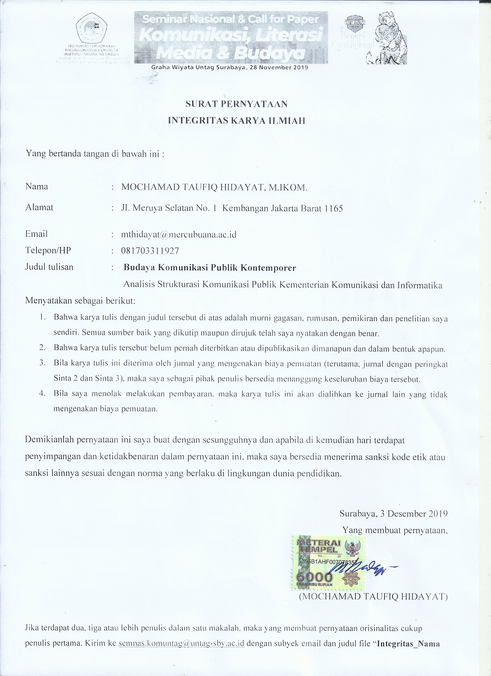 AbstractThis article higlights government public communication as the prioritize for the public and citizens interests of government activities. Even there are no clear boundaries regarding the approach, tactics, process and benchmarks, yet to be define the successfull public communication activities. With the structuration approach, this study dissects the public communication approach the current framework of government communication institutional. The analysis was carried out in the institutional context of the Ministry of Communication and Information which legally has a formal role in government public relations communication. Readings on the culture of public communication show that the communication scope are an activities of information packaging also selective approaches to provide credible, fast-easily accessible information, developing synergies and information exchanges between institutions and the public. There is a culture gap of public communication forms because government own perspective in understanding the relationship between citizens and the state vis a vis government apparatus. In the future, there is a challenge for public relationspractitioners to create an environment of friendly public opinion (favorable).Keywords: Public communication, Communication culture, Government public relationsAbstraksiKomunikasi publik pemerintah menjadi sorotan, pasalnya aktivitas komunikasi kepada publik dan warga negara dinilai beberapa pihak belum mengedepankan kepentingan publik. Namun demikian, belum ada batasan yang jelas tentang pendekatan, taktik, proses dan tolok ukur keberhasilan aktvitas komunikasi publik. Dengan pendekatan strukturasi, studi ini membedah pendekatan komunikasi publik dalam kerangka kelembagaan komunikasi pemerintah saat ini. Analisis dilakukan dalam konteks kelembagaan Kementerian Komunikasi dan Informatika yang secara legal formal memiliki tugas dan peran dalam komunikasi kehumasan pemerintah. Pembacaan atas budaya komunikasi publik menunjukkan bahwa peran komunikasi mencakup pengemasan informasi, pendekatan selektif dalam penyediaan informasi yang kredibel, cepat dan mudah diakses, dan mengembangkan sinergi promosi pertukaran informasi antarlembaga dan masyarakat. Budaya komunikasi publik lebih dipengaruhi oleh cara pandang lembaga pemerintah dalam memahami hubungan antara warga negara dengan negara vis a vis aparatus pemerintah. Sementera, ke depan ada tantangan praktisi kehumasan pemerintah untuk bekerja menciptakan lingkungan opini publik yang bersahabat (favorable).Kata Kunci: Komunikasi publik, Budaya komunikasi, Kehumasan pemerintah