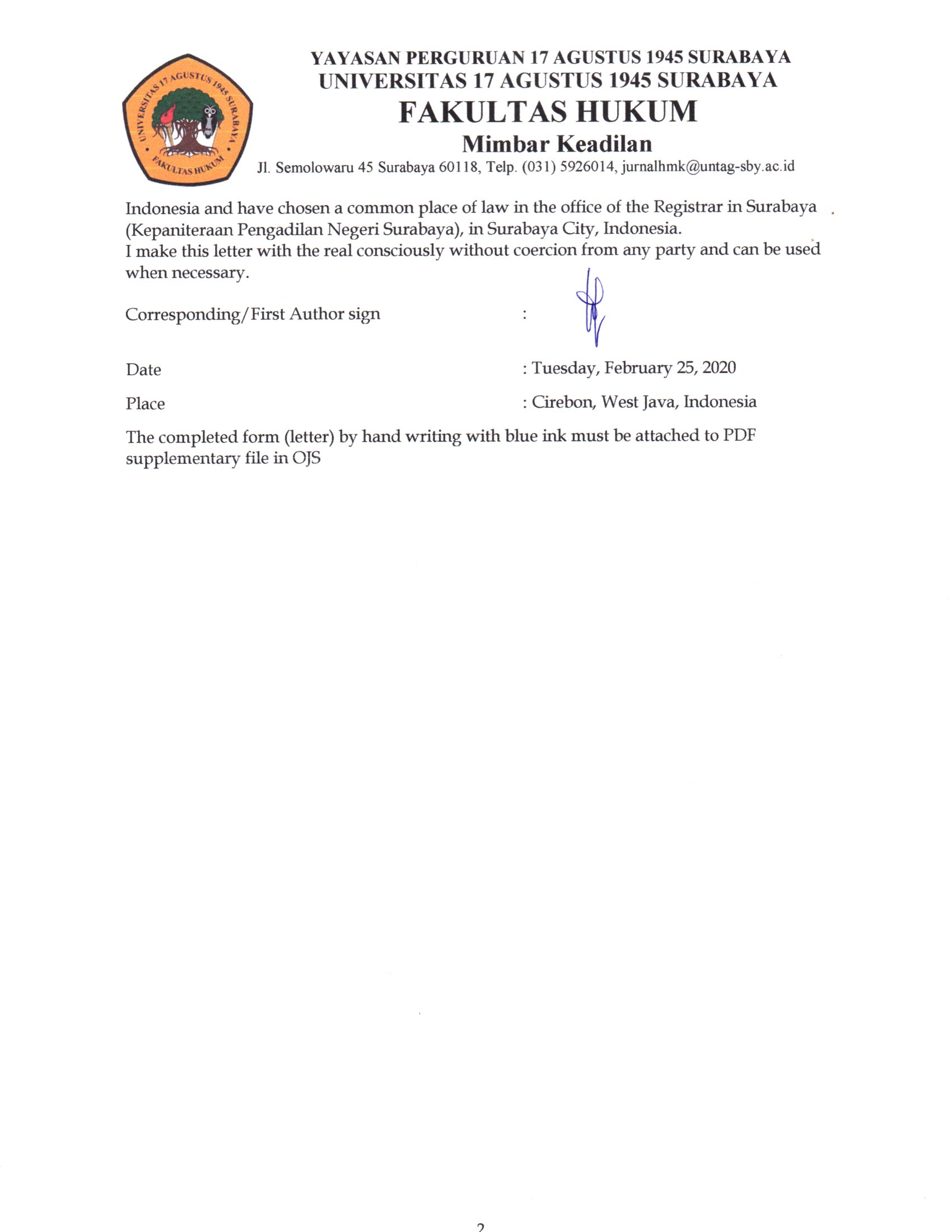 Publisher : Faculty of Law, Universitas 17 Agustus 1945 Surabaya