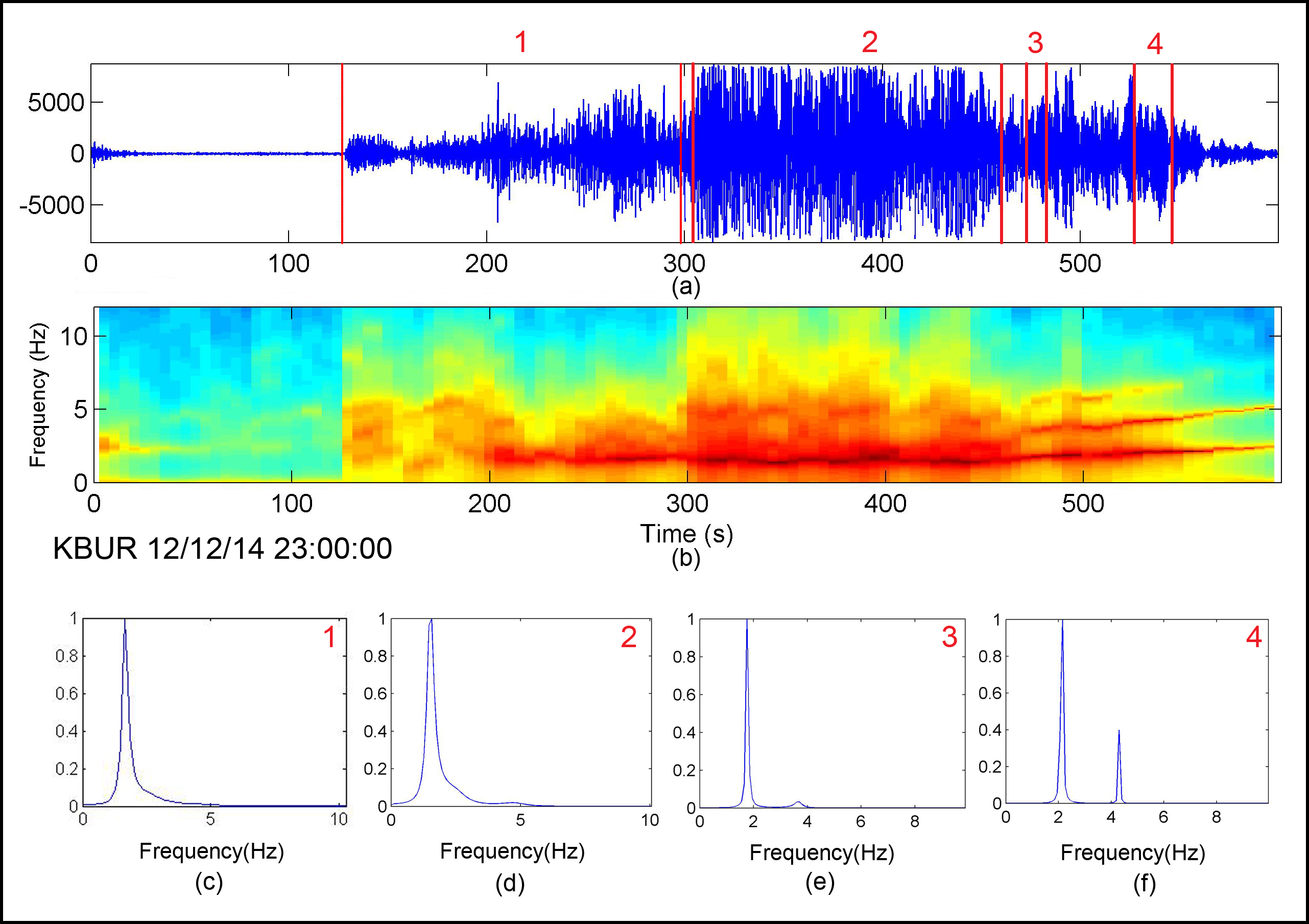 DOI: 10.17014/ijog.5.1.13-21The seismic activity of Raung Volcano was raised on 11 November 2014. As many as 1709 tremors were recorded followed by continuous tremors appearing in late November 2014. Quasi-harmonic and gliding tremors appeared in a spectrogram on 12 November 2014. The quasi-harmonic tremors refer to tremors that have no fully harmonic form in spectrum. The gliding harmonic tremors refer to harmonic tremors that have frequency jumps with either positive or negative increment. After signal restitution processing, the Maximum Entropy Spectral Analysis (MESA) method was applied in Raung recordings resulting the spectrum and the spectrogram of tremors. The quasi-harmonic tremors have the monotonic spectrum in its head and centre segment, and the harmonic one in its tails. There are twenty-four spectrums that show frequency changes between the monotonic and harmonic. The similarity between the fundamental frequency range of the monotonic and harmonic ones suggests that both signals are excited from a common resonator. The alternating of monotonic and harmonic respectively over this period is qualitatively similar with Julian’s synthetic time series about the nonlinear oscillator model. It is suggested that Raung Volcano magma pressure is sizeable to make a chaotic vibration. A pressure increasing in Raung magmatic conduit causes the increasing of P-wave velocity and makes a positive gliding frequency.