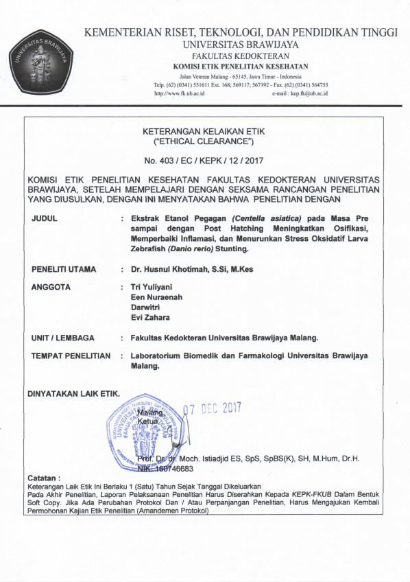 Centella Asiatica (Linn) Urban is known as Gotu Kola. Centella Asiatica (CA) is rich in micro and macronutrients. The aim of this study was to investigate the effect of ethanol extract of CA on bone ossification and body length in zebrafish larva stunting model at 9 dpf. This study used zebrafish at 2 hpf (hour post-fertilization) - 9 dpf (day post-fertilization). The population of 300 larvae divided into 5 groups consisting of control group, rotenone group (exposed by 12.5 ppb of rotenone) and 3 rotenone+CA groups that exposed to CA extract for 4, 5 and 6 days, respectively. The CA extract was obtained by maceration method with ethanol solvent. The results showed that rotenone 12,5 ppb able to inhibit the growth of larvae >2SD of body length and decrease bone ossification at rotenone group, were significantly different from the control group. Administration of CA extract was increased expression of cartilage at rotenone+CA5 as well rotenone+CA6 group and increase expression of bone at the rotenone+CA5 group and also increase body length rotenone+CA groups significantly different from rotenone group. It can be concluded that the period of CA extract exposure can correct the length of the body reaching 99.6% at 9 dpf and increased bone ossification in a time-dependent manner.Centella asiatica (Linn) Urban dikenal dengan nama pegagan. Centella Asiatica (CA) kaya akan mikro maupun makro nutrisi yang diperlukan bagi tubuh terutama masa pertumbuhan. Penelitian ini bertujuan mengetahui efek ekstrak etanol CA terhadap osifikasi tulang dan panjang badan larva zebrafish model stunting yang diinduksi rotenone pada 9 hari post fertilisasi. Penelitian ini menggunakan zebrafish mulai 2 hpf (hour post fertilisation) - 9 dpf (day post fertilisation), populasi larva sejumlah 300 yang dibagi 5 kelompok yang terdiri dari kelompok kontrol, kelompok rotenon (dipapar rotenone 12,5 ppb) dan 3 kelompok rotenone+CA yang diberikan pegagan selama 4, 5 dan 6 hari secara berurutan. Ekstrak CA diperoleh melalui metode maserasi dengan pelarut etanol. Hasil penelitian menunjukkan bahwa rotenone dapat menghambat pertumbuhan panjang larva >2SD dan menurunkan osifikasi tulang pada kelompok rotenon secara signifikan dibanding kontrol. Pemberian ekstrak CA dapat meningkatkan ekspresi tulang rawan kelompok rotenone+CA5 maupun rotenone+CA6 dan meningkatkan ekspresi tulang keras kelompok rotenone+CA5 serta meningkatkan panjang badan kelompok rotenone_CA secara signifikan dibanding kelompok rotenone. Dapat disimpulkan bahwa lamanya pemberian ekstrak CA dapat meningkatkan osifikasi tulang dan meningkatkan panjang badan mencapai 99.6% pada 9 dpf.