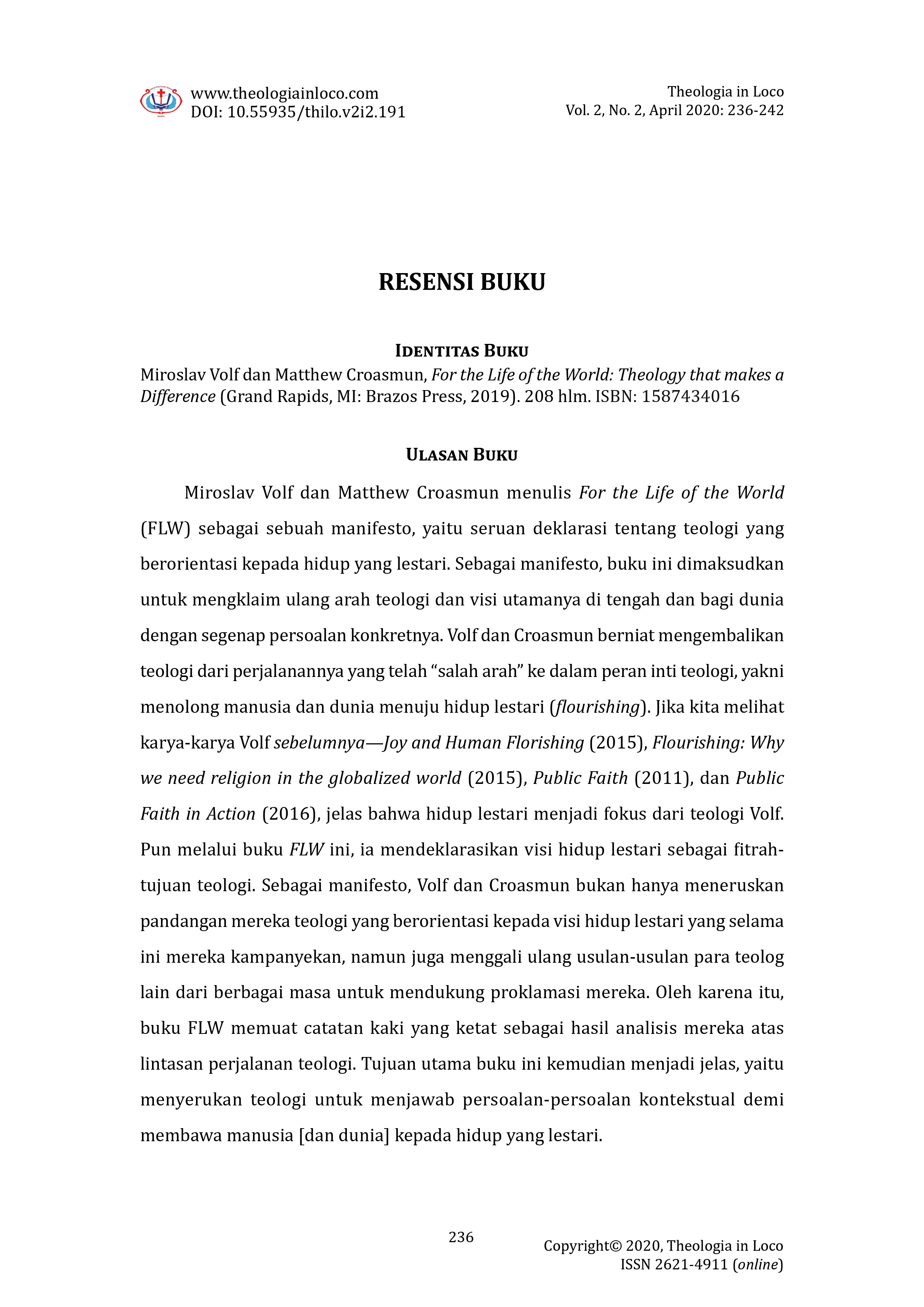 Miroslav Volf dan Matthew Croasmun, For the Life of the World: Theology that Makes A Difference. Grand Rapids, MI: Brazos Press, 2019. 208 hlm. ISBN: 1587434016 Kurniawan, Danang