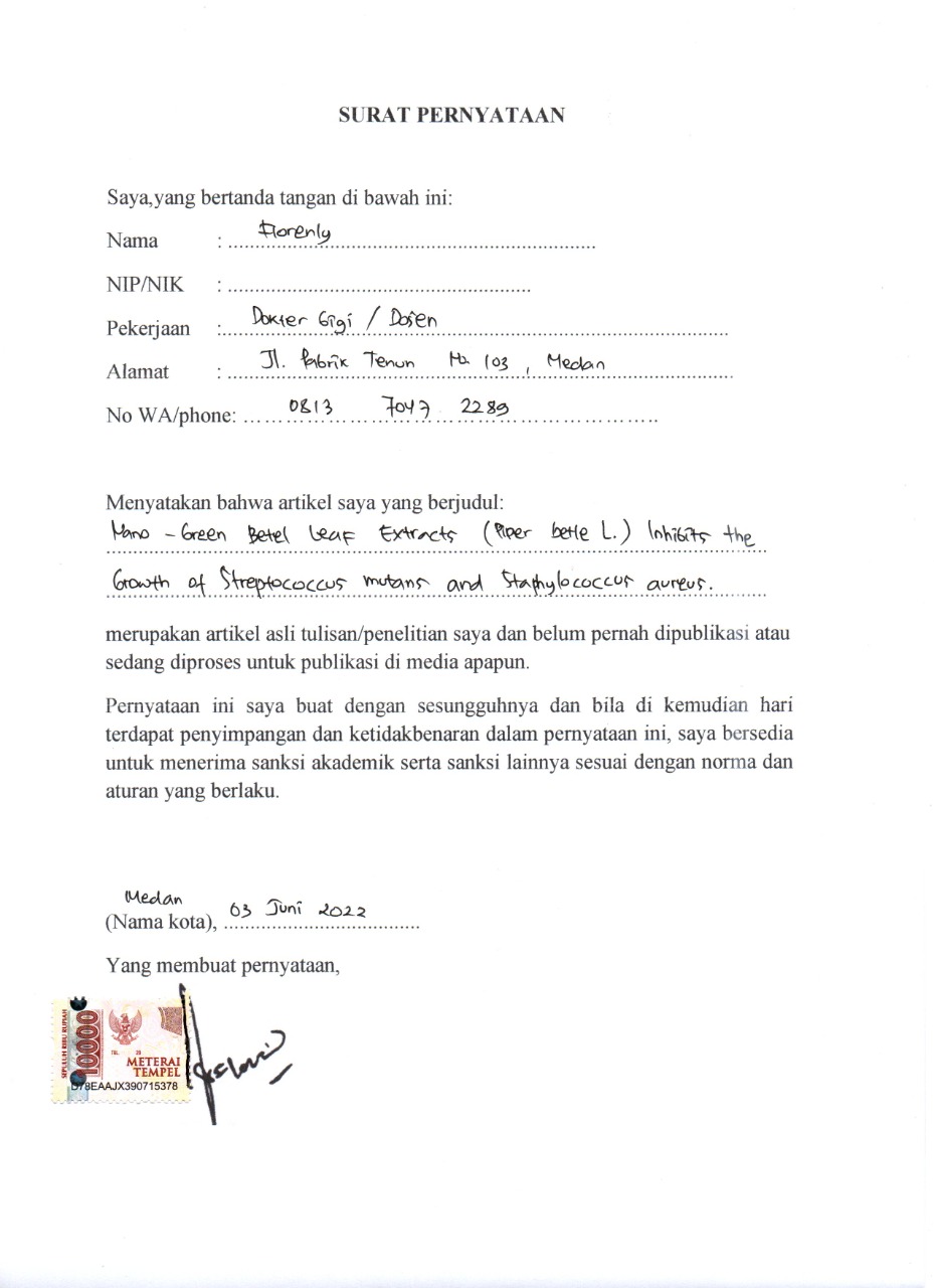 Nano-Green Betel Leaf Extracts (Piper betle L.) Inhibits the Growth of Streptococcus mutans and Staphylococcus aureus Florenly Florenly; Novelya Novelya; Mizeli Janiar; Miranda Miranda; Le Quang Phan Dang Hai; Phan Minh Quang