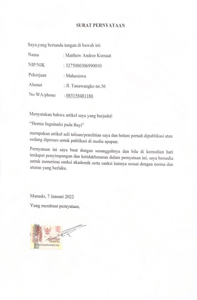 Abstract: Inguinal hernia in infant is a condition of protrusion of the intestinal organs due to thepatency of processus vaginalis. The ratio of incidence between male and female infants isapproximately 8:1. The incidence of inguinal hernia ranges from 1-5% in children and full-terminfants, whereas in premature infants there is a significant increase in the number, which is around30%. Clinical manifestations that can occur in infants with inguinal hernias are the appearance ofa lump when straining, crying, coughing, or sneezing, patient could look restless because of thepain and discomfort. The diagnosis of inguinal hernia can be made by history taking, physicalexamination, and supporting examination. Management of inguinal hernia is by surgery, can bean open herniotomy or laparoscopy.Keywords: inguinal hernia; infant Abstrak: Hernia inguinalis pada bayi merupakan kondisi penonjolan organ intestinal akibatadanya patensi prosesus vaginalis. Perbandingan rasio kejadian antara anak laki-laki dan perempuankurang lebih sekitar 8:1. Insidensi hernia inguinalis berkisar 1-5% pada anak dan bayi cukupbulan, sedangkan pada bayi prematur terdapat kenaikan angka yang bermakna yaitu sekitar 30%.Manifestasi klinis yang dapat terjadi pada anak dengan hernia inguinalis adalah timbulnyabenjolan pada saat mengedan, menangis, batuk, atau bersin, anak terlihat gelisah karena nyeri danrasa tidak nyaman. Penegakan diagnosis hernia inguinalis dapat dilakukan dengan anamnesis,pemeriksaan fisik, dan pemeriksaan penunjang. Tatalaksana hernia inguinalis ialah denganherniotomi terbuka atau laparoskopi.Kata kunci: hernia inguinalis; bayi
