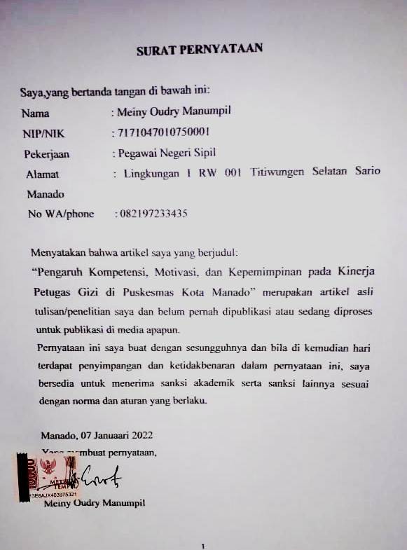 Abstract: Achieving good performance needs to be supported by qualified human resources. Factors that affect performance include competence, motivation, and leadership. This study aimed to determine the relationship between competence, motivation, and leadership with the performance of health workers at public health center. This was a quantitative study. The population consisted of all nutrition workers at public health centers in Manado totaling 48 people; all of them were samples of this study. Data were analyzed by using the Pearson product moment test and the multiple linear regression test. The results showed that the mean of competence variable was 19.69; of motivation variable was 103.2; of leadership variable was 44.19; and of performance variable was 103.02. The Pearson product moment test resulted in p=0.020 for the correlation between competence and performance; p=0.012, for the correlation between motivation and performance; and p=0.200, for the correlation between leadership and performance. The multiple linear regression test showed that motivation had the strongest relationship with performance (p=0,018). In conclusion, there are significant relationships between competence and motivation with performance. Motivation has the strongest relationshipwith performance.Keywords: competence; motivation; leadership; performanceAbstrak: Pencapaian kinerja yang baik perlu didukung oleh sumber daya manusia yang berkualitas. Faktor yang memengaruhi kinerja di antaranya faktor kepemimpinan, faktor pribadi meliputi motivasi, disiplin, keterampilan, faktor sistem, dan faktor situasional atau lingkungan kerja. Penelitian ini bertujuan untuk mengetahui hubungan antara kompetensi, motivasi, dan kepemimpinan dengan kinerja petugas gizi di puskesmas. Jenis penelitian ialah kuantitatif.Populasi ialah seluruh petugas gizi di puskesmas Kota Manado.berjumlah 48 orang dengan populasi total sebagai sampel. Analisis statistik yang digunakan ialah uji Pearson product moment dan uji regresi linier berganda. Hasil penelitian mendapatkan rerata kompetensi 19,69, rerata motivasi 103,2, rerata kepemimpinan 44,19, dan rerata kinerja 103,02. Hasil uji Pearson productmoment menunjukkan nilai p=0,020 untuk korelasi antara kompetensi dengan kinerja; p=0,012 untuk korelasi antara motivasi dengan kinerja; dan p=0,200 untuk korelasi antara kepemimpinan dengan kinerja. Hasil uji regresi linier berganda menunjukkan bahwa variabel motivasi yang paling erat hubungannya dengan kinerja. Simpulan penelitian ini ialah terdapat hubungan bermakna antara kompetensi dan motivasi dengan kinerja petugas gizi di puskesmas. Mottivasi memiliki hubungan yang paling erat dengan kinerja.Kata kunci: kompetensi; motivasi; kepemimpinan; kinerja