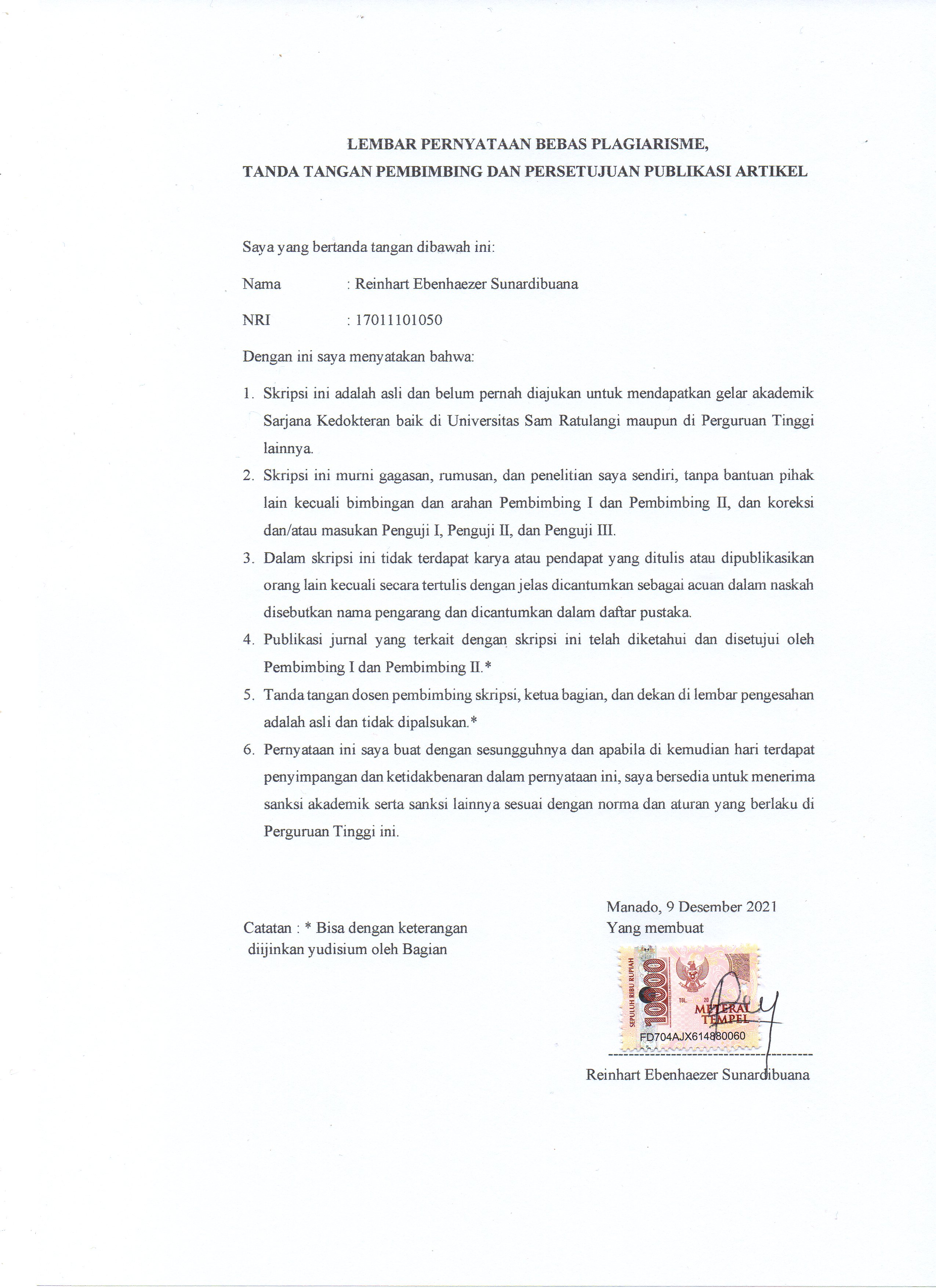 Abstract: Sharp violence is an action resulting in injuries to the body surface caused by sharp objects that are commonly found around us, such as knive, razor, and even axe. Sharp violence that causes the victim to lose his/her life becomes a criminal act or a crime against life (murder). According to Biro Pengendalian Operasi, Mabes Polri in 2018 concerning the number of murders in Indonesia, North Sulawesi was in the sixth place. This study aimed to describe the pattern of sharp violent injuries among cases of death victims at the Bhayangkara Hospital Level III Manado during the period July 2019 - June 2021. This was a retrospective and descriptive study using Visum et Repertum data. The results obtained 22 cases of death victims due to sharp violence. Most cases occurred in the period of July 2019 - June 2020 as many as 19 cases (86.4%). The most frequent age group was 21-30 years with eight cases (36.4%), followed by age group 17-20 years (36.4%), and age goups 31-40 years and >50 years (each of 18.2%). Male dominated female cases (18 cases/81.8% and 1 case/18.2%). Type of wound  was 100% as stab wound. The location of the most injuries was on the left chest which was 13 victims (59%). In conclusion, cases of violent death were mostly male, aged around 21-30 years old, with a stab wound on the left chest.Keywords: wound pattern; sharp violence Abstrak: Kekerasan tajam merupakan tindakan yang mengakibatkan luka pada permukaan tubuh disebabkan oleh benda tajam yang umum ditemukan, seperti pisau, silet, bahkan kapak. Kekerasan tajam yang menyebabkan korban kehilangan nyawa menjadi suatu tindak pidana kriminal atau kejahatan terhadap nyawa (pembunuhan). Laporan Biro Pengendalian Operasi, Mabes Polri pada tahun 2018 menyatakan bahwa Sulawesi Utara berada di urutan keenam. Penelitian ini bertujuan untuk mengetahui gambaran pola luka kekerasan tajam pada kasus kematian di RS Bhayangkara Tingkat III Manado periode Juli 2019-Juni 2021. Jenis penelitian ialah deskriptif retrospektif dengan menggunakan data Visum et Repertum. Hasil penelitian mendapatkan 22 kasus kematian korban kekerasan tajam. Kasus kematian terbanyak terjadi pada periode Juli 2019-Juni 2020 yaitu 19 kasus (86,4%). Kelompok usia terbanyak yaitu 21-30 tahun sebanyak delapan kasus (36,4%), diikuti kelompok usia 17-20 tahun (36,4%), serta 31-40 tahun dan >50 tahun (masing-masing 18,2%). Jenis kelamin didominasi oleh laki-laki (18 kasus/81,8% dan 1 kasus/18,2%). Jenis luka merupakan 100% luka tusuk. Lokasi perlukaan terbanyak di dada sebelah kiri yaitu 13 orang (59%). Simpulan penelitian ini ialah kasus kematian kekerasan tajam sebagian besar berjenis kelamin laki-laki, berusia 21-30 tahun, dengan jenis luka tusak pada dada kiri.Kata kunci: pola luka; kekerasan tajam