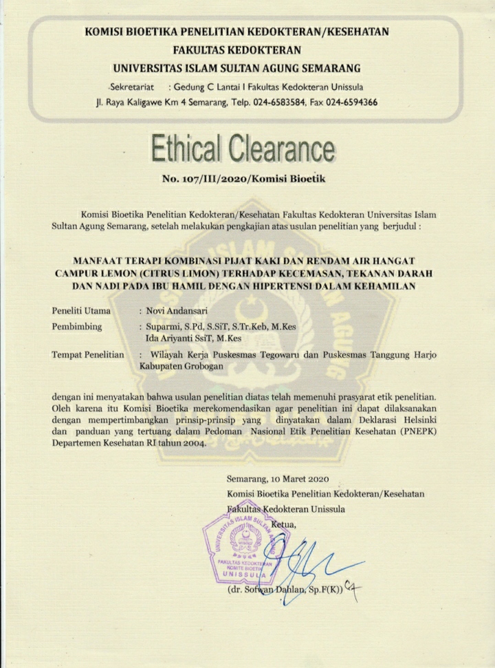 Teenagers experience menstruation at the age of 12-13 years old. This is a physiological process experienced because this age the reproductive organs mature which have an important role for physical and psychological well. Things that affect menstrual disorders are stress levels, hormonal, high and low BMI, diet, nervous system, changes in vascularization, psychology, chronic disease, physical activity and drug consumption. The purpose of this study was to determine the Relationship between Nutritional Value, Diet, Physical Activities, and Stress with Menstrual Cycle Disorders toward Teenagers at SMA N 1 Parakan. This research was conducted in the Parakan. This type of research is an analytic study using a cross-sectional. The research population is young women in SMA N 1 Parakan. The sampling technique is by using random sampling technique. The research sample was 67 respondents using the formula for sampling size. The results showed that most of the respondents had normal Nutritional Value as many 21 respondents (31.3%), moderate eating patterns as many 29 (43.3%), light physical activity levels as many 29 (43.3%), moderate stress levels as many 22 respondents (32.8%) and regular menstrual cycles as many 47 (70.1%). The results of the chi-square test showed a relationship between nutritional value and the menstrual cycle with a p-value of 0.036<0.05, there was a relationship between diet and the menstrual cycle with a p-value of 0.047<0.05, there was a relationship between the level of physical activity and menstrual cycle with a p-value of 0.044<0.05, and the relationship between stress levels and the menstrual cycle with a p-value of 0.035<0.05. The results of this study are expected that young women pay more attention to the menstrual cycle and pay attention to things that can affect the menstrual cycle. Abstrak Remaja mengalami menstruasi pada usia 12-13 tahun. Hal ini adalah proses fisiologis yang dialami karena pada usia ini terjadi kematangan organ reproduksi yang memiliki sebuah peranan penting untuk kesejahteraan fisik maupun psikologis. Hal yang mempengaruhi gangguan menstruasi yaitu tingkat stres, kadar hormonal, tinggi rendahnya IMT, pola makan, sistem syaraf, perubahan vaskularisasi, psikologi, penyakit kronis, aktivitas fisik dan konsumsi obat. Tujuan dalam penelitian ini yaitu mengetahu hubungan antara status gizi, pola makan, aktivitas fisik dan stress dengan gangguang siklus menstruasi pada remaja putri di SMA N 1 Parakan.Penelitian ini dilakukan di wilayah Parakan. Jenis penelitian ini merupakan penelitian analitik dengan menggunakan desain cross-sectional. Populasi penelitian adalah remaja putri di SMA N 1 Parakan. Teknik pengambilan sampel yaitu dengan menggunakan tehnik random sampling. Sampel penelitian 67 responden dengan menggunakan rumus besaran sampling. Hasil penelitian menunjukkan sebagian besar responden memiliki status gizi normal sebanyak 21 responden (31,3%), pola makan cukup sebanyak 29 (43,3%), tingkat aktivitas fisik ringan sebanyak 29 (43,3%), tingkat stres sedang sebanyak 22 responden (32,8%) dan siklus menstruasi teratur sebanyak 47 (70,1%). Hasil uji chi-square didapatkan hubungan antara status gizi dengan siklus menstruasi dengan p-value sebesar 0,036<0,05, ada hubungan antara pola makan dengan siklus menstruasi dengan p-value sebesar 0,047<0,05, ada hubungan antara tingkat aktivitas fisik dengan siklus menstruasi dengan p-value sebesar 0,044<0,05, dan hubungan antara tingkat stres dengan siklus menstruasi dengan p-value sebesar 0,035<0,05. Hasil penelitian ini diharapakan agar remaja putri lebih memperhatikan siklus menstruasi dan memperhatikan hal yang dapat mempengaruhi siklus menstruasi.
