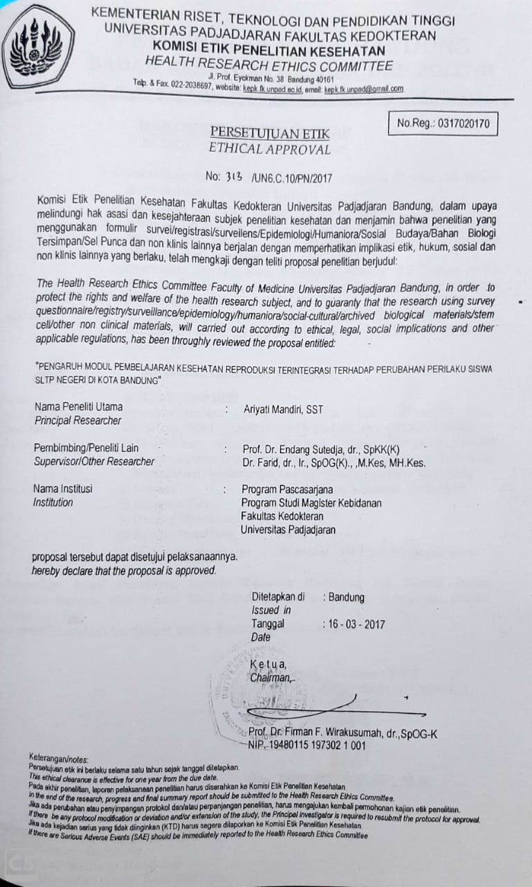 Socio-cultural changes, low understanding of religion, development of information technology, and limitation of appropriate information sources, causes sexual and reproductive behavior problems in adolescents. The solutions are through the application of an integrated reproductive health module as a teaching guide for teachers by using student center learning approach. The objectives of this study are to analyze the implementation effect of an integrated reproductive health module on changes in student behavior. This study using a quasi-experimental pretest-posttest design with control groups, which conducted from March to May 2017. The subject in this research is the students of class VII in 5 (five) Bandung city areas by inclusion and exclusion criteria. A total of 36 students from the five junior secondary schools as the research group received an integrated learning module, while 38 students from different classes in the same school as the control group using the reproductive health module based on the 2013 Curriculum. The data collection used questionnaires to assess behavior based on self-assessment, friends, and parents. The results of this study indicate that the interpersonal communication behavior increased by 5.74%, reproductive health behavior increased by 18.65%, and sexual behavior increased by 9.07%, with a significant difference compared to students who received the 2013 Curriculum (p<0.001). In conclusion, the implementation of the integrated reproductive health module had affected the student behavior change in maintaining reproductive health, sexual, and interpersonal communication. PENGARUH PENERAPAN MODUL PEMBELAJARAN KESEHATAN REPRODUKSI TERINTEGRASI TERHADAP PERUBAHAN PERILAKU SISWA SEKOLAH MENENGAH PERTAMAPerubahan sosial budaya, pemahaman agama yang rendah, perkembangan teknologi informasi, dan keterbatasan sumber informasi yang tepat menyebabkan permasalahan perilaku seksual dan kesehatan reproduksi pada remaja. Salah satu upaya yang dilakukan adalah melalui penerapan modul kesehatan reproduksi terintegrasi sebagai pedoman mengajar bagi guru dengan menggunakan pendekatan student center learning. Tujuan penelitian ini menganalisis pengaruh implementasi modul pembelajaran kesehatan reproduksi terintegrasi terhadap perubahan perilaku siswa. Penelitian ini menggunakan quasi-experimental pretest-posttest design with control groups yang dilakukan dari bulan Maret hingga Mei 2017. Subjek penelitian adalah siswa kelas VII di 5 (lima) wilayah Kota Bandung dengan kriteria inklusi dan eksklusi. Sebanyak 36 siswa dari lima sekolah menengah pertama sebagai kelompok perlakuan mendapatkan modul kesehatan reproduksi terintegrasi dan 38 siswa dari kelas yang berbeda di sekolah yang sama sebagai kelompok kontrol menggunakan materi kesehatan reproduksi berdasar atas Kurikulum 2013. Pengumpulan data menggunakan kuesioner penilaian perilaku oleh diri sendiri, teman, dan orangtua. Hasil menunjukkan bahwa perilaku komunikasi interpersonal siswa meningkat 5,74%, perilaku menjaga kesehatan reproduksi meningkat 18,65%, dan perilaku seksual sehat siswa meningkat 9,07% dengan perbedaan yang signifikan dibanding dengan siswa yang mendapatkan Kurikulum 2013 (p<0,001). Simpulan, penerapan modul pembelajaran kesehatan reproduksi terintegrasi berpengaruh terhadap perubahan perilaku kesehatan reproduksi siswa.
