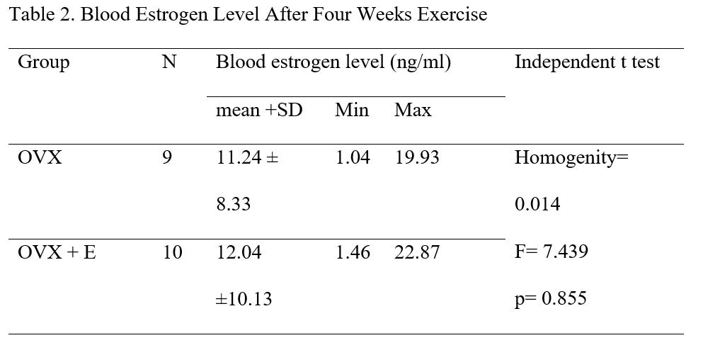 Estrogen is a hormone which is related to lipid oxidation, lypogenesis inhibition, and lipolysis rate. The purpose of this study was to determine the effect of moderate intensity exercise on body weight and blood estrogen level in ovarectomized mice (ovx). The study was held in the Laboratory of Biochemistry, Faculty of Medicine Universitas Airlangga during the period of April to May 2017 on old nineteen 3-4 months old female mice, , 20-30 grams of weight, which were divided into two groups: OVX (n=9, ovx without exercise) and OVX+E (n=10, ovx and moderate intensity exercise). Moderate intensity exercise in this study included swimming, three times a week at 3 pm for four weeks using a 6% of body weight load. Experiment data were analyzed by paired t-test and independent t-test using SPSS. The average body weights of the OVX group were 26.44 ± 1.94 grams and 29.89 ± 2.62 gram at pretest and posttest, respectively., while for the OVX+E group, the weights were 26.50 ± 2.59 grams and 26.40 ± 2.07 grams. There were asignificant intergroup body weight differences (?OVX= 3.44 ± 2.55 gram and ?OVX+E= -1.00 ± 1.37 gram) with p=0.004. Blood estrogen level in OVX+E (12.04 ±10.13 ng/ml) was higher than in control (OVX= 11.24 ± 8.33 ng/ml); however, the difference was not significant (p=0.855). Moderate intensity exercise reduces body weight, without any significant increase in blood estrogen level. Hence, the body weight loss is not caused by estrogen, which may be due to the short period of exercise in this study that the estrogen has not had the time to increase.Pengaruh Olahraga Intensitas Sedang terhadap Berat Badan dan Kadar Estrogen Darah pada Mencit Ovariektomi Estrogen merupakan hormon yang berperan pada oksidasi lipid, kecepatan lipolisis, dan hambatan lipogenesis. Penelitian bertujuan mengetahui pengaruh olahraga intensitas sedang terhadap berat badan dan kadar estrogen darah pada mencit ovariektomi (ovx). Penelitian dilaksanakan di Laboratorium Biokimia Fakultas Kedokteran Universitas Airlangga, April?Mei 2017. Sejumlah 19 mencit betina berusia 3?4 bulan, berat 20?30 gram, dibagi menjadi dua kelompok: OVX (n=9, ovx tanpa perlakuan) dan OVX+E (n=10, ovx dengan olahraga intensitas sedang). Olahraga intensitas sedang dilakukan dengan renang, tiga kali seminggu pukul 15.00 WIB selama empat minggu dengan beban 6% dari berat badan. Data dianalisis dengan paired t-test dan independent t-test SPSS. Berat badan OVX pra-tes 26,44±1,94 gram dan pascates 29,89±2,62 gram. Berat badan OVX+E pra-tes 26,50±2,59 gram dan pascates 26,40±2,07. Terdapat perbedaan bermakna berat badan antarkelompok (?OVX= 3,44±2,55 gram and ?OVX+E= -1,00±1,37 gram), p=0,004. Kadar estrogen darah OVX+E (12,04±10,13 ng/mL) lebih tinggi daripada konrol (OVX= 11,24±8,33 ng/mL), tetapi tidak berbeda bermakna (p=0,855). Olahraga intensitas sedang menurunkan berat badan, tetapi tidak bermakna meningkatkan kadar estrogen darah. Penurunan berat badan tidak disebabkan oleh estrogen. Peningkatan estrogen belum terjadi mungin disebabkan oleh waktu yang kurang lama.