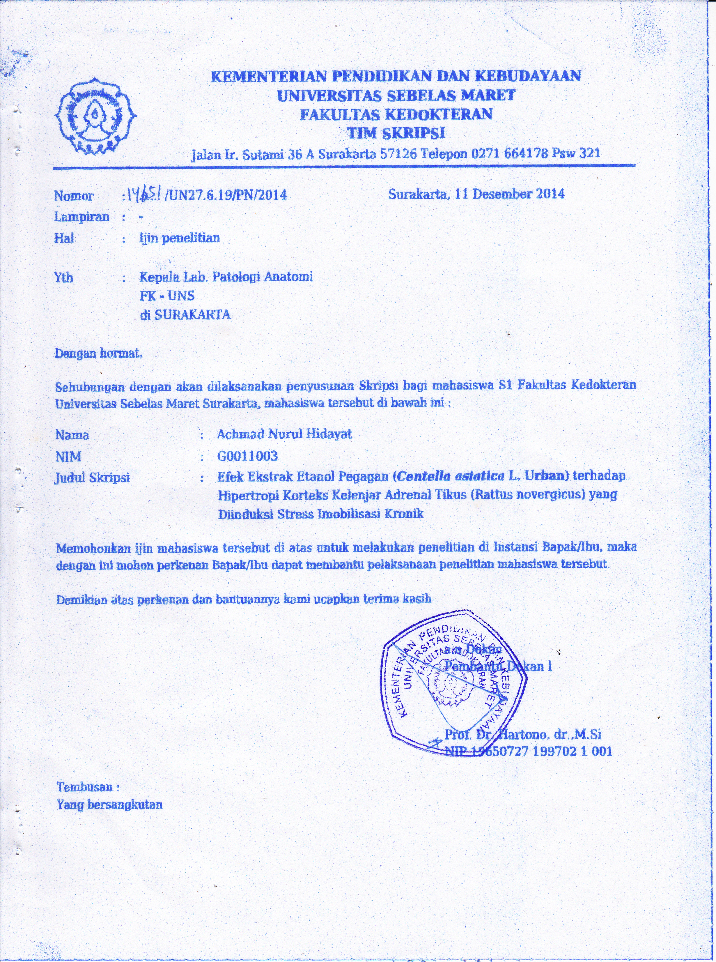 Background: Chronic stress affects the cortex changes such as hypertrophy which is caused by the physiology change of HPA (Hypothalamus-Pituitary-Adrenal) pathway. Pegagan extract contains beneficial compounds such as triterpenoid is known has antistress and antidepressant effect. This present study aims to investigate Ethanolic Extract of Centella asiatica (EEC) on cortex hyperthropy level induced by chronic immobiliztion stress in male rats. Methods: This study was laboratory experimental study with randomized post test only control group design. Paraffin blocks was processed from thirty Sprague Dawley male rats. They were previously subjected with chronic immobilization stress and then divided into 6 groups: control group given distilled water 1 mg/kg, stress + PGA (Pulvis Gummi Arabicum), stress + 150 mg/kg EEC, stress + 300 mg/kg EEC, stress + 600 mg/kg EEC and stress + fluoxetine 10 mg/kg. The treatments were performed for 21 consecutive days. Cortex hypertrophy was evaluated using ImageJ 1.48v software under light microscope from hematoxylin eosin staining. Statistic analysis was performed using Kruskall-Wallis test continued by Post Hoc Mann-Whitney Test with Bonferroni correction. Result: Kruskall-Wallis test result showed significant differences in six group with p= 0,007. Meanwhile, Mann Whitney test with Bonferroni correction did not show significant difference between stress + PGA group and other groups (p>0.05). The difference result only found between control group and stress + 300 mg/kg of EEC (p= 0,001). There were no significant difference between stress + fluoxetine 10 mg/kg and control group (p = 0,880). Conclusion: EEC was incapable to decrease cortex hypertrophy level of adrenal gland in Sprague Dawley male rats induced by chronic immobilization stress. Keywords: Centella asiatica, chronic immobilization stress, hypertrophy, adrenal glands.Â