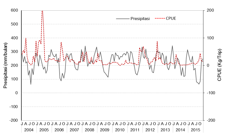 Layur telah menjadi target utama penangkapan dan dieksploitasi secara intensif di perairan Palabuhanratu menyusul permintaan ekspor yang meningkat. Kajian dilakukan untuk mengetahui kelimpahan dan faktor lingkungan yang berperan terhadap fluktuasi hasil tangkapan ikan layur. Serial data hasil tangkapan dan upaya penangkapan bulanan 2004-2015 dan serial data iklim, yaitu SST, precipitasi, Dipole Mode Index (DMI), dan Southern Oscillation Index (SOI) dalam periode waktu yang sama digunakan untuk analisis. Hasil analisis menunjukkan bahwa peningkatan signifikan upaya penangkapan yang dilakukan sampai 2007 mengakibatkan hasil tangkapan per satuan upaya (CPUE) menurun secara konstan pada tahun-tahun berikutnya. Penurunan upaya penangkapan mencapai 28,5% pada tahun 2007 tidak dapat meningkatkan CPUE secara signifikan. Berdasarkan analisis forward seletion dalam model multiregresi, diketahui bahwa faktor iklim yang berperan dalam fluktuasi hasil tangkapan adalah presipitasi serta interaksi antara DMI dan SOI.Dalam kaitan tersebut perlu dilakukan pengaturan upaya penangkapan dan memperhitungkan variabilitas iklim dalam pengelolaan sumberdaya ikan layur di Palabuhanratu.