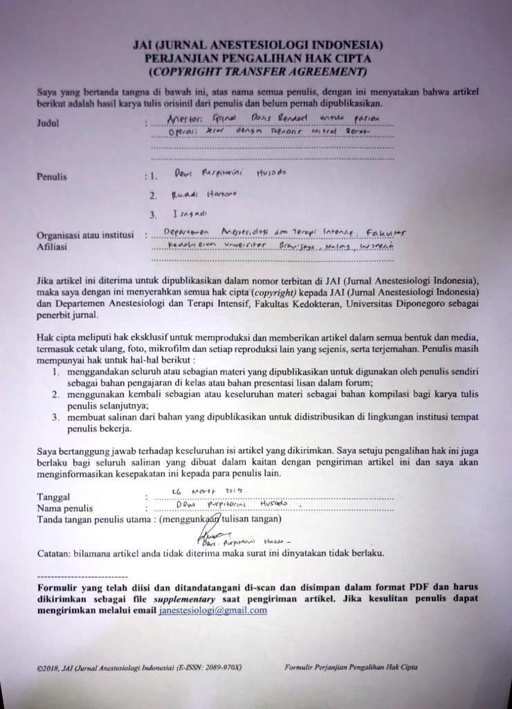 Latar belakang: Stenosis mitral banyak ditemukan pada kehamilan, dimana sekitar 25% pasien akan mengalami gejala pada kehamilan pertama. Hal ini disebabkan karena adanya peningkatan volume darah dan nadi. Beberapa literatur menyebutkan bahwa anestesi spinal dikontraindikasikan pada pasien yang akan menjalani operasi dengan kelainan stenosis mitral karena risiko terjadinya hipotensi dan takikardia.Kasus: Perempuan 24 tahun primigravida, usia kehamilan 32-34 minggu dengan stenosis mitral berat, regurgitasi mitral ringan, regurgitasi trikuspid sedang, regurgitasi pulmonal sedang (EF 62%), hipertensi pulmonal sedang (PASP 65 mmHg), gagal jantung stadium C kelas fungsional III menjalani operasi sesar dengan low dose anestesi spinal menggunakan 5 mg bupivacaine heavy 0,5% dan 50 mcg fentanyl volume total 2 ml. Blok spinal dicapai dalam waktu 5 menit. Hemodinamik stabil selama perioperatif. Tidak terjadi gagal jantung akut maupun perburukan hemodinamik pascaoperasi.Pembahasan: Prinsip pembiusan pasien dengan mitral stenosis adalah menghindari takikardia, menjaga kondisi sinus rhytm dan secara agresif mengatasi atrial fibrilasi baik farmakologis maupun dengan kardioversi terutama pada pasien dengan hemodinamik tidak stabil, menghindari penurunan SVR yang akan meningkatkan denyut jantung sehingga memperberat kerja jantung, menghindari hipovolemi, kelebihan cairan, dan faktor yang meningkatkan tekanan arteri pulmonal seperti hipoksia dan hiperkarbia maupun nyeri.Kesimpulan: anestesi spinal dosis rendah menggunakan 5 mg bupivakain dan ajuvan fentanyl dapat digunakan pada operasi operasi sesar pada pasien dengan stenosis mitral berat karena awitan yang cepat, level blok yang adekuat, durasi blok hemodinamik yang stabil dan bayi yang lahir dengan kondisi yang baik.