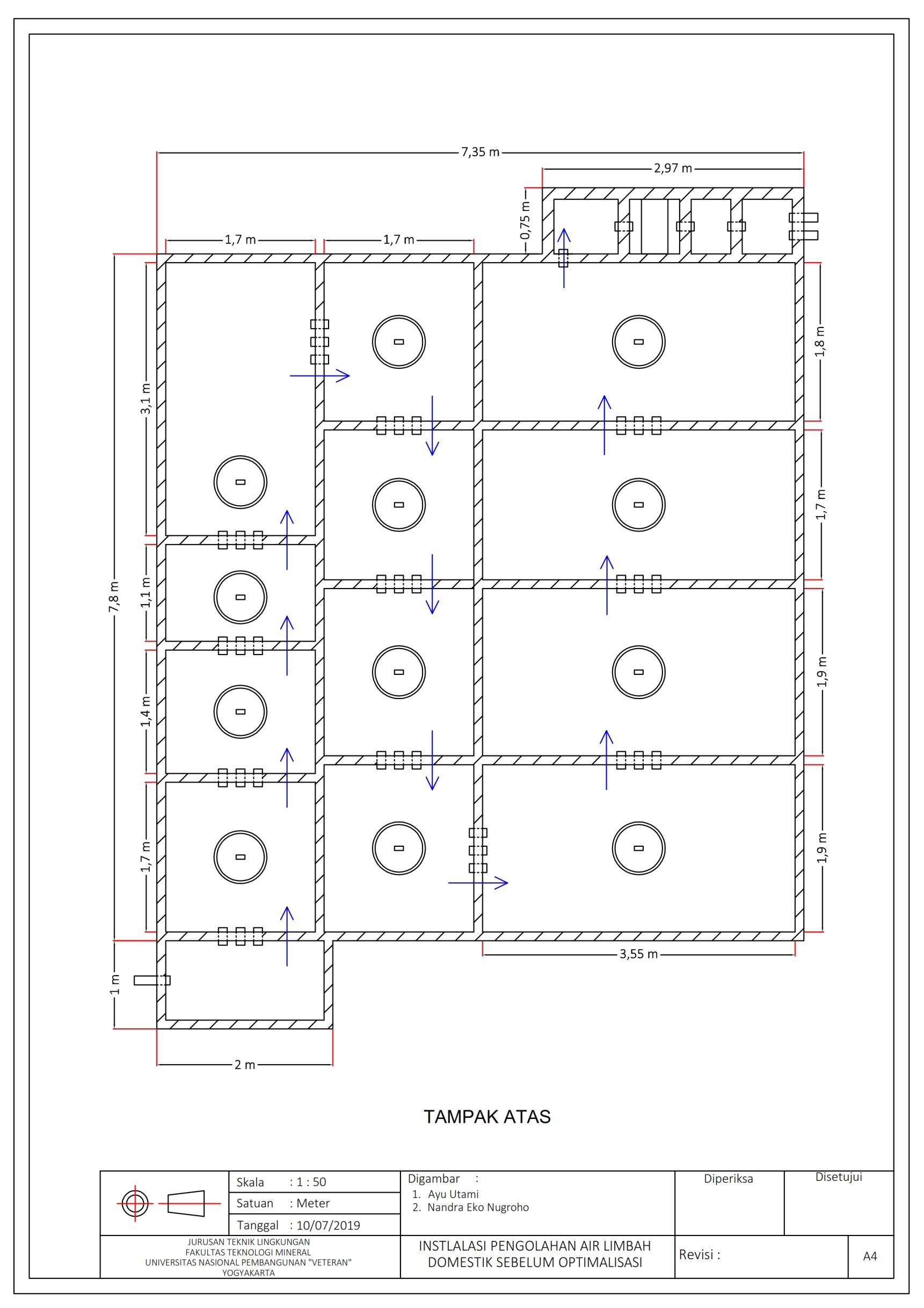 As population increases, domestic wastewater generated will increase as well. Domestic wastewater needs to be treated properly so as not to pollute the recipient's water body. Kampung Kandang already has a communal domestic wastewater treatment plant (WWTP) to treat domestic wastewater generated by citizens. The problem from the citizens is that the WWTP needs to be rehabilitated because the amount of sludge floating in the first biological treatment tank and still has a disturbing odor. Alternative solution for this problem is by rehabilitating WWTPs so that their functions are more optimal. The purpose of this study was to evaluate domestic wastewater in Kampung Kandang. The methods used in evaluating the wastewater i.e. analysis of primary data, calculation of standard stream evaluation and calculation of removal percentage. Communal Domestic WWTP needs to remove COD, BOD, TSS, Ammonia, and Total Coliforms parameters of 97.7%, 98.9%, 42.7%, 95.6%, and 99.9%. WWTP has already removed the TSS and ammonia. BOD, COD, and total coliform should be reduced by WWTP as much for each parameter are 25, 9%, 35%, and 95, 83%. Wastewater evaluation data can be used as a basis for the design of rehabilitation to be carried out at the Communal Domestic WWTP in Kampung Kandang.