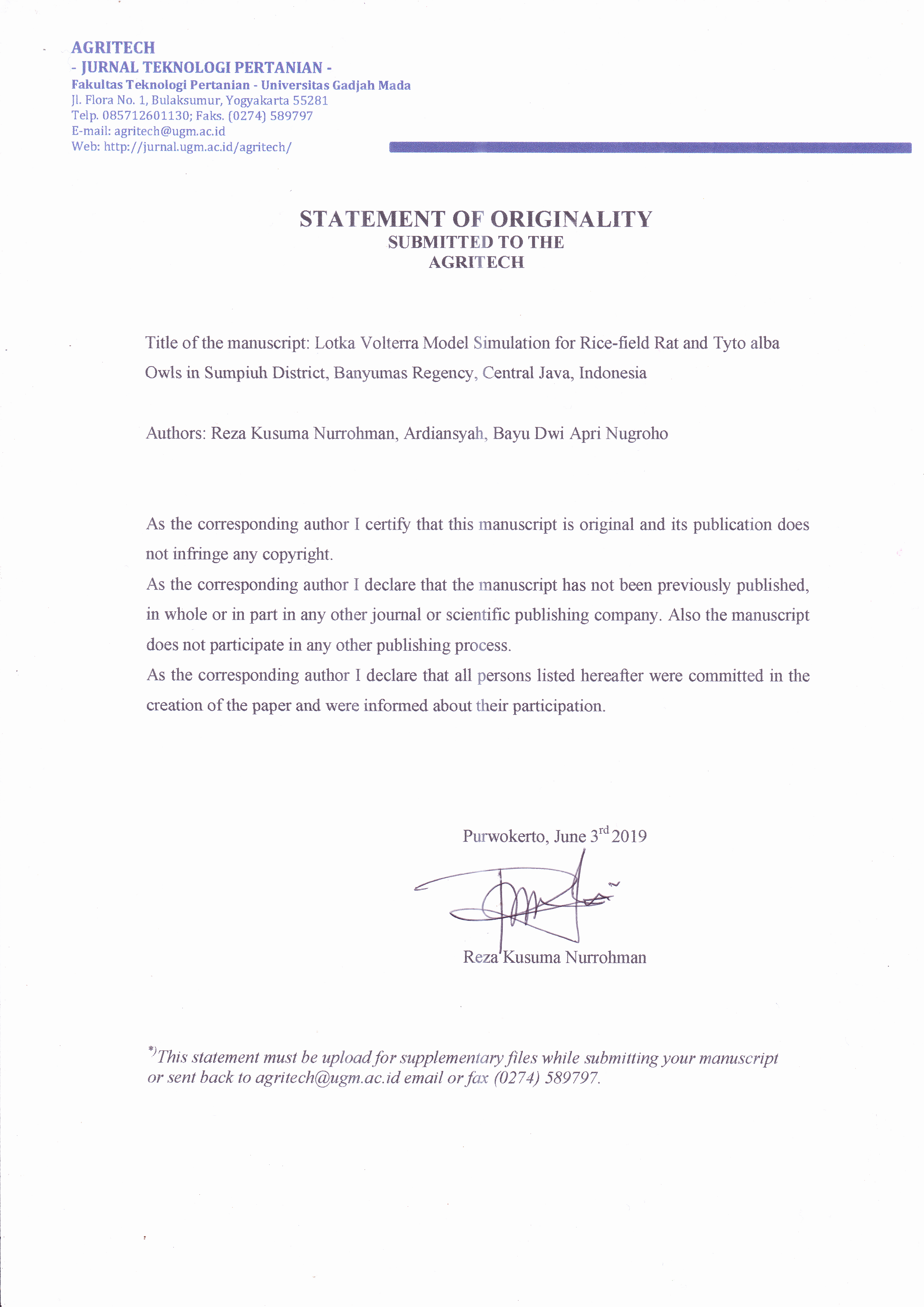 Rice-field rat (Rattus argentiventer) is a rodent that has a high level of productivity. These animals attack rice plants from the vegetative to the generative phase. This research aimed to analyze and to predict the accuracy of the use of owls with mathematical equations model in Kebokura and Lebeng villages, Sumpiuh district. Lotka - Volterra and Competitive Lotka-Volterra models were used to predict the population dynamics of Owl (predator) and rice-field rats (prey), then Runge - Kutta numerical method was applied to analyze the population dynamics of predator and prey at a certain time. The results of the analyses using the Lotka – Volterra, Competitive Lotka - Volterra equations and simulation data, each graph data showed that the rats’ population was able to be maximally suppressed. Based on the analysis result, started with 24 owls and 1,689 rats, the rats’ population could be suppressed to 104 using Lotka – Volterra, and to 176 using the Competitive Lotka – Volterra model. Then in the first and second simulation, started with 50 and 100 owls and 1,689 rats, analysis using Lotka – Volterra and Competitive Lotka – Volterra showed that the rat population could be suppressed to as much as 126, 188 and 145, 189, respectively. Based on the analysis, it could be concluded that use of Serak Jawa owl strategy was able to reduce and stabilize the rat populations. Furthermore, the higher population of owls can prevent the population explosion of rats and can suppress the rat population to a lower number.