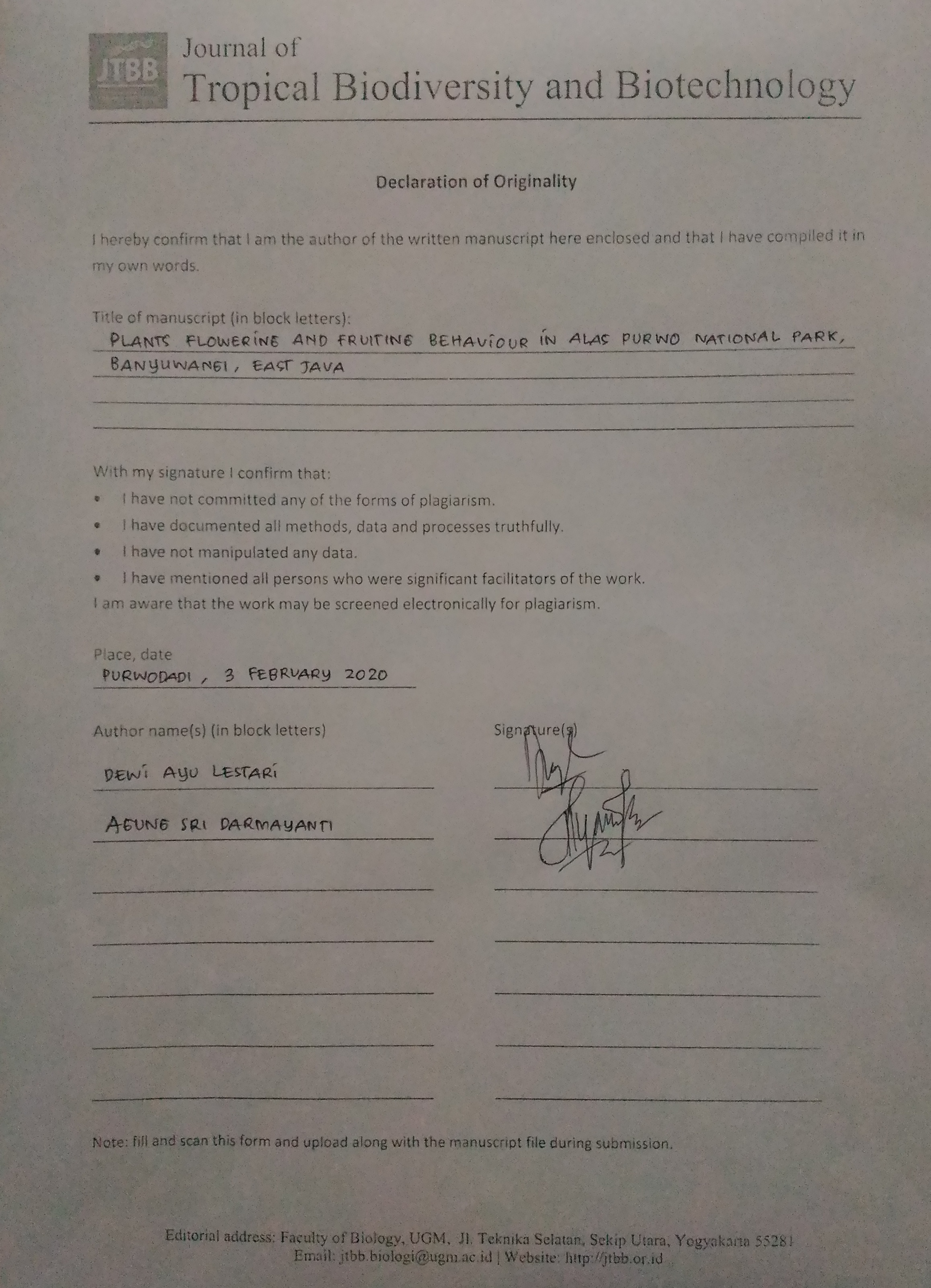 Alas Purwo National Park (APNP) is a conservation area with lowland forest type. The adaptation of plants conserved is strongly influenced by environmental factors and the behaviour of flowering and fruiting. The aims of this research were to find the number, species, dominance, and abundance of flowering and fruiting plants, comparison of flowering and fruiting species, and environmental factors affecting the flowering and fruiting time in APNP observation tracks. This study used purposive random sampling in each observation track where flowering and fruiting plants were found. Environmental factors (temperature, humidity, light intensity, soil pH, elevation, and coordinates) in each observation track were measured. Data analysis was conducted using Microsoft Excel and PAST 4.0. statistic program. The behaviour of flowering and fruiting plants species in APNP was unique. There were 90 species of flowering and fruiting plants in APNP from 45 families. Most species often found flowering and fruiting were Orophea enneandra, Polyalthia littoralis and Leea angulata which were scattered in Moto Lele, Patirtan Mas, and Sadengan Savanna. Fruiting plants species were more often found than flowering ones. Temperature and light intensity became the two most affecting environmental factors on flowering and fruiting plants behaviour. The study of flowering and fruiting behaviour is very important for genetic resources conservation and conservation areas management.