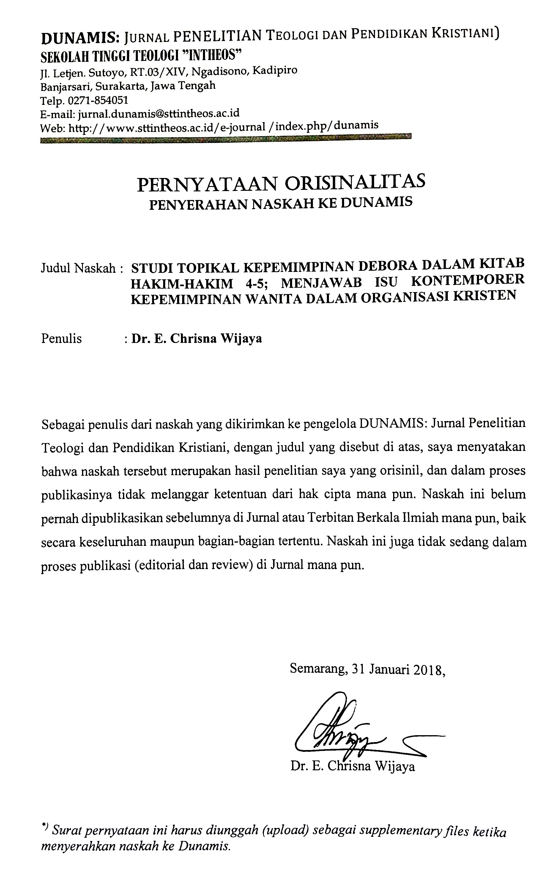 Abstract. The most dominant issue in contemporary leadership is gender issues. The position of men is considered more special than women. This view has led to the emergence of discriminatory practices against women, not least in the world of Christianity. The views of conservative theologians in relation to the realm of leadership are not so different from the above. The stereotype is often a strong reason for restricting or forbidding women to become leaders. Through this study, the author analyzes some important sections of the text from Judge 4-5 through the character analysis method, to answer the polemic and to the understanding that the effectiveness of a leader is not based on gender. Through this analysis the result is that there is no partiality to one gender in the election of a leader in the midst of God's people.Abstrak. Isu yang paling dominan dalam kepemimpinan kontemporer adalah isu gender. Kedudukan laki-laki dipandang lebih istimewa dibandingkan perempuan. Pandangan tersebut menyebabkan munculnya praktik diskriminasi terhadap kaum perempuan, tidak terkecuali dalam dunia Kekristenan. Pandangan para teolog konservatif sehubungan dengan ranah kepemimpinan, tidak berbeda jauh dengan pandangan tersebut di atas. Stereotype tersebut seringkali menjadi alasan yang kuat untuk membatasi atau melarang wanita untuk menjadi pemimpin. Melalui penelitian ini, penulis menganalisis beberapa bagian teks yang penting dari Kitab Hakim-hakim 4-5 melalui metode analisis tokoh, untuk menjawab polemik tersebut dan pemahaman bahwa keefektifan seorang pemimpin, tidak berdasarkan pada gender. Melalui analisis tersebut diperoleh hasil bahwa tidak ada keberpihakan terhadap satu gender dalam terpilihnya seorang pemimpin di tengah-tengah umat Allah.