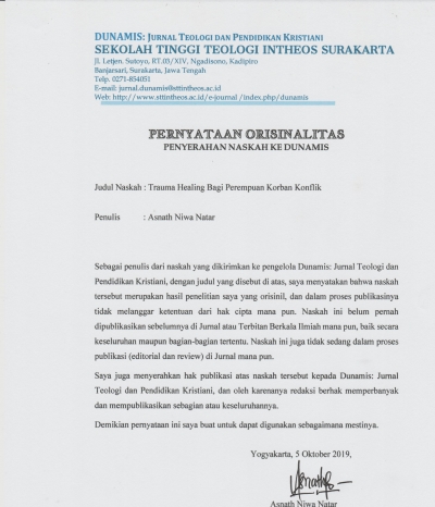 Abstract. Conflicts that often occur in Indonesia claimed many victims. Among these victims, women were the largest impacted. They were not only being victims of violence and physicaly lost, but also experienced in psychological trauma. But this traumatic problem was hardly overcome by so it must be stayed and at the end would be choked the survival. This article aimed to discuss trauma healing efforts for women who are conflict impacted through literature study methods. Through this study it was concluded that giving opportunities for women conflict victims to tell their stories and experiences were the effective trauma healing efforts to heal the wounds they experienced.Abstrak. Konflik sering terjadi dalam kehidupan berbangsa dan bermasyarakat di Indonesia yang merengkut banyak korban. Di antara korban-korban tersebut perempuan mengalami dampak yang paling besar. Mereka bukan hanya menjadi korban kekerasan dan kerugian secara fisik, namun juga secara psikis, termasuk mengalami trauma. Namun masalah traumatis ini jarang mendapatkan penanganan sehingga menjadi menetap dan pada akhirnya menghambat pertumbuhan hidup selanjutnya. Artikel ini bertujuan untuk mengkaji upaya trauma healing bagi perempuan korban konflik melalui metode studi pustaka. Melalui kajian tersebut ditarik kesimpulan bahwa memberi kesempatan perempuan korban konflik untuk mengungkapkan kisah dan pengalamannya adalah upaya trauma healing yang efektif untuk menyembuhkan luka-luka yang mereka alami.