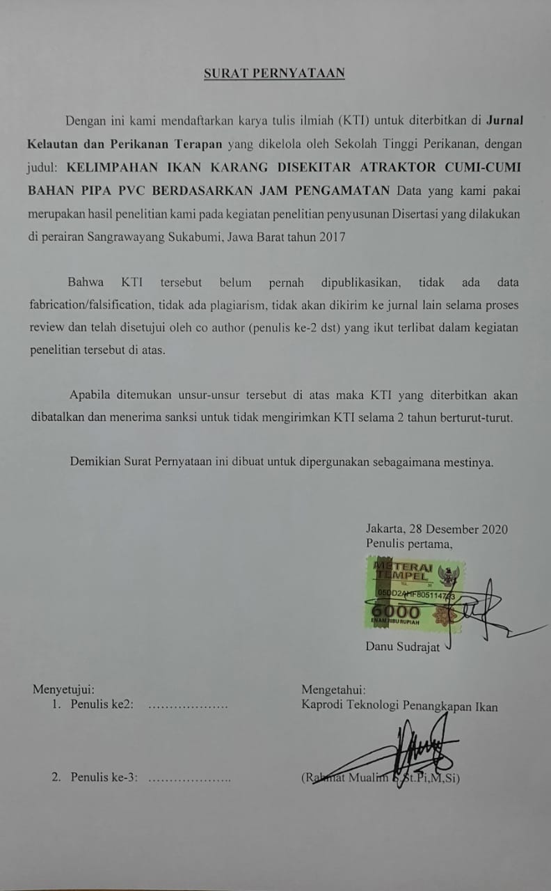 Atraktor cumi-cumi yang telah memberikan manfaat pada sektor perikanan, akan tetapi perlu dilakukan rekayasa teknologi sehingga memungkinkan manfaat yang diberikan dapat berlangsung lama dan memberikan dampak yang lebih signifikan terhadap sektor perikanan. Tujuan penelitian ini adalah fungsi atraktor cumi-cumi berbahan pipa PVC sebagai artificial reef berdasarkan jam pengamatan dan mengetahui kelimpahan ikan karang pada atraktor cumi-cumi pada setiap jam pengamatan. Penelitian ini menggunakan atraktor pada bagian atas dan sisi kiri dan kanannya diberi penutup jaring waring PE 40. Metode pengumpulan data ikan yang berada pada atraktor cumi-cumi menggunakan metode sensus visual (Visual Census Method) dengan menggunakan Underwater cam “SENU”, yang disimpan dalam Digital Video Recorder (DVR). Hasil di dalam DVR inilah yang selanjutnya akan dilakukan perhitungan jumlah ikan pada atraktor cumi-cumi. Individu yang diamati adalah yang berada di dalam dan di sekitar atraktor cumi-cumi dalam setiap jamnya, dengan jarak terluar yang diamati dari atraktor cumi-cumi sekitar 50 cm. Atraktor pipa VPC dapat menjadi terumbu karang buatan. Atraktor cumi-cumi mempunyai nilai indeks keanekaragaman (H') termasuk keanekaragaman tinggi, indeks keragaman (E) menunjukan komunitas stabil dan indeks dominasi (C) termasuk dominasi rendah.